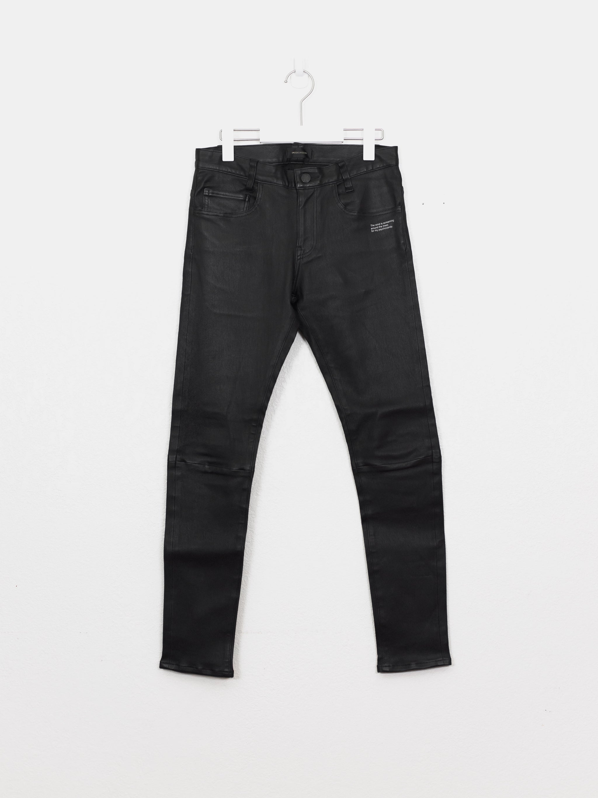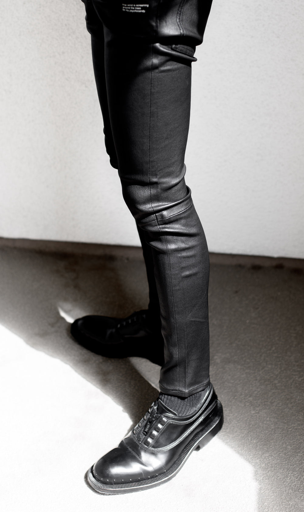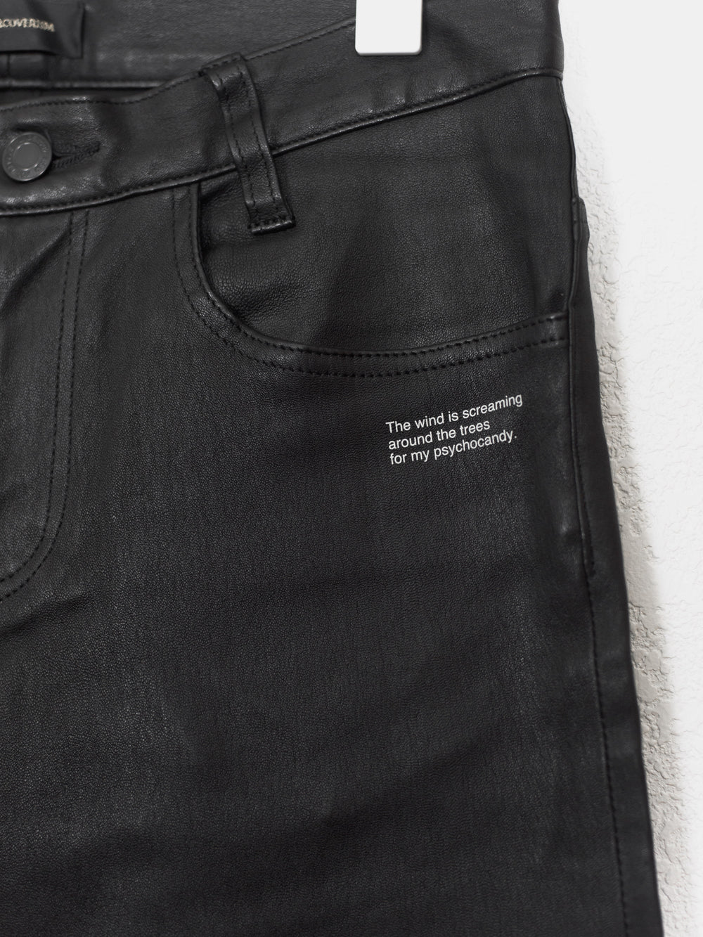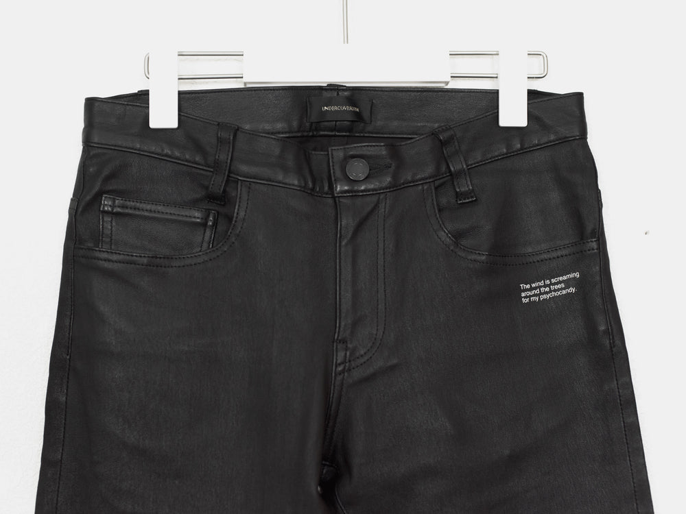 Extremely supple lamb leather jeans featuring the iconic Psychocandy quote printed on the hip in one of the most iconic seasons of Undercover.