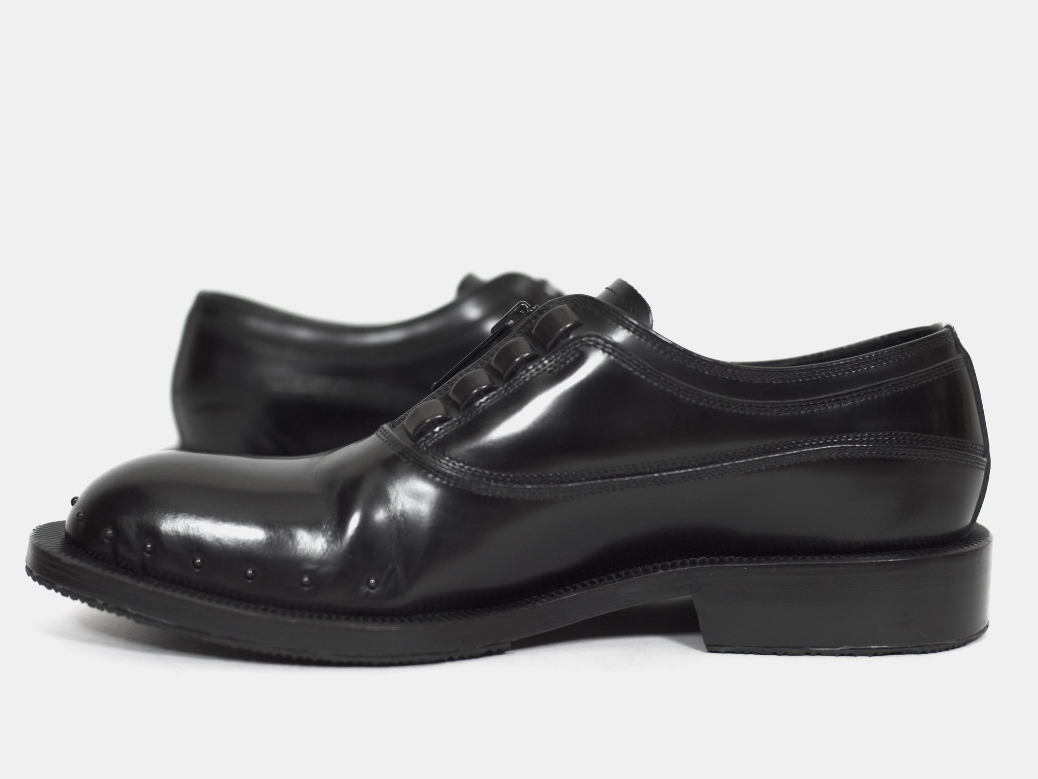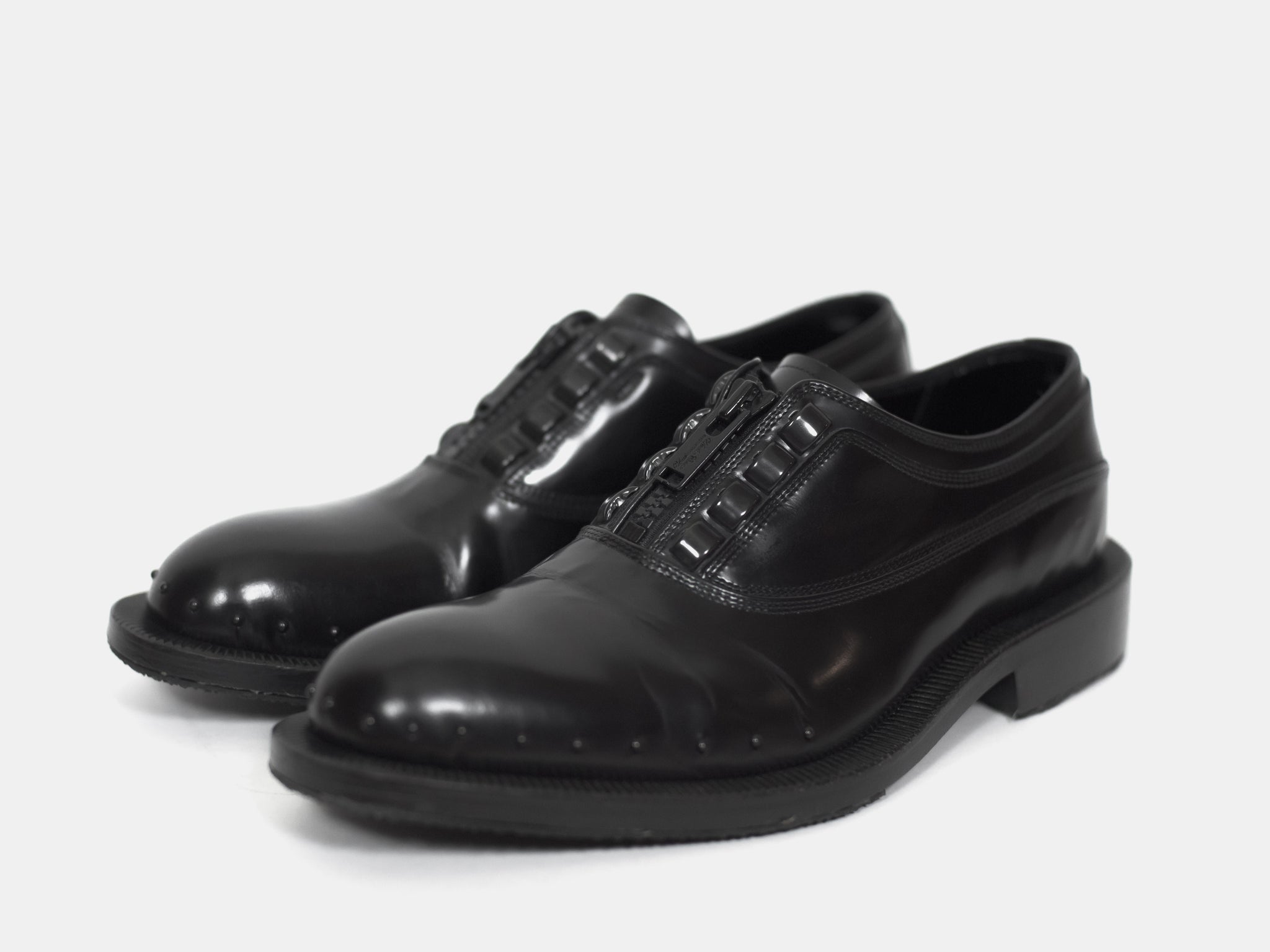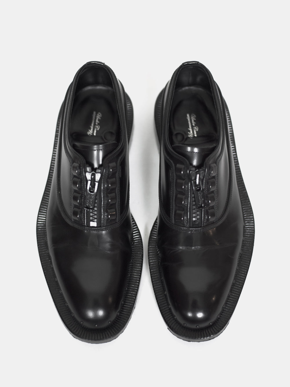 Amazing derbies with a sleek silhouette complemented by a high shine patent leather finish. In place of laces are Undercover embossed zippers providing both a streamlined finish as well as ease of wear.