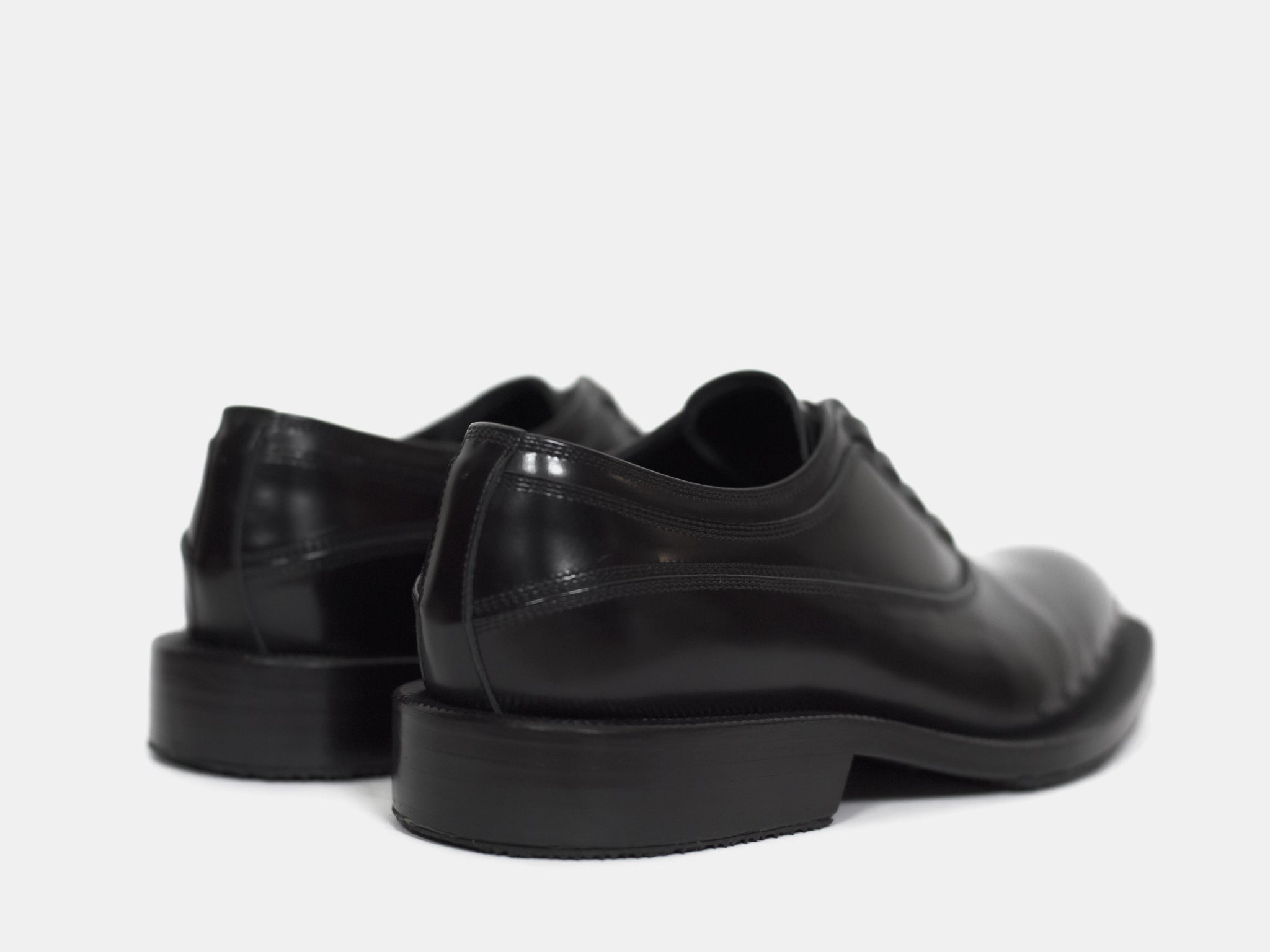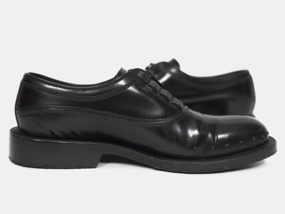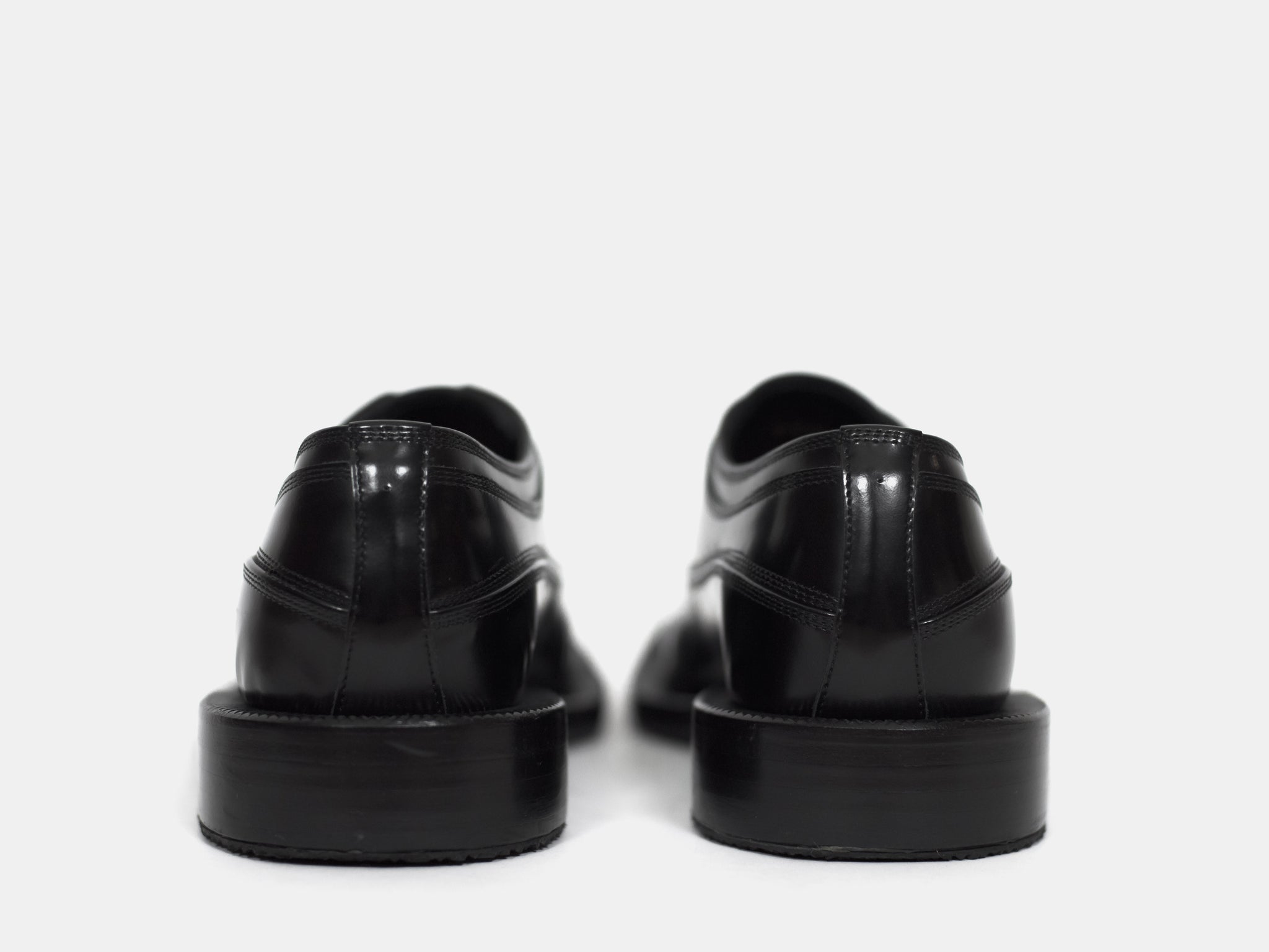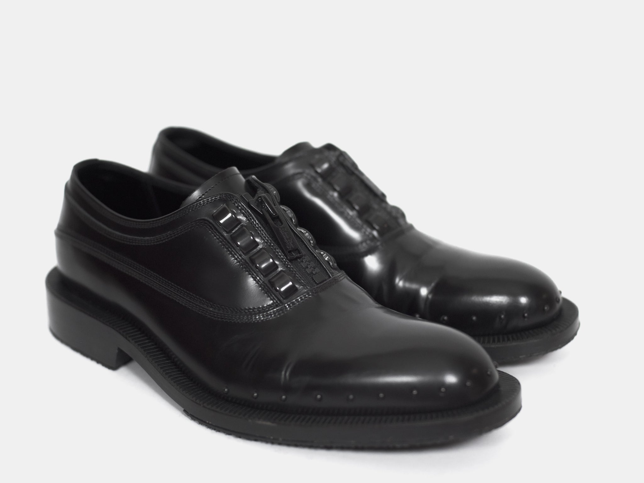 Amazing derbies with a sleek silhouette complemented by a high shine patent leather finish. In place of laces are Undercover embossed zippers providing both a streamlined finish as well as ease of wear.