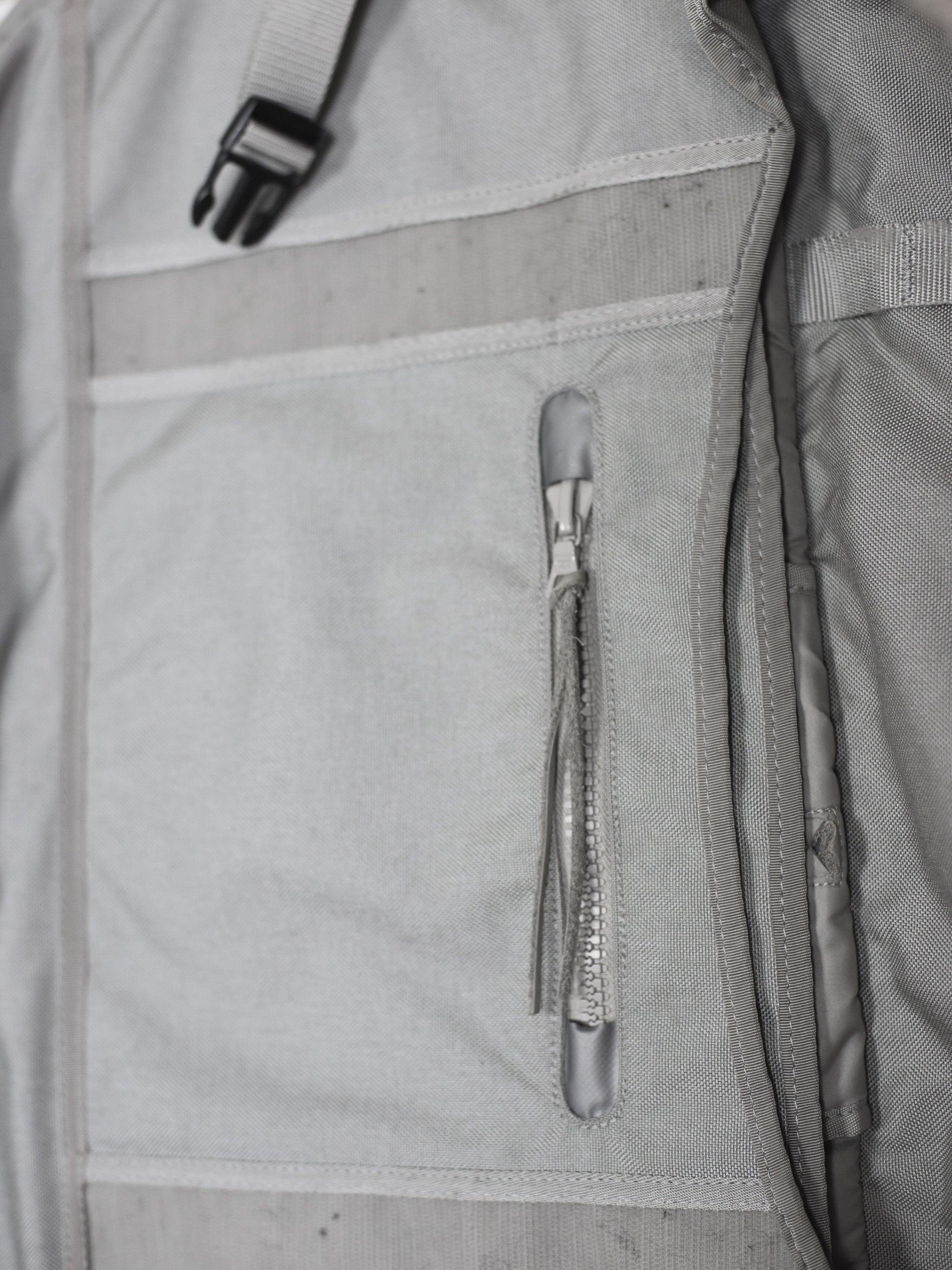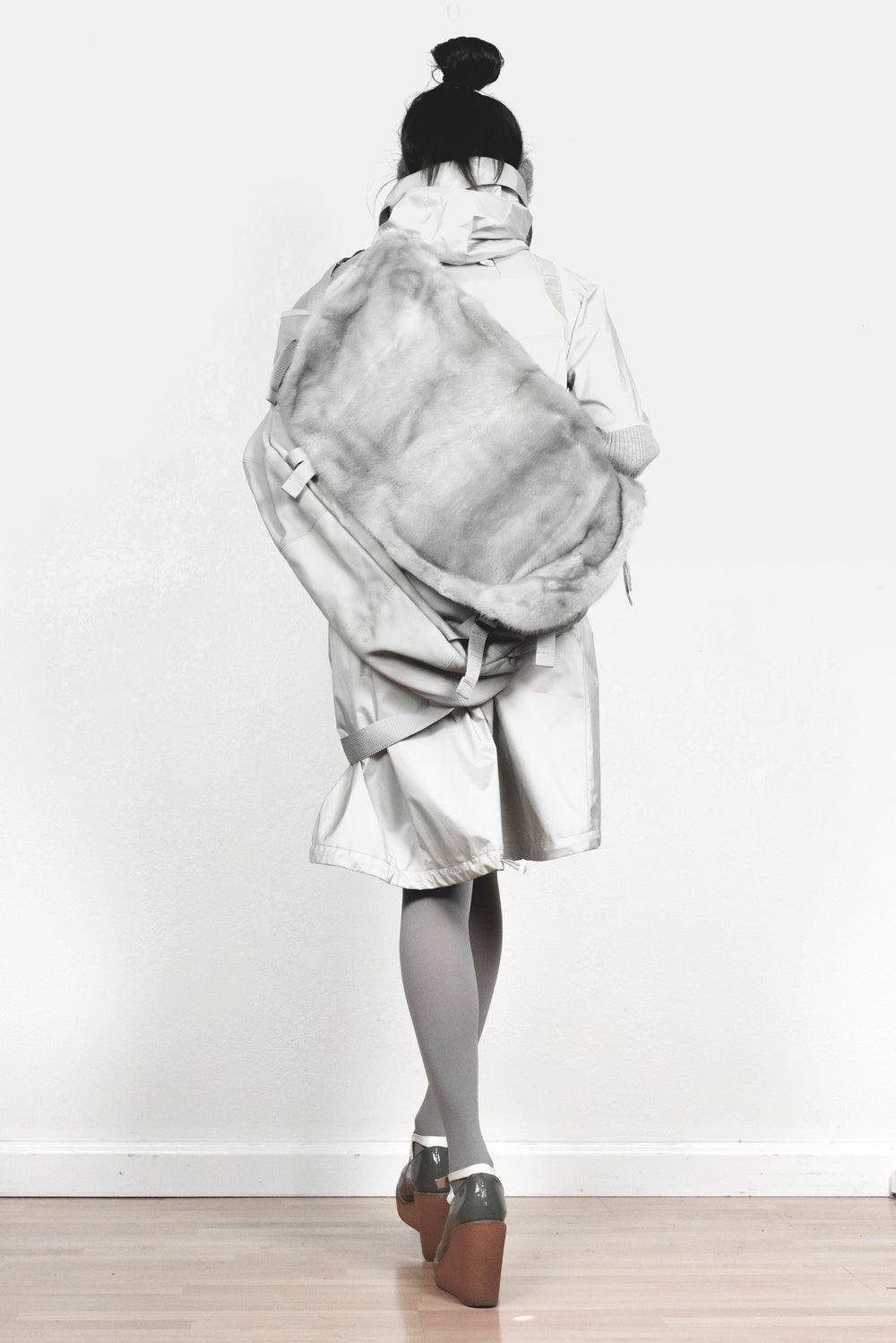 The highlight accessory of AW07 touching on all of the details of the season that established Jun Takahashi as a mastermind of creating fantasy worlds with a rebellious spirit through the unusual combination of technical and traditional winter wear in a futuristic theme. The heavy cordura bag is finished with extremely supple leather and Kopenhagen Platinum mink, one of the best grades available. The incredible contrast exemplifies Jun's exploration of traditional yet unconventional use of winter materials. In addition to two main compartments, details include a neoprene padded laptop pocket and two small compartments all secured by Riri zippers with leather pulls, and numerous stabilizer straps with polished metal hardware.