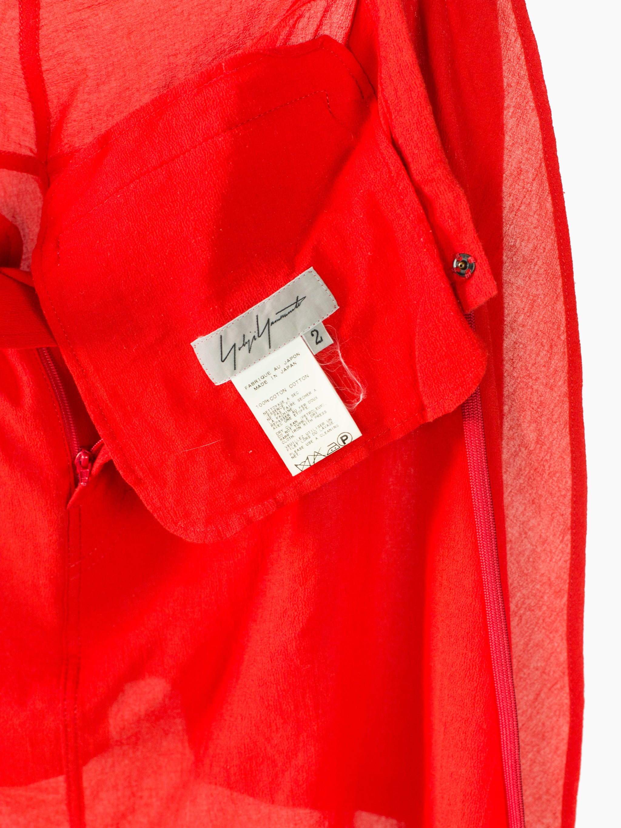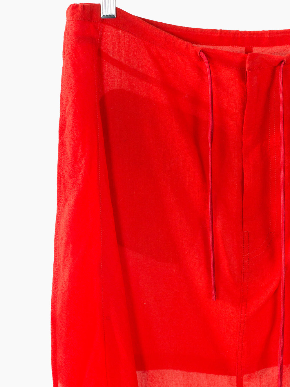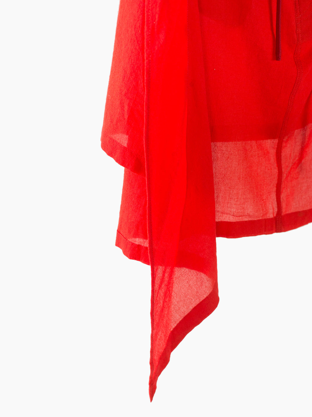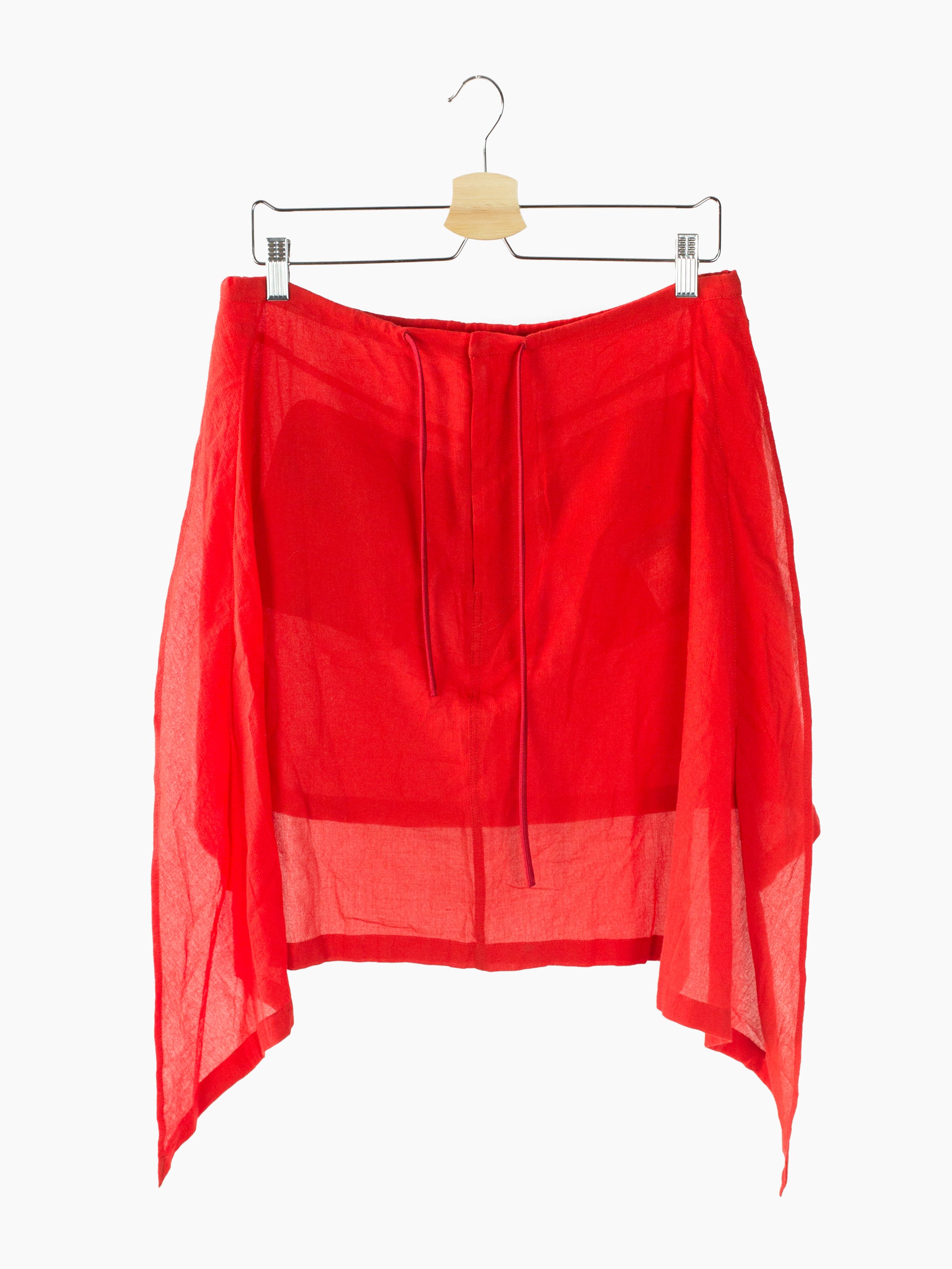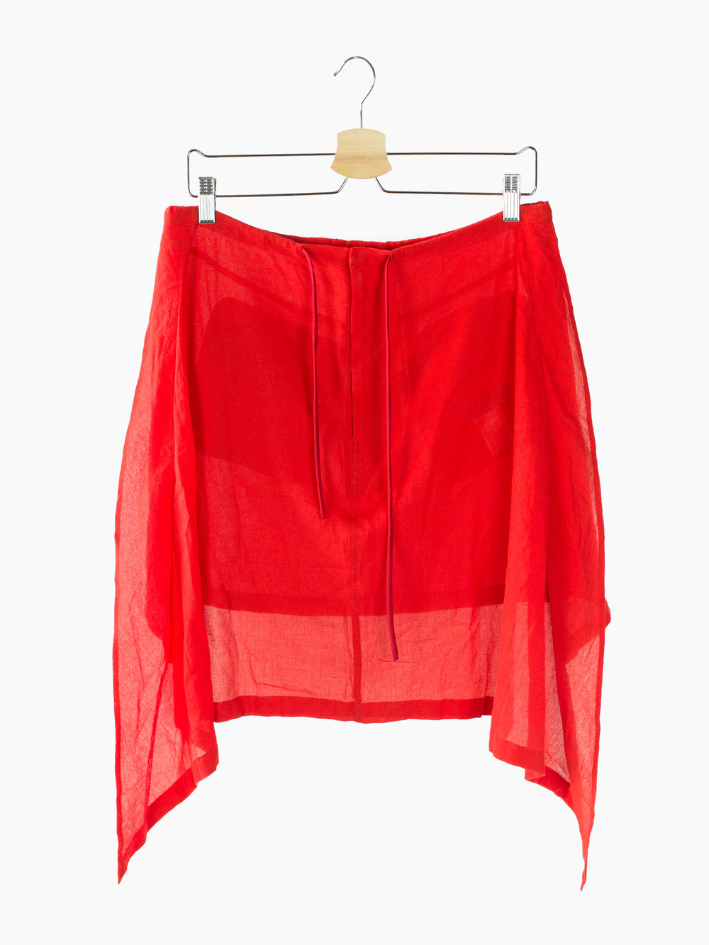 Lightweight cotton crepe skirt from mainline Yohji yamamoto, featuring a longer front with draped side fin panels and shorter back with functional welt pockets and yoke detail. Finished with sewn snap waist closure and zipper fly as well as integrated drawstring waist adjustment. Functions well both standalone and as a layering piece.