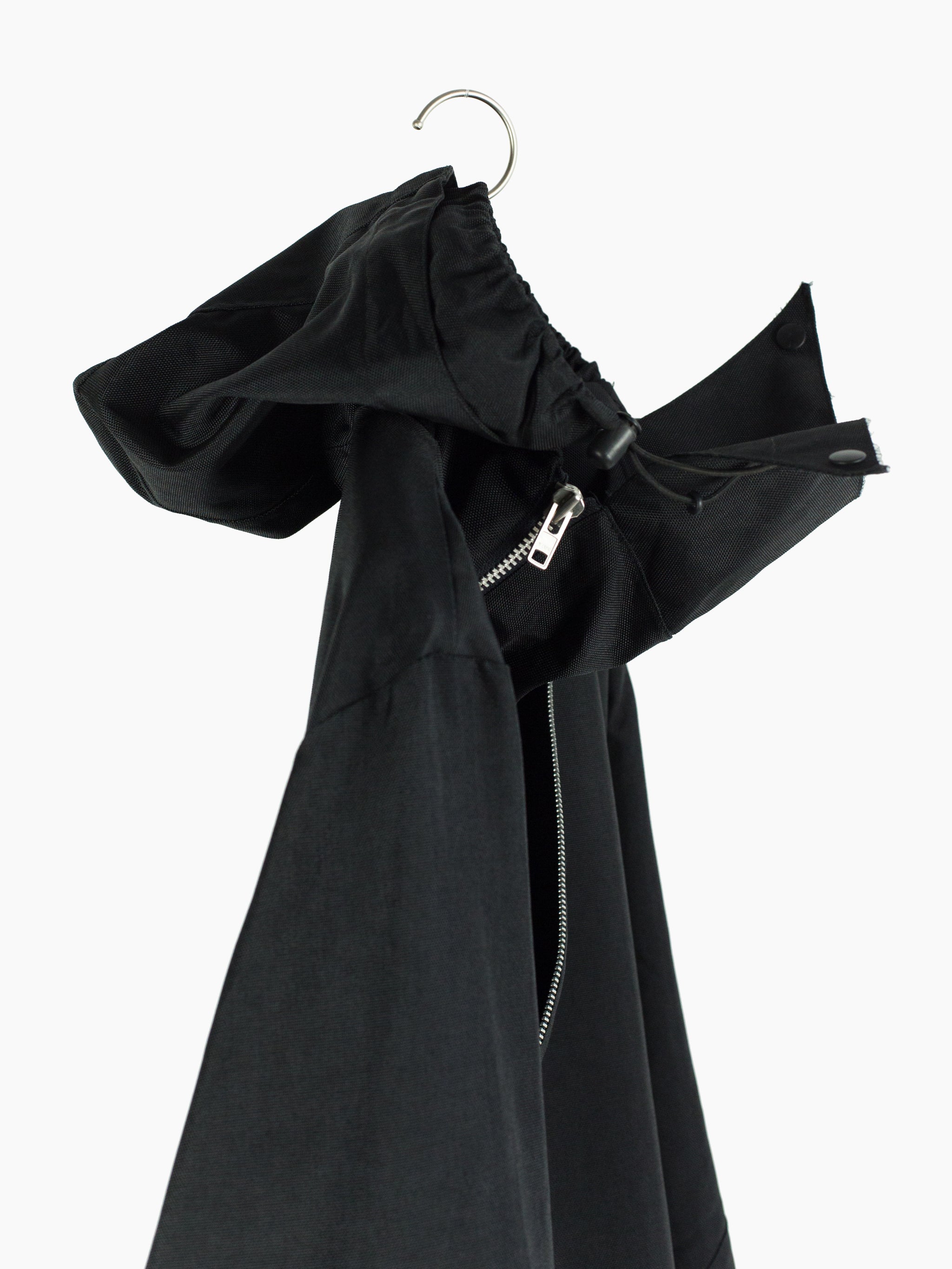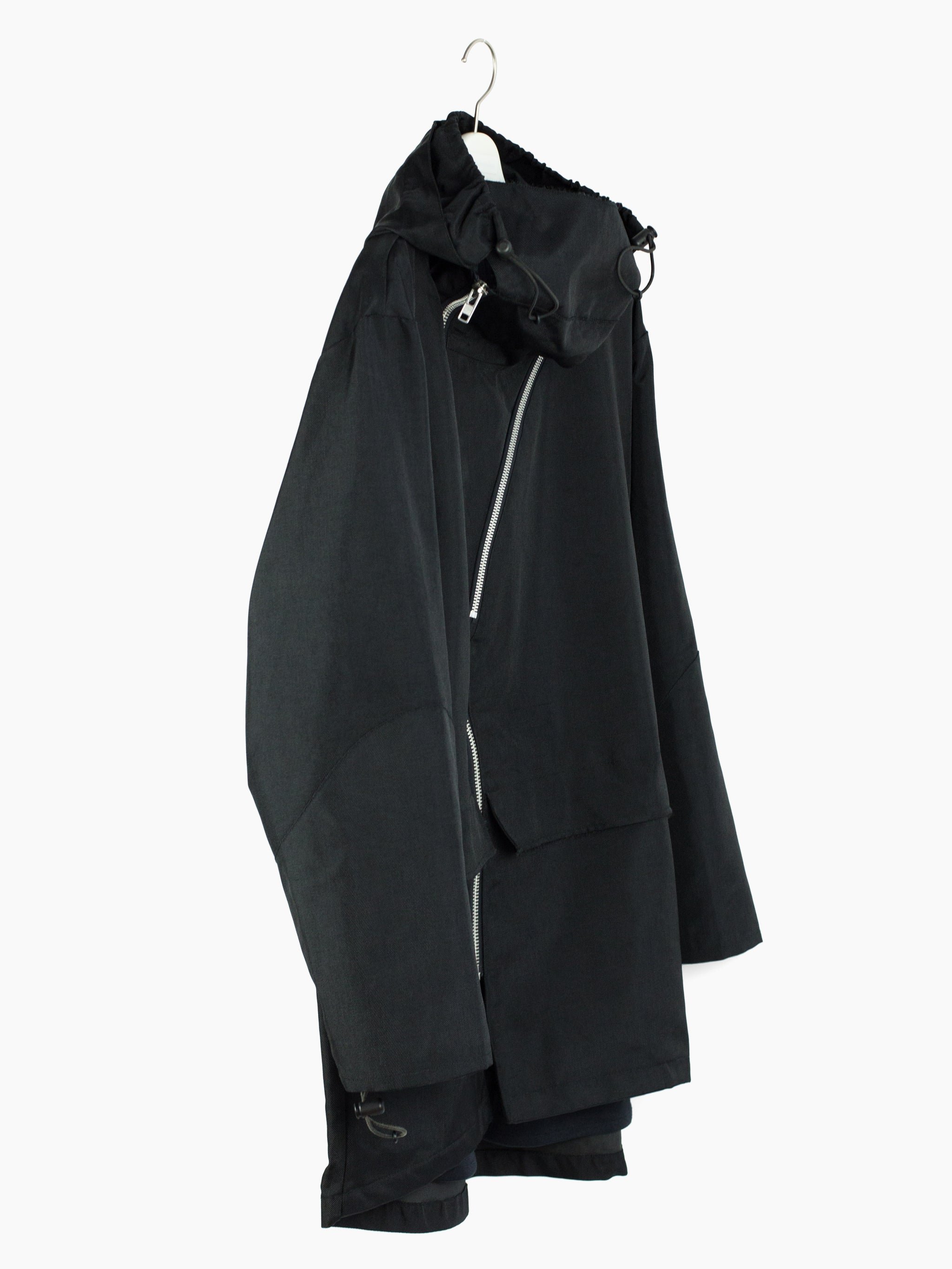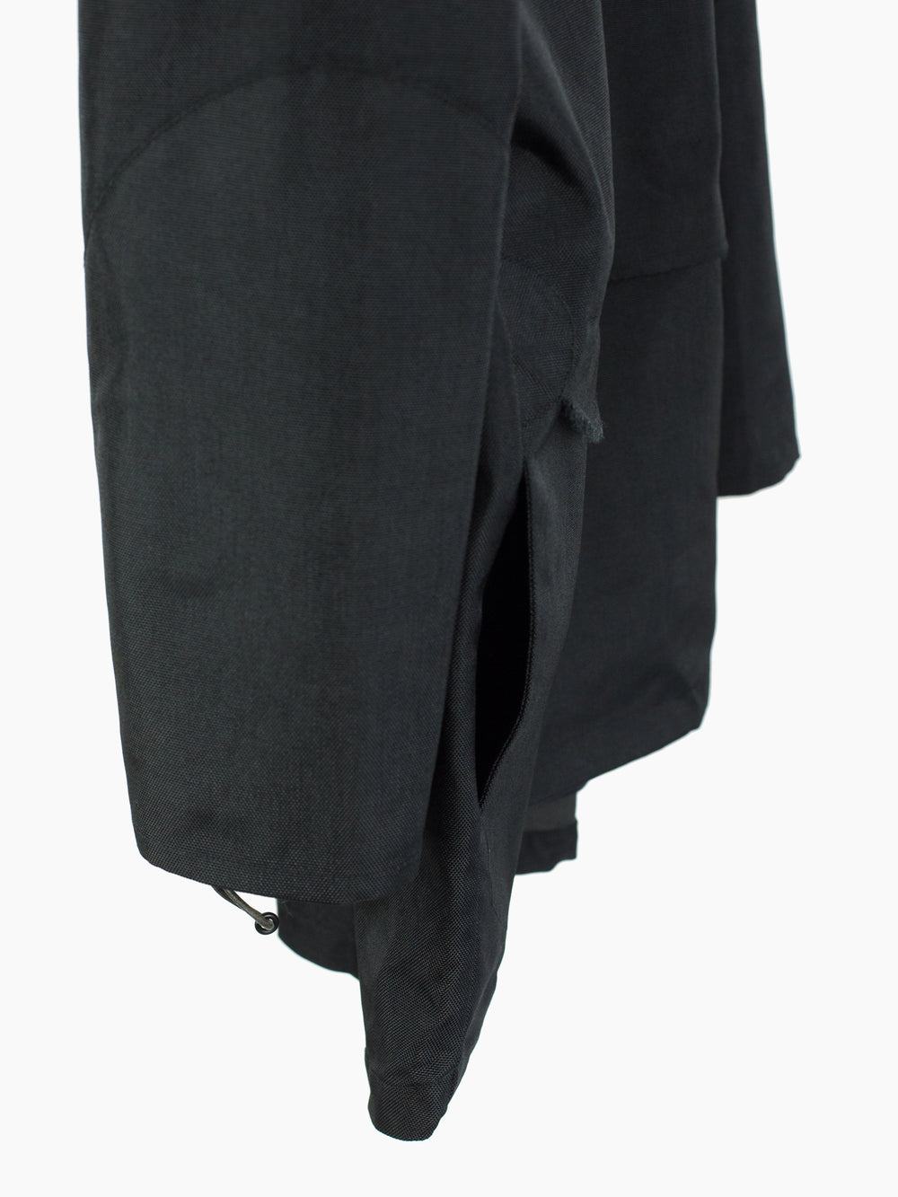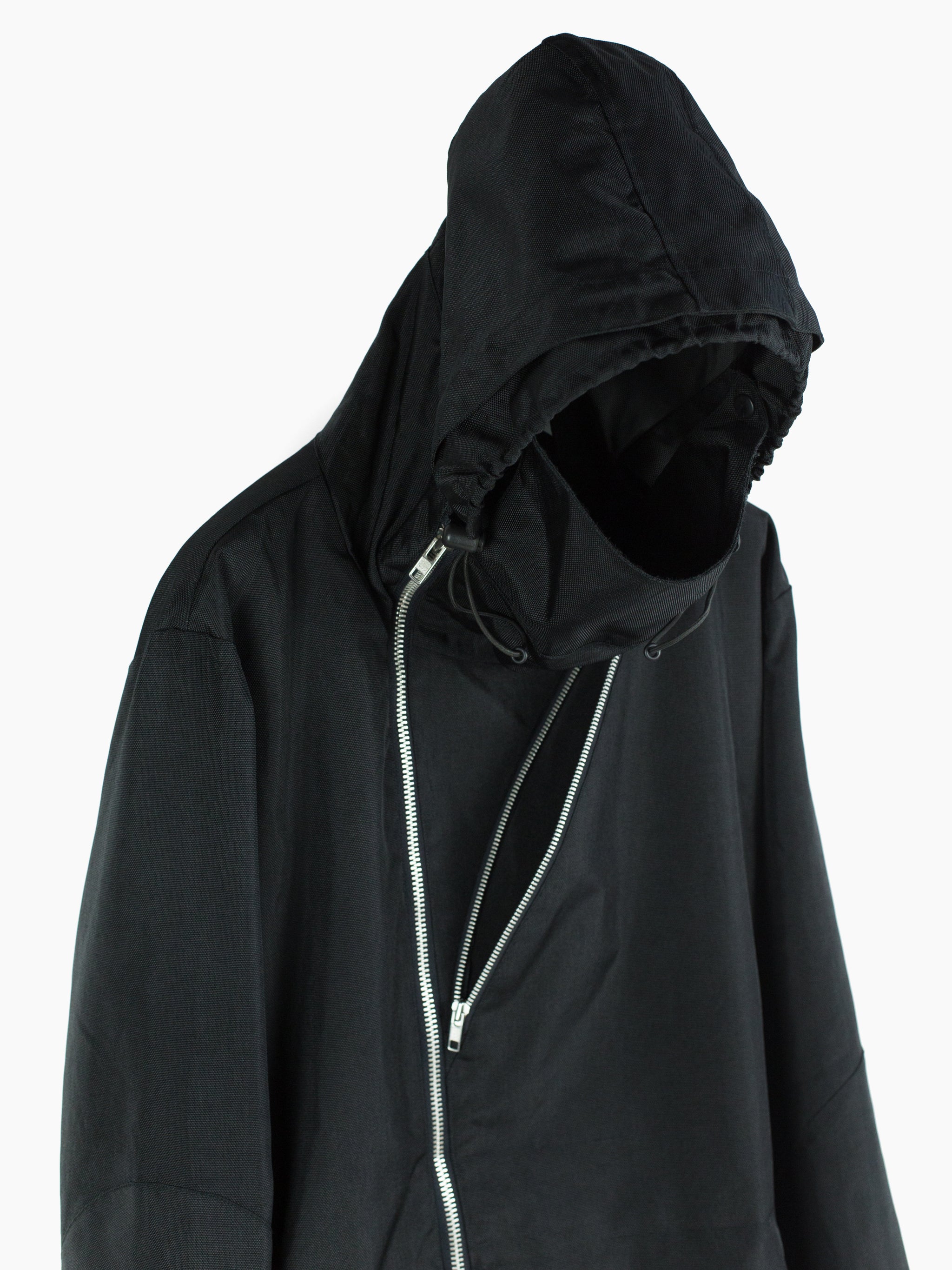 Black Technical Parka from 90s-2000s Yohji sublabel D'urban AAR. A behemoth coat of armor rendered in abrasion-resistant, fire-resistant, weather-resistant PU coated Ballistic Kevlar. This parka features an asymmetrical front with the zipper closure offset to one side, making room for a dramatic cross-chest zippered front pocket that opens to an enormous front pocket. Below it, at the waist, sits an array of top-entry flap-closed dump pockets with on-seam side entry waist pockets hidden behind. Sleeves feature layered double face fabric below the elbow with shockcord cinch at the underlayer. The statement layered hood is constructed with a voluminous, articulated collar that can accommodate other scarves, hoods, etc. underneath and features a snap-detachable faceguard for an incognito profile.