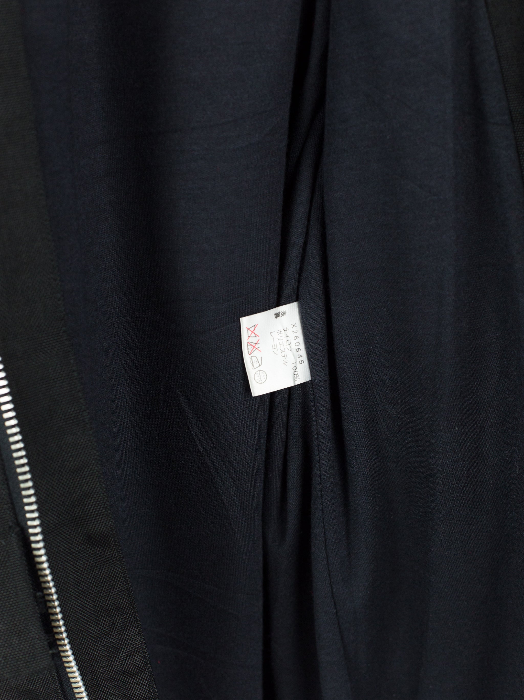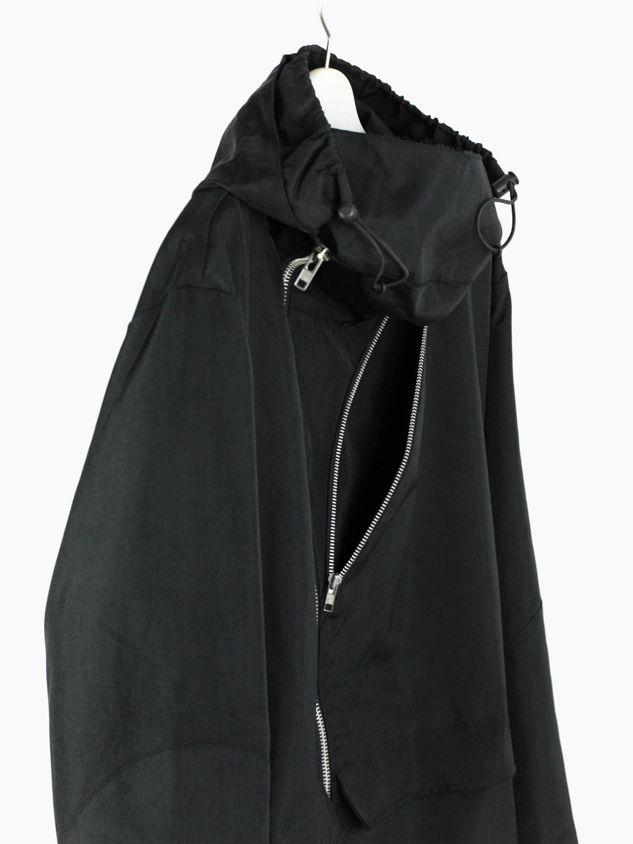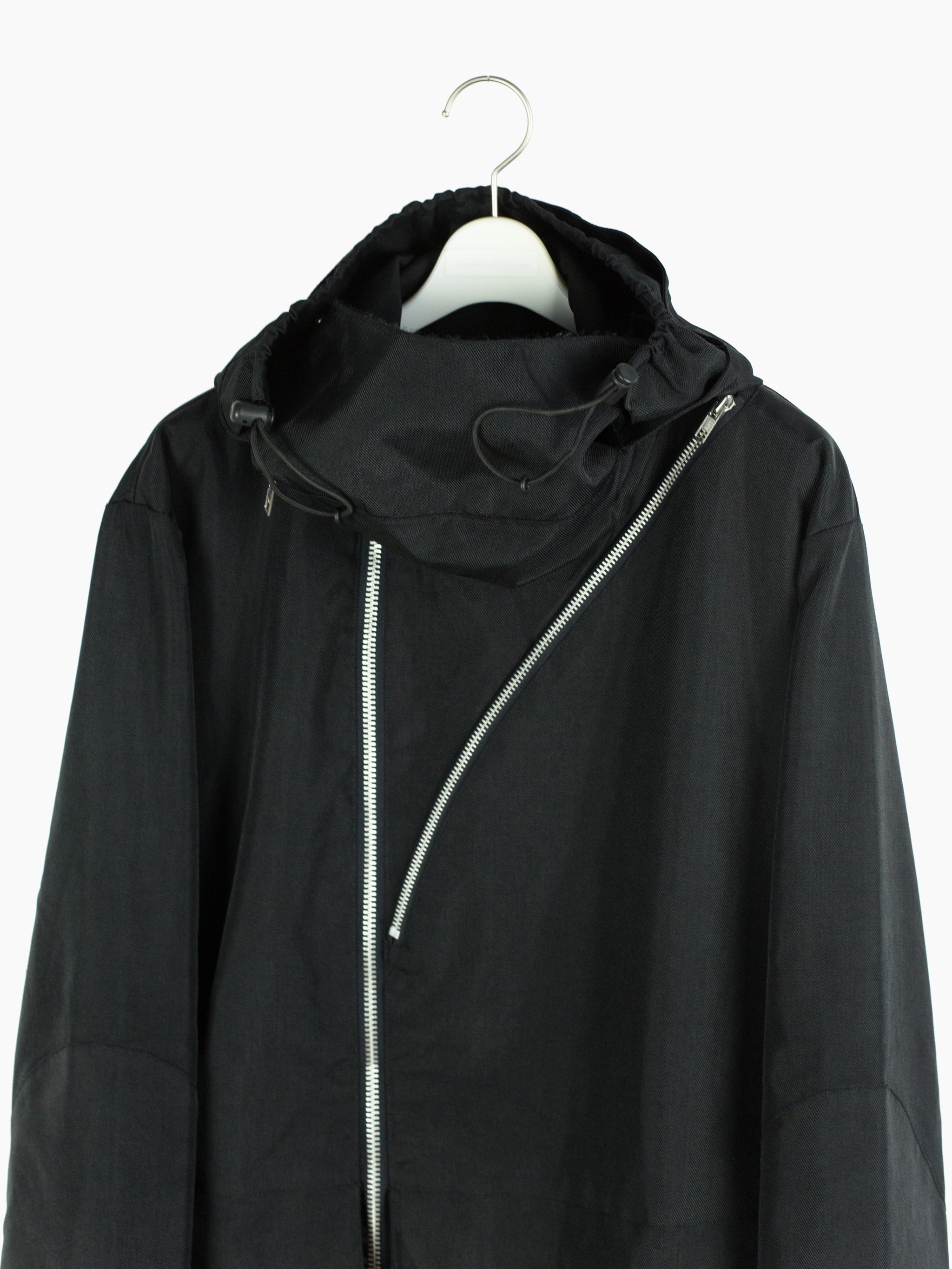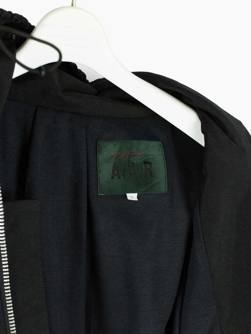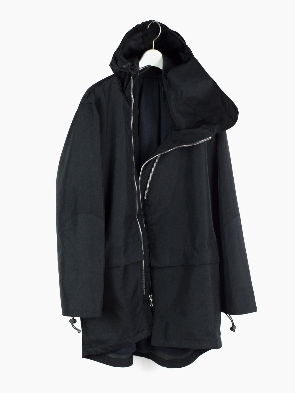 Black Technical Parka from 90s-2000s Yohji sublabel D'urban AAR. A behemoth coat of armor rendered in abrasion-resistant, fire-resistant, weather-resistant PU coated Ballistic Kevlar. This parka features an asymmetrical front with the zipper closure offset to one side, making room for a dramatic cross-chest zippered front pocket that opens to an enormous front pocket. Below it, at the waist, sits an array of top-entry flap-closed dump pockets with on-seam side entry waist pockets hidden behind. Sleeves feature layered double face fabric below the elbow with shockcord cinch at the underlayer. The statement layered hood is constructed with a voluminous, articulated collar that can accommodate other scarves, hoods, etc. underneath and features a snap-detachable faceguard for an incognito profile.