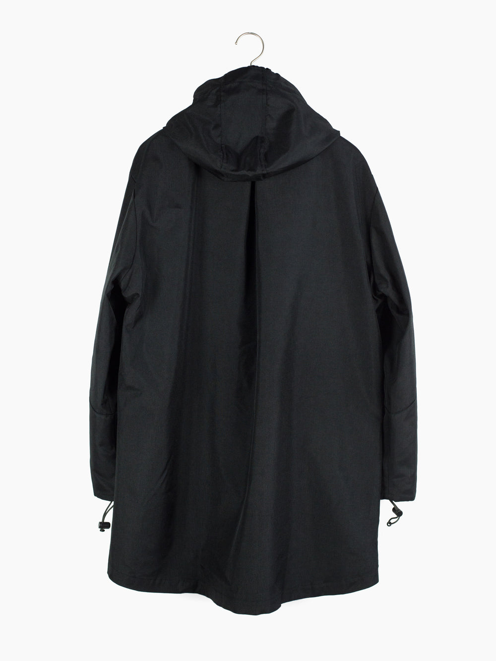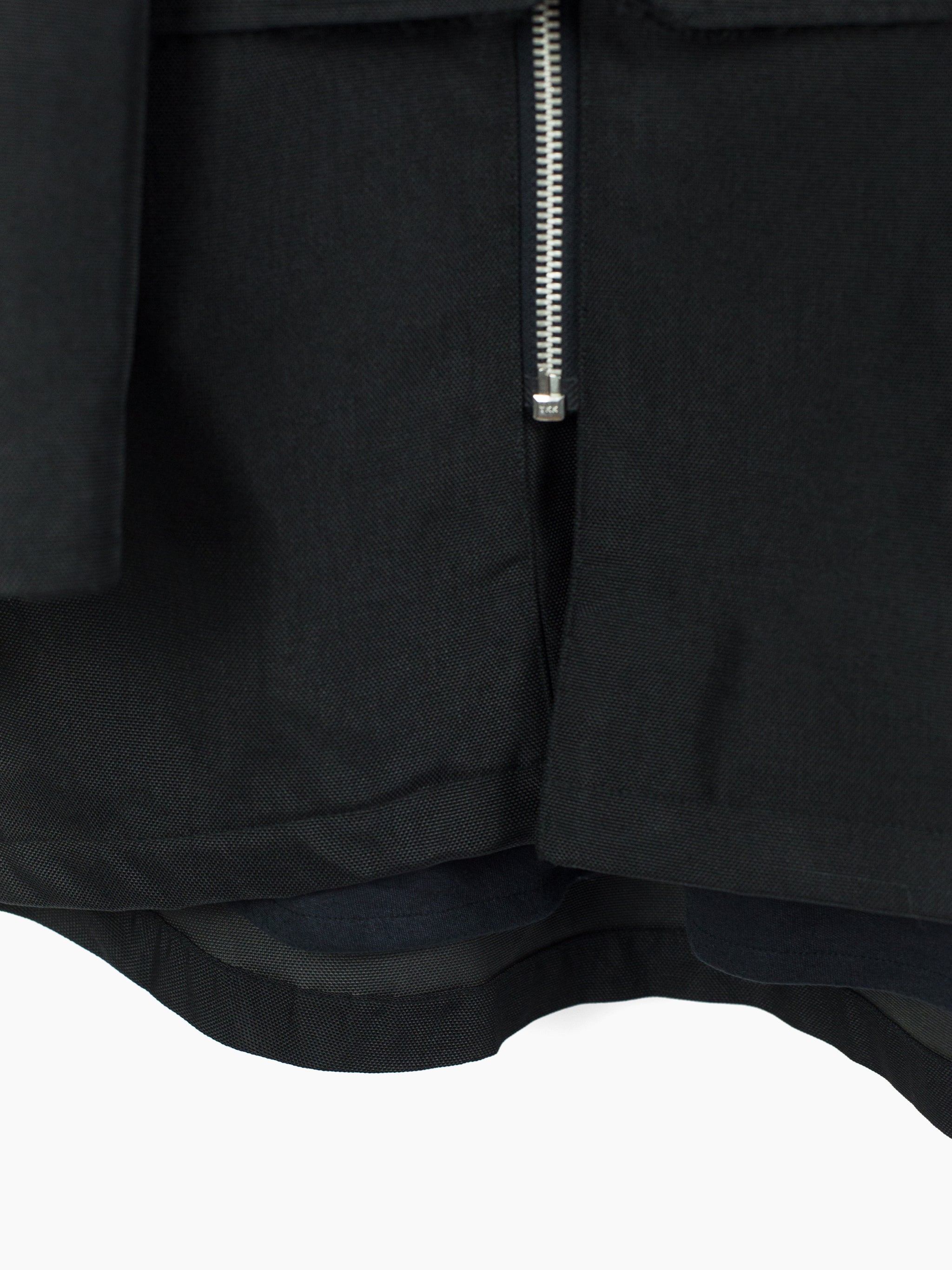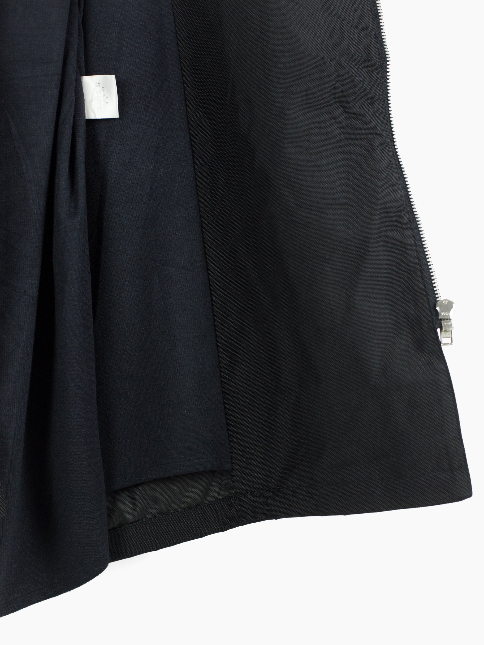 The whole thing is lined in a technical jersey for next-to-skin comfort, a welcome design choice considering the rugged structure of the ballistic Kevlar face fabric. Finished with high back single pleat for cape-like A-line silhouette.