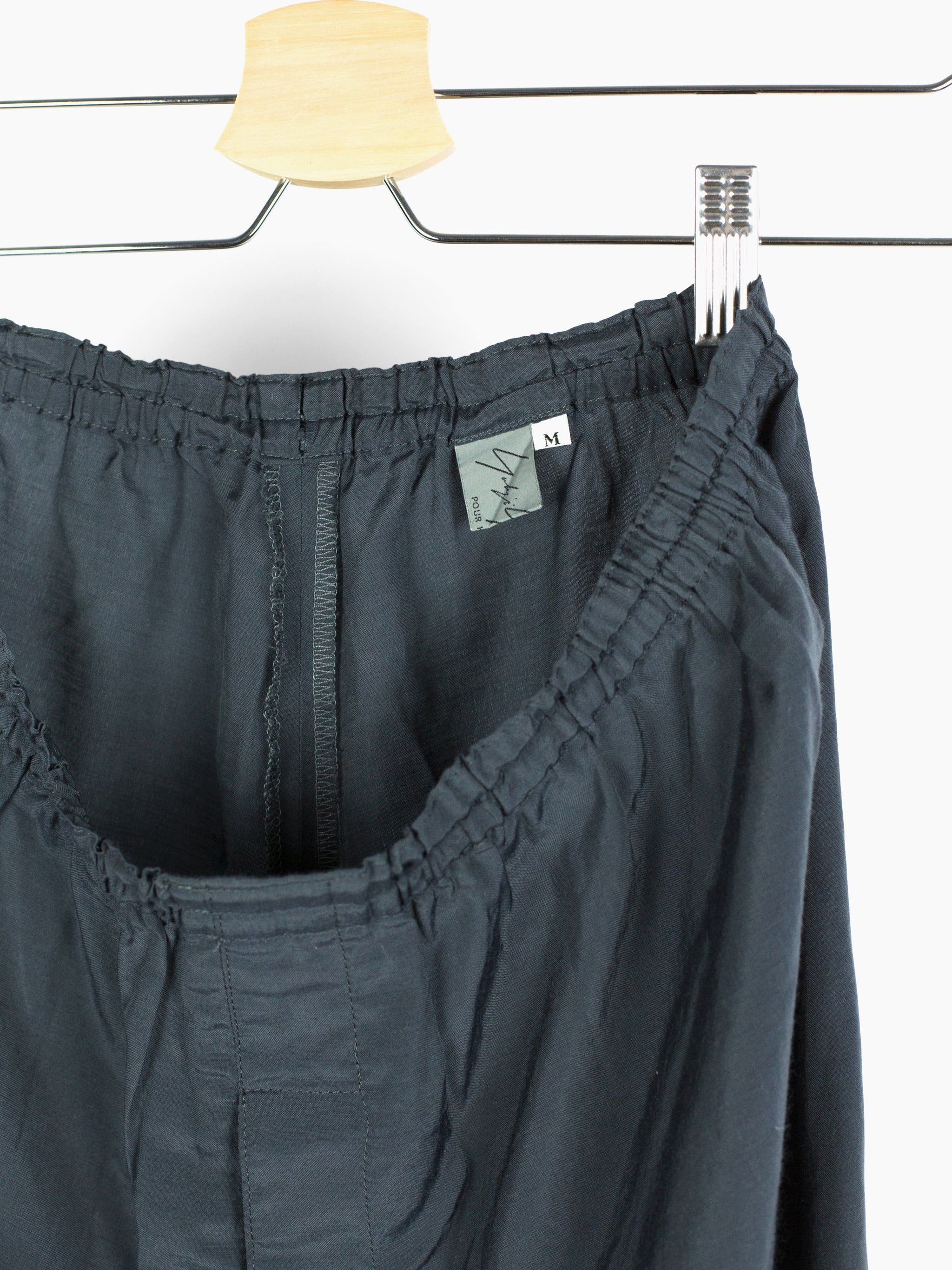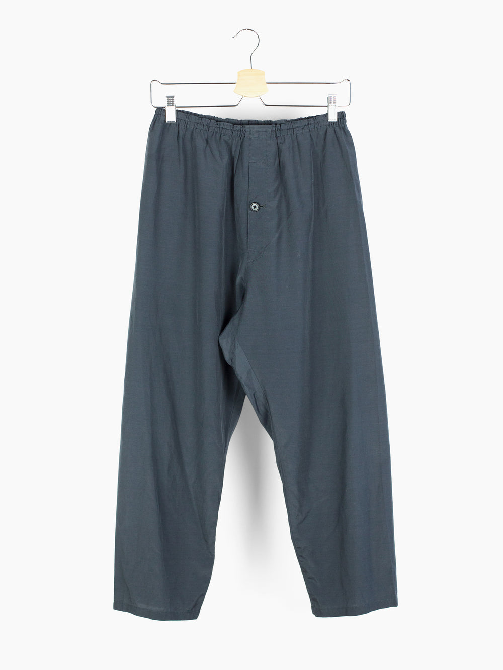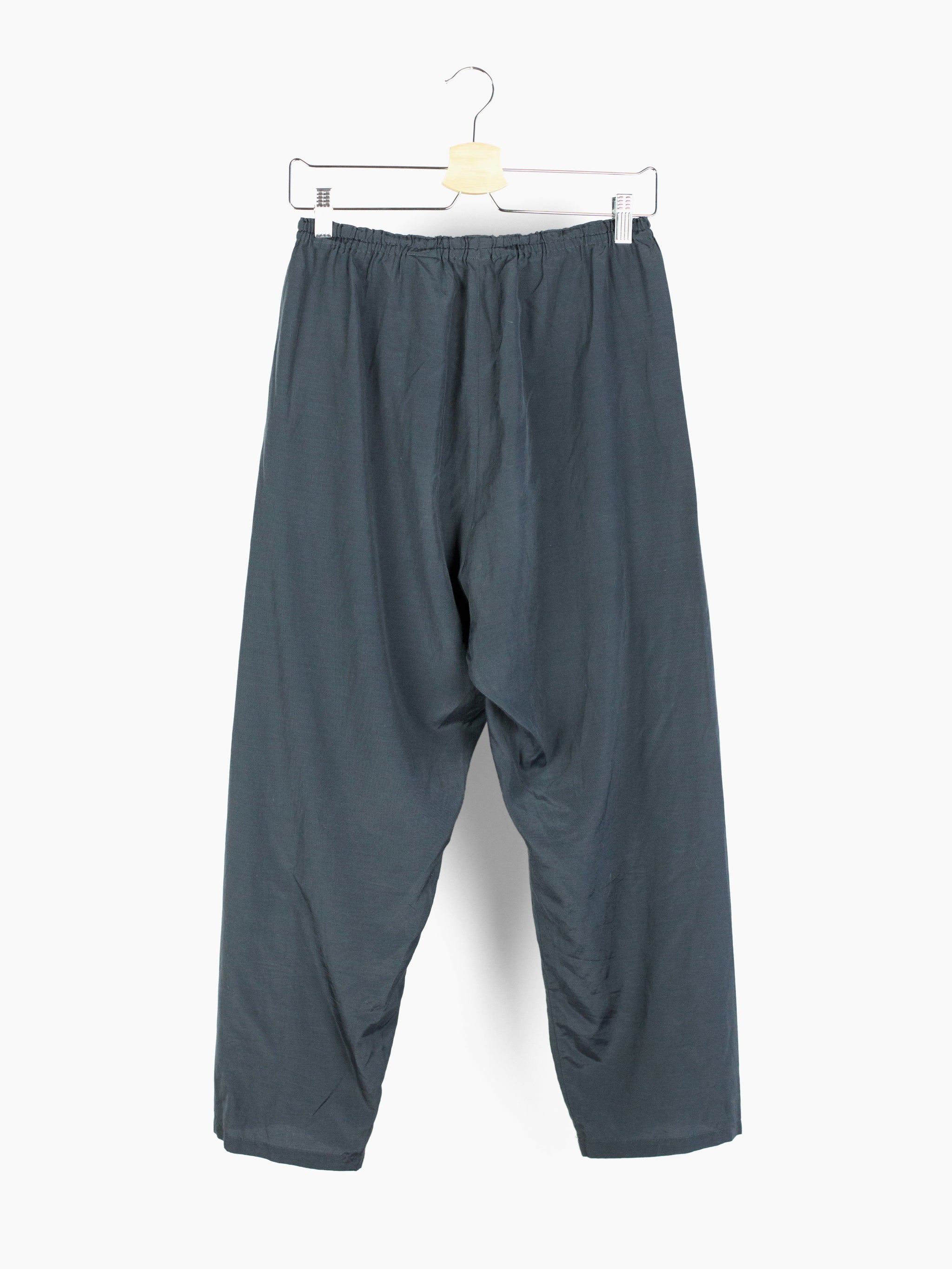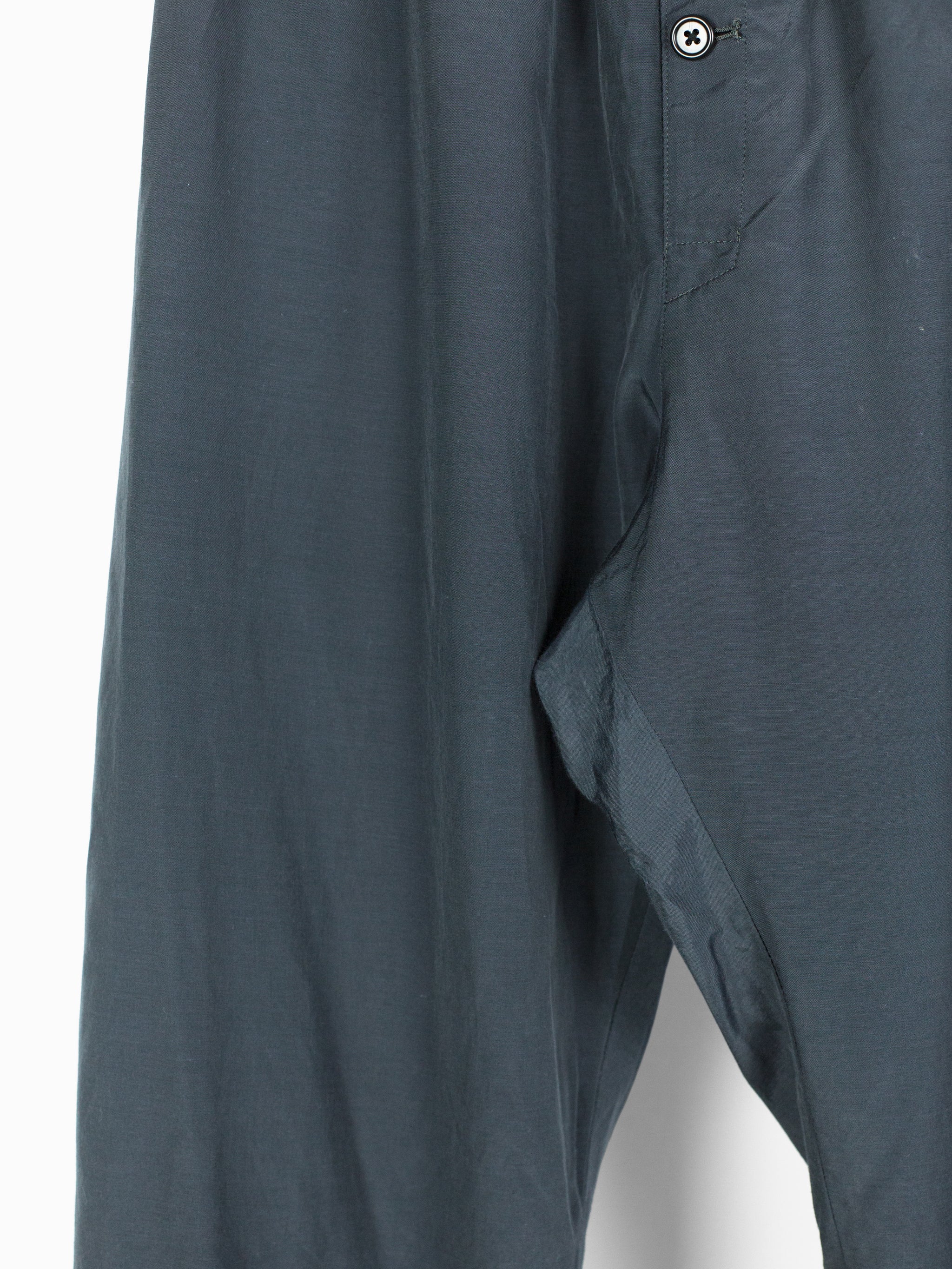 Minimalist easy pants from Yohji Yamamoto Pour Homme, made with comfort in mind. The stripped back detailing and breezy light weight of these pants actually opens up a wealth of styling and layering possibilities. With reduced bulk achieved by a no-outseam construction and no pockets, they are perfect as a longer layer to wear under shorts or skirts in the springtime. The material (untagged but feels like the softest silk) nearly disappears next to skin, making these a perfect underlayer option for comfort under trousers whose texture is rougher. Completely wearable on their own as well, they feature a slightly dropped rise, a button fly and cropped/tapered cut.