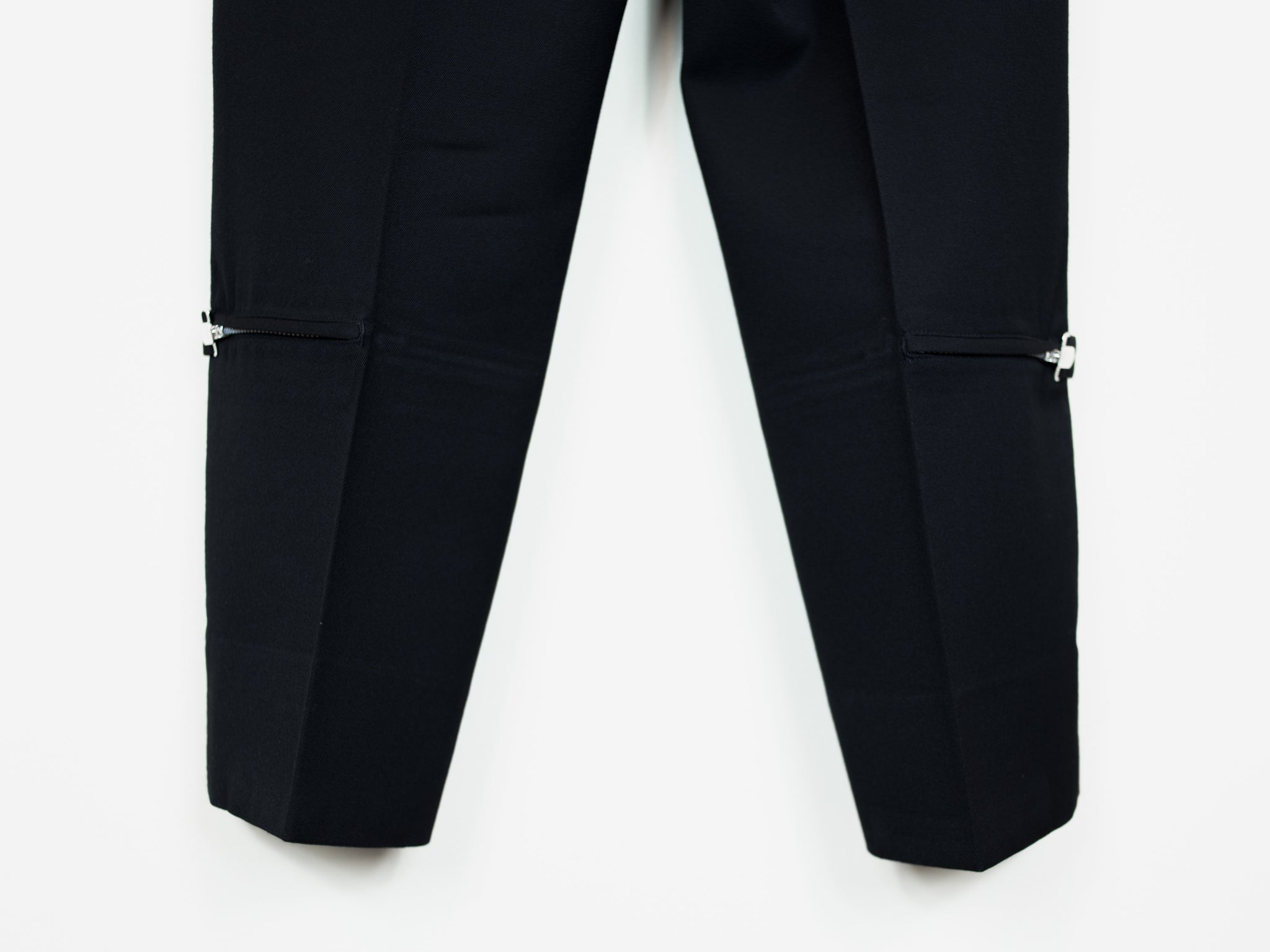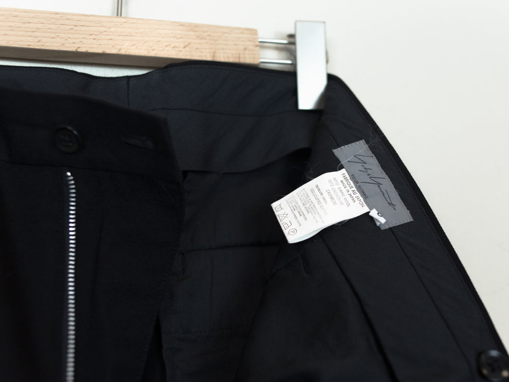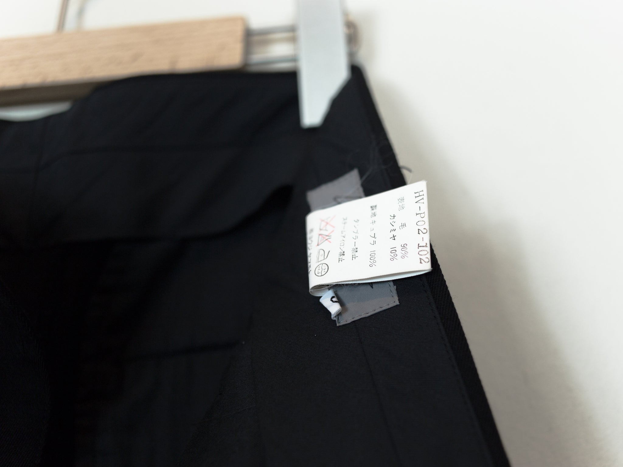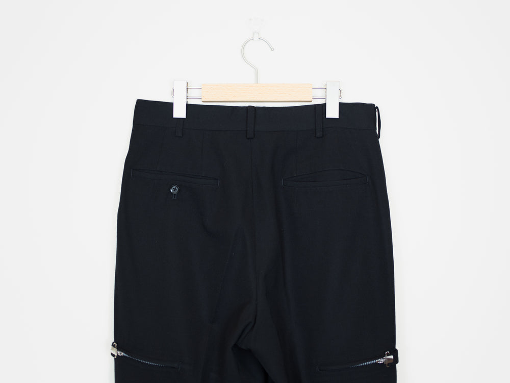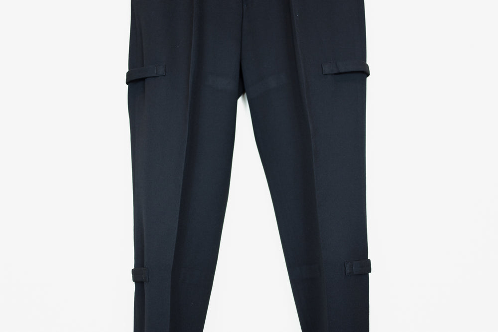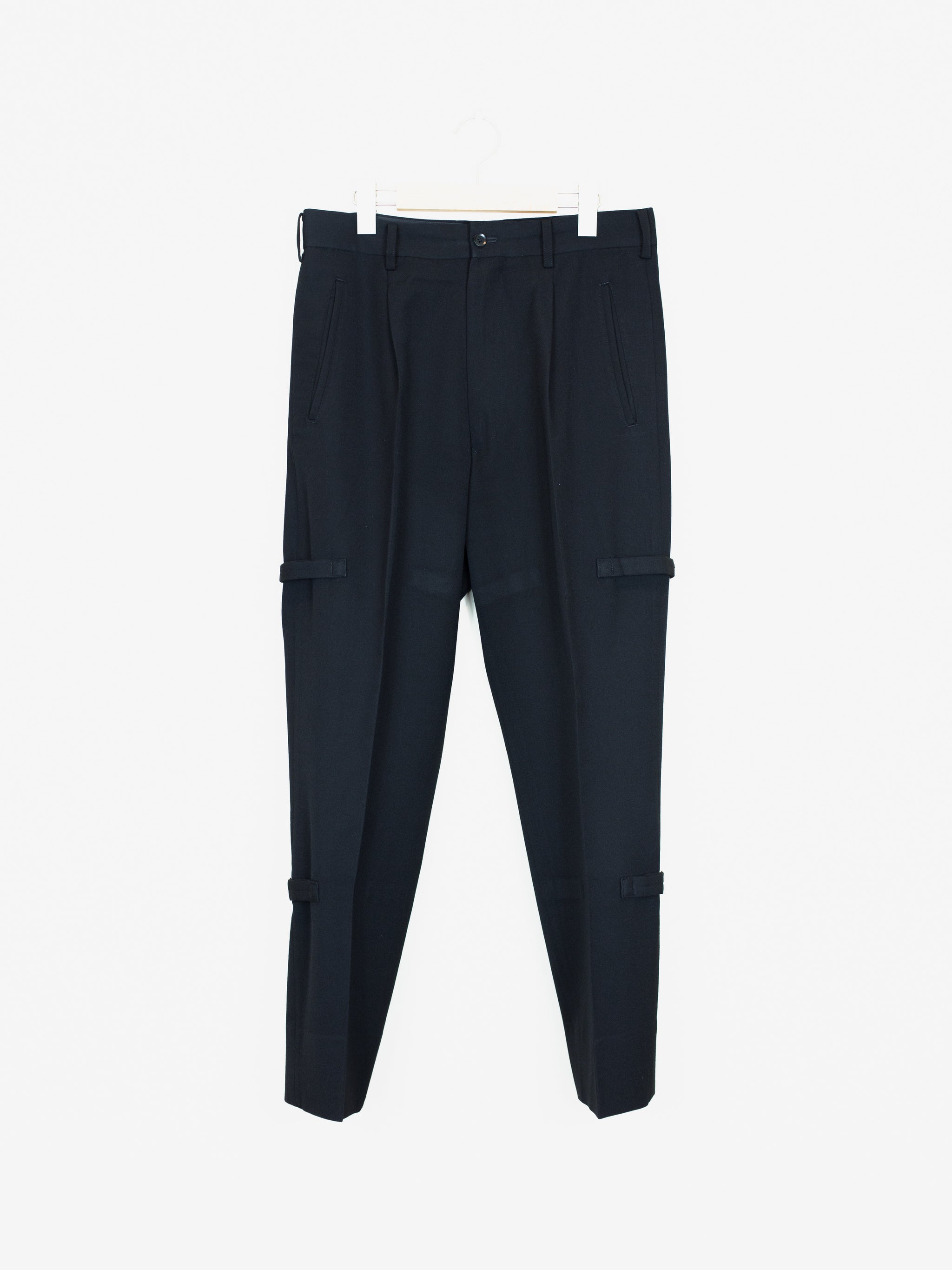Black/Silver This pair of black trousers from Yohji Yamamoto Pour Homme is crafted in one of the softest and most comfortable wool/cashmere blends, with a smooth hand thanks to its dense gabardine weave. It's a material that moves amazingly fluidly with the wearer. Contrasted with the structured creased leg and adjustable straps, the drape of the material yields a garment that upsets one's traditional perception of how pants should fit and move. Pleated and pressed, the pants sit sharp, elegant, and tapered, with the option to cinch the straps and deform the silhouette. Bring a slight flare to the hem by tightening the the calf strap or crimp the leg to shape your body with the one at the thigh. The different styling options make for a trouser that wears as playful as it does formal.