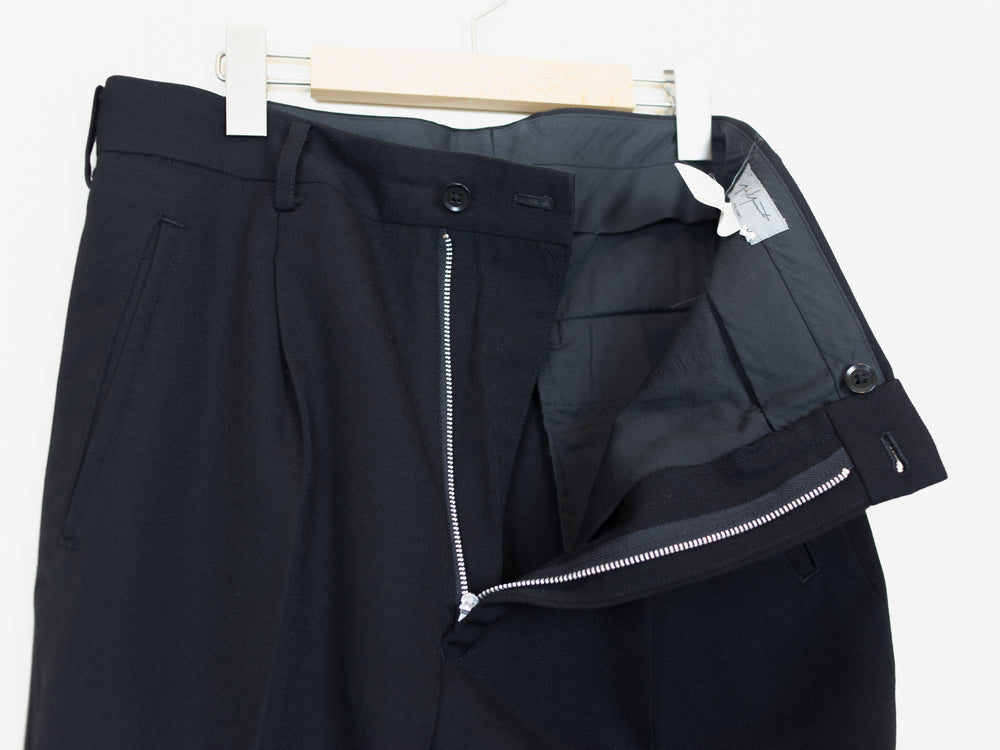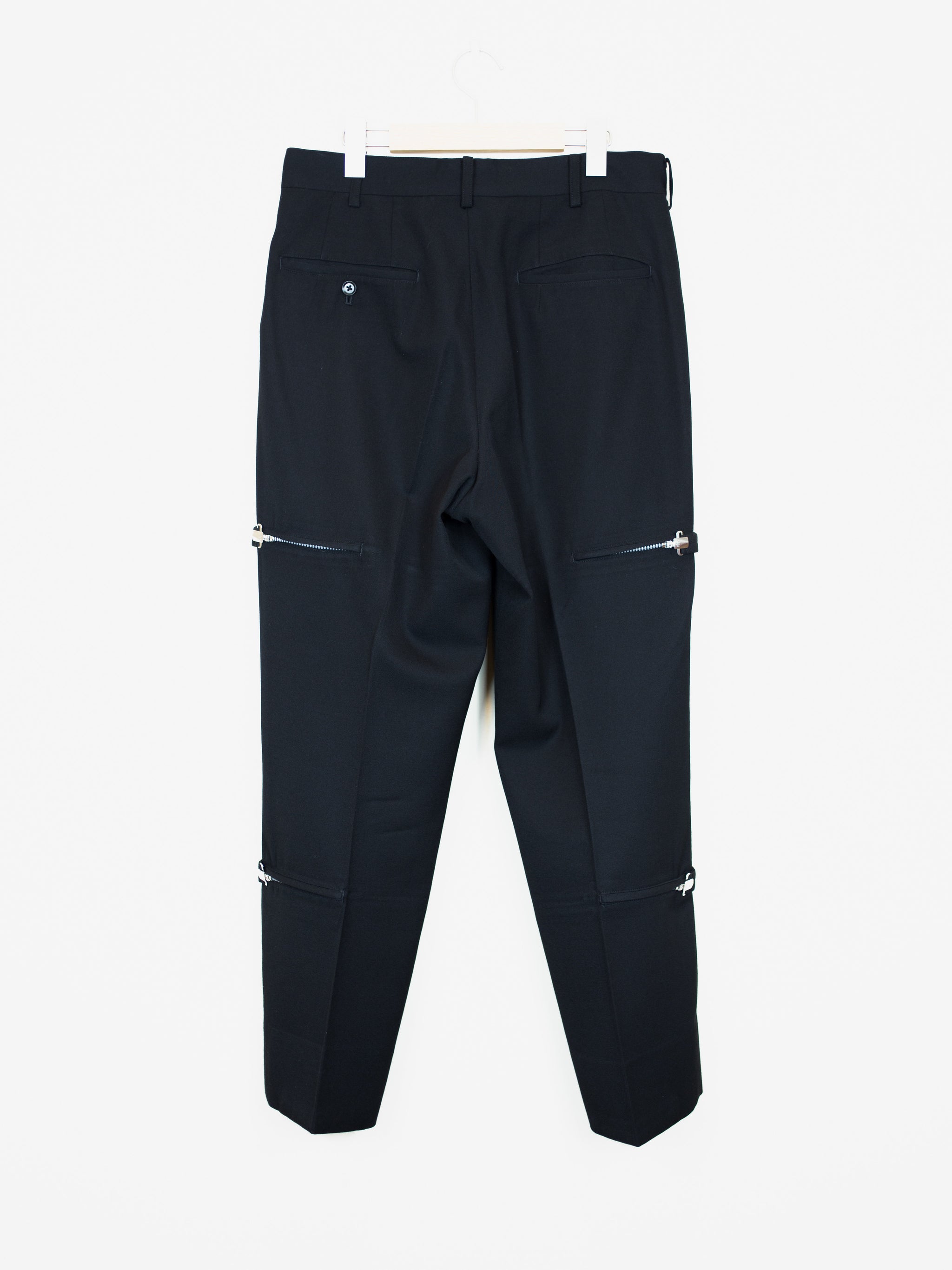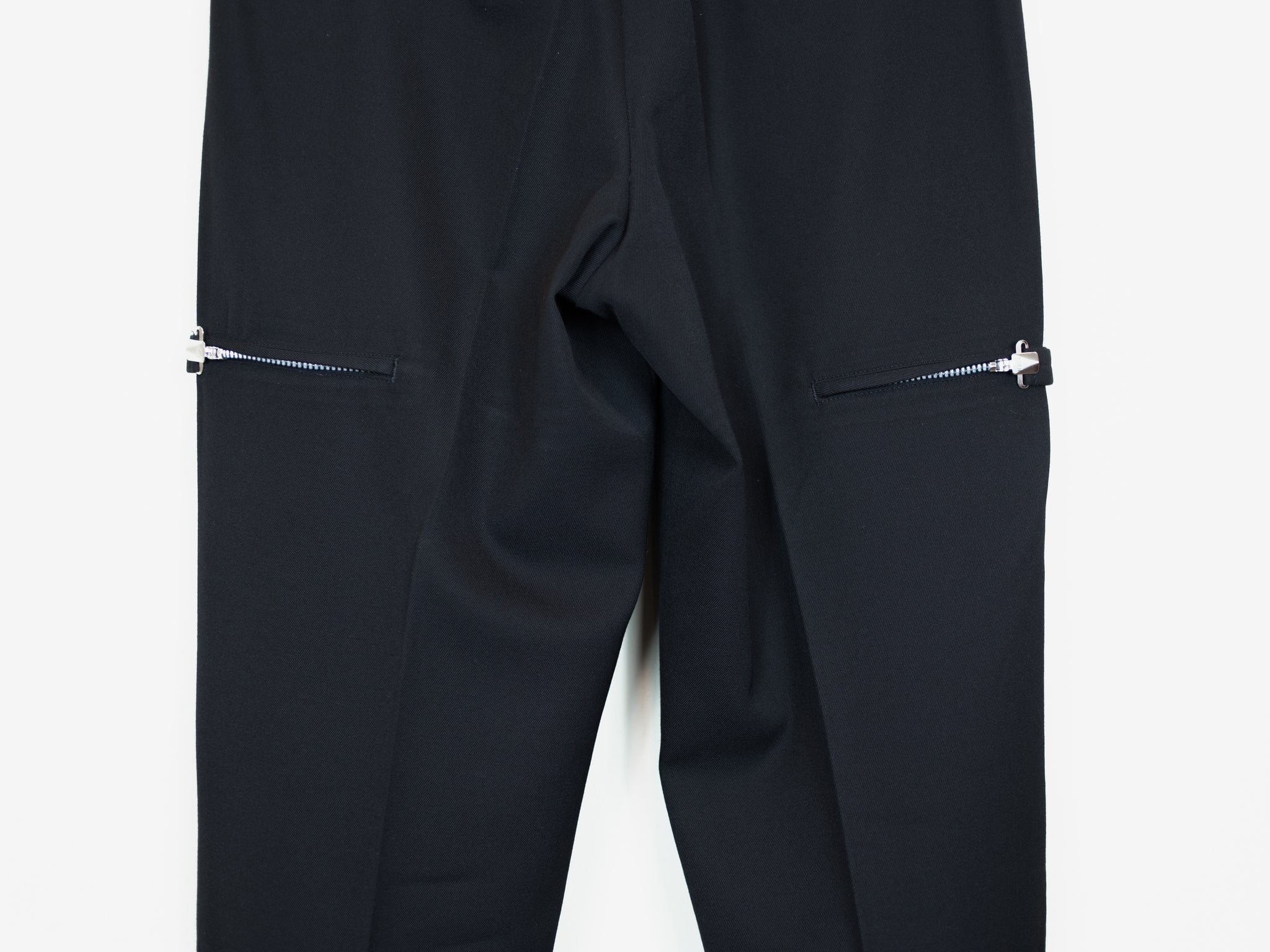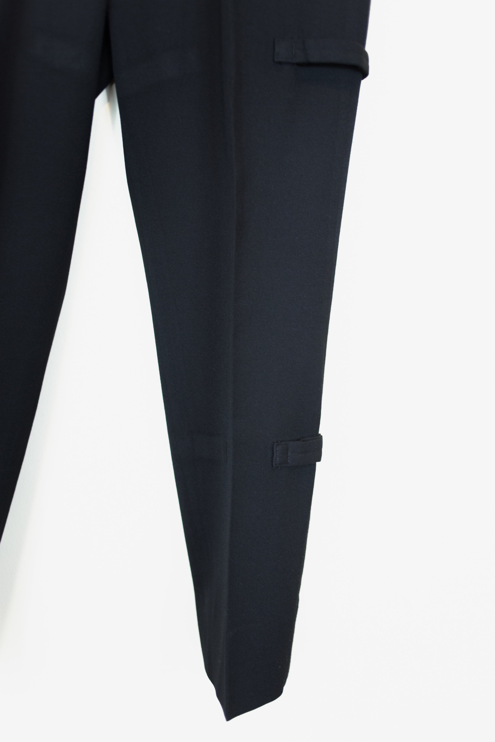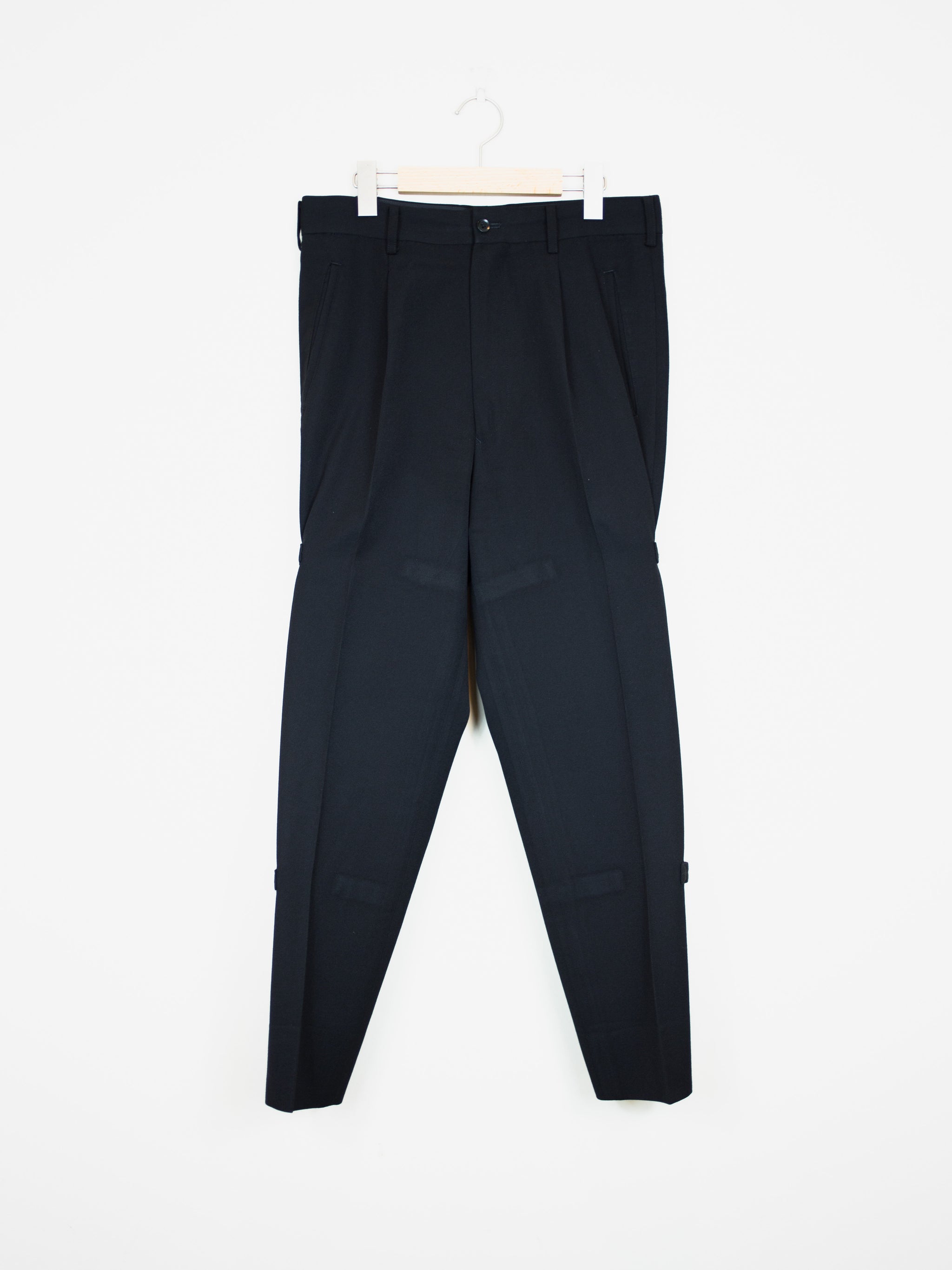 Black/Silver This pair of black trousers from Yohji Yamamoto Pour Homme is crafted in one of the softest and most comfortable wool/cashmere blends, with a smooth hand thanks to its dense gabardine weave. It's a material that moves amazingly fluidly with the wearer. Contrasted with the structured creased leg and adjustable straps, the drape of the material yields a garment that upsets one's traditional perception of how pants should fit and move. Pleated and pressed, the pants sit sharp, elegant, and tapered, with the option to cinch the straps and deform the silhouette. Bring a slight flare to the hem by tightening the the calf strap or crimp the leg to shape your body with the one at the thigh. The different styling options make for a trouser that wears as playful as it does formal.
