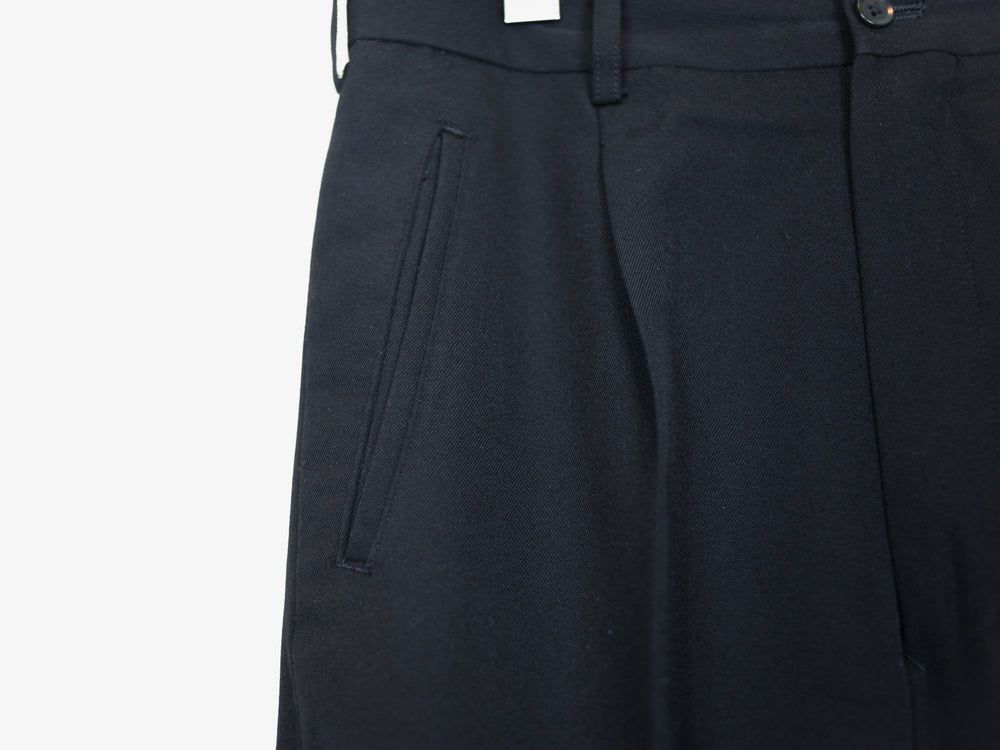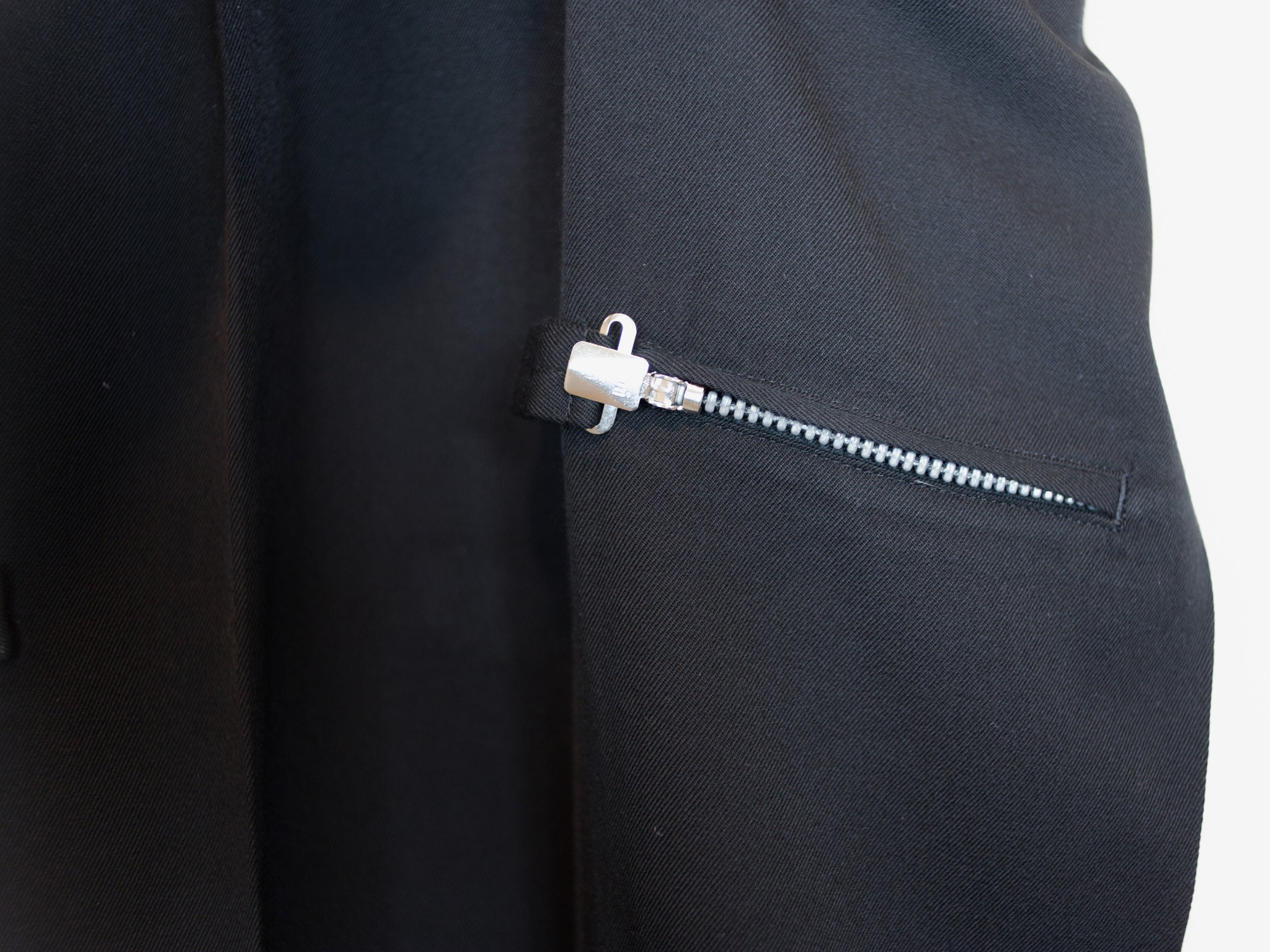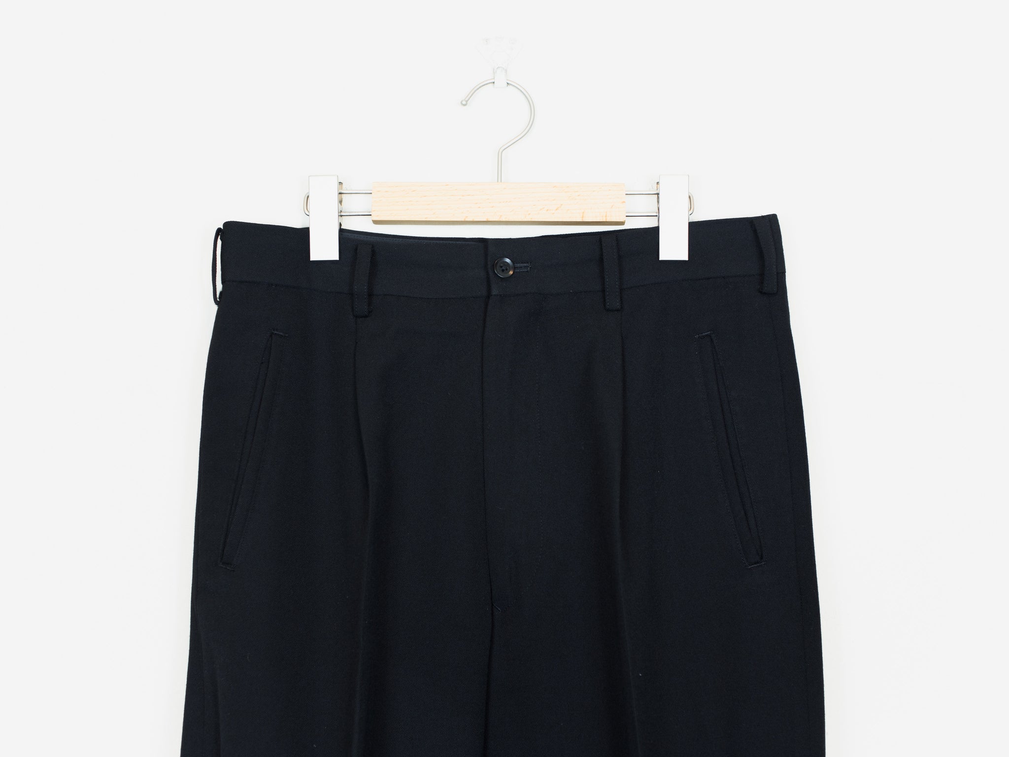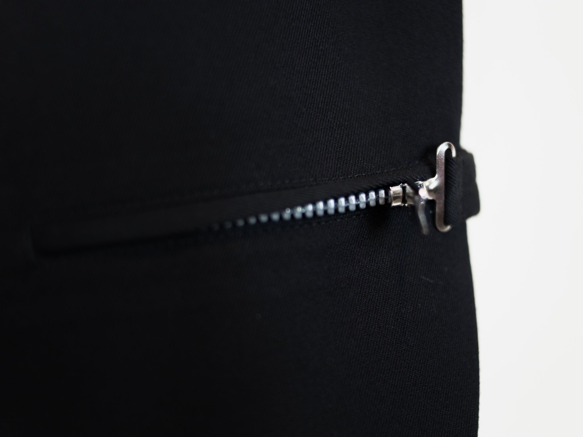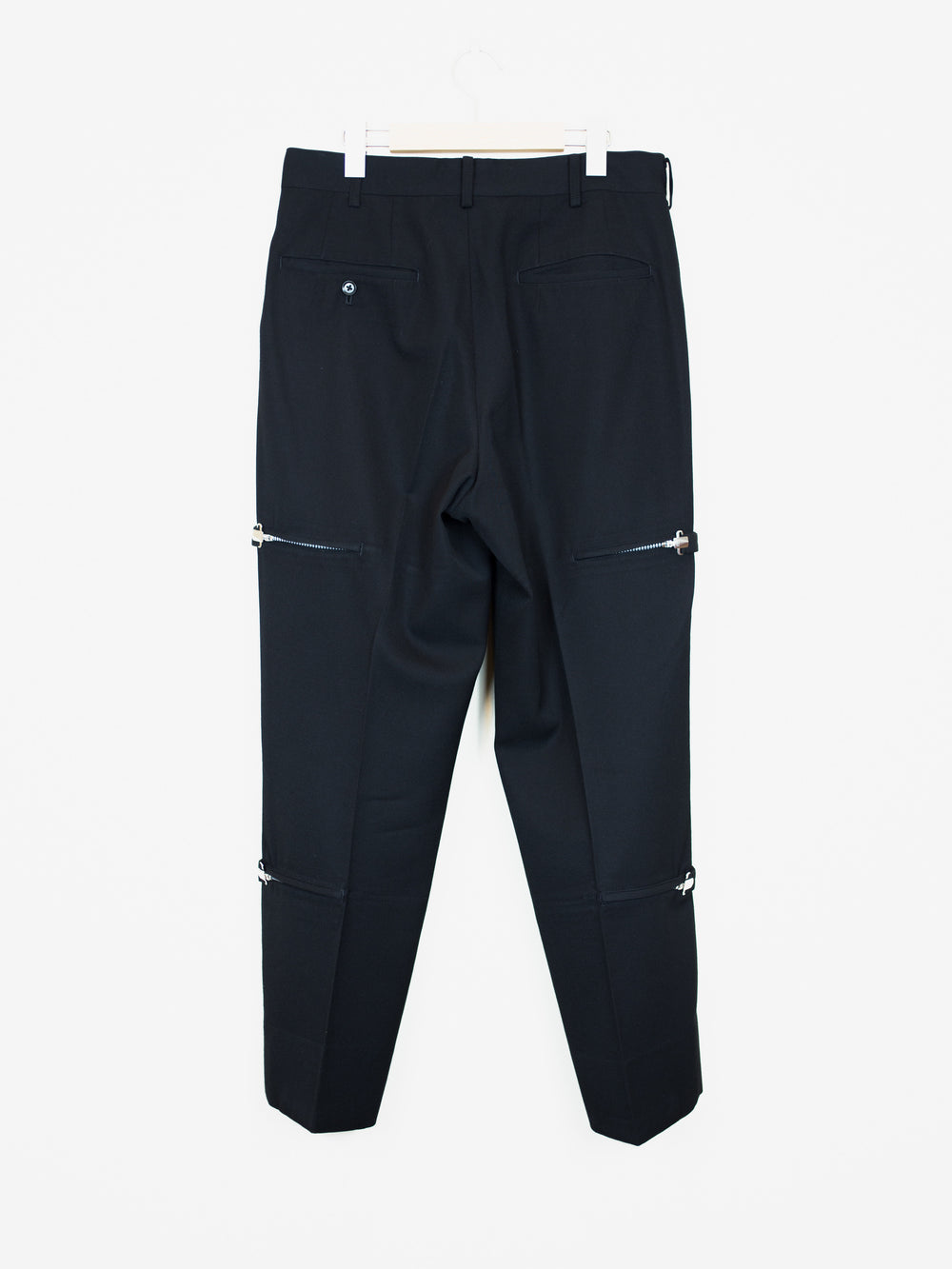 Black/Silver This pair of black trousers from Yohji Yamamoto Pour Homme is crafted in one of the softest and most comfortable wool/cashmere blends, with a smooth hand thanks to its dense gabardine weave. It's a material that moves amazingly fluidly with the wearer. Contrasted with the structured creased leg and adjustable straps, the drape of the material yields a garment that upsets one's traditional perception of how pants should fit and move. Pleated and pressed, the pants sit sharp, elegant, and tapered, with the option to cinch the straps and deform the silhouette. Bring a slight flare to the hem by tightening the the calf strap or crimp the leg to shape your body with the one at the thigh. The different styling options make for a trouser that wears as playful as it does formal.