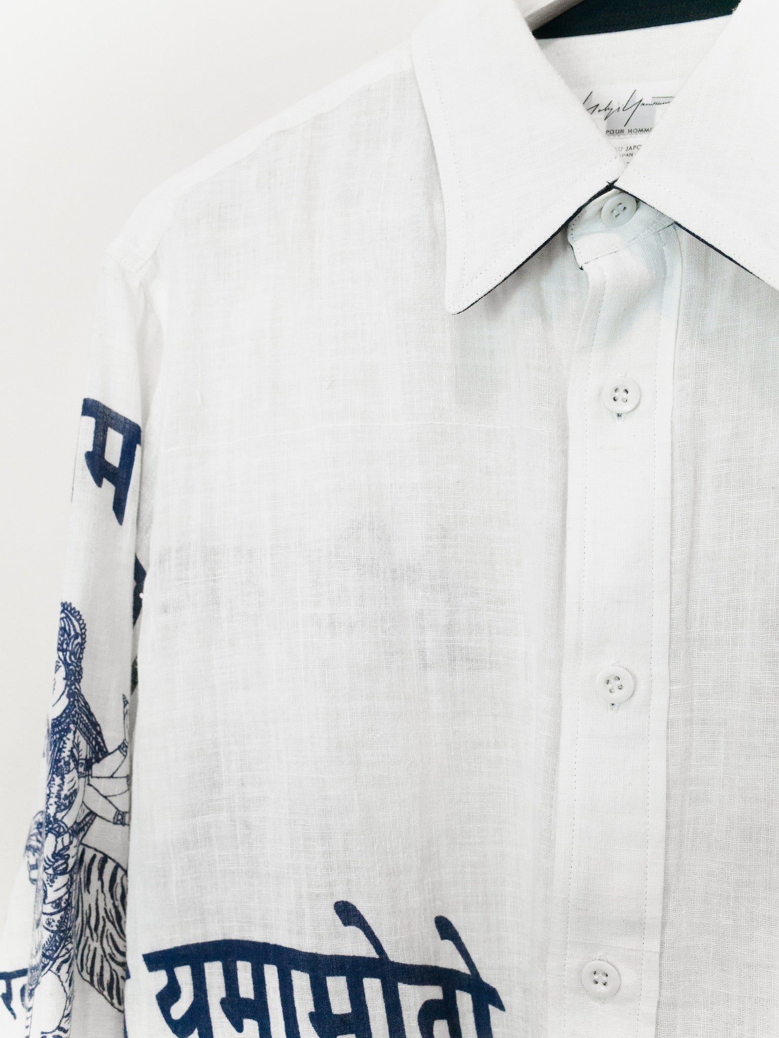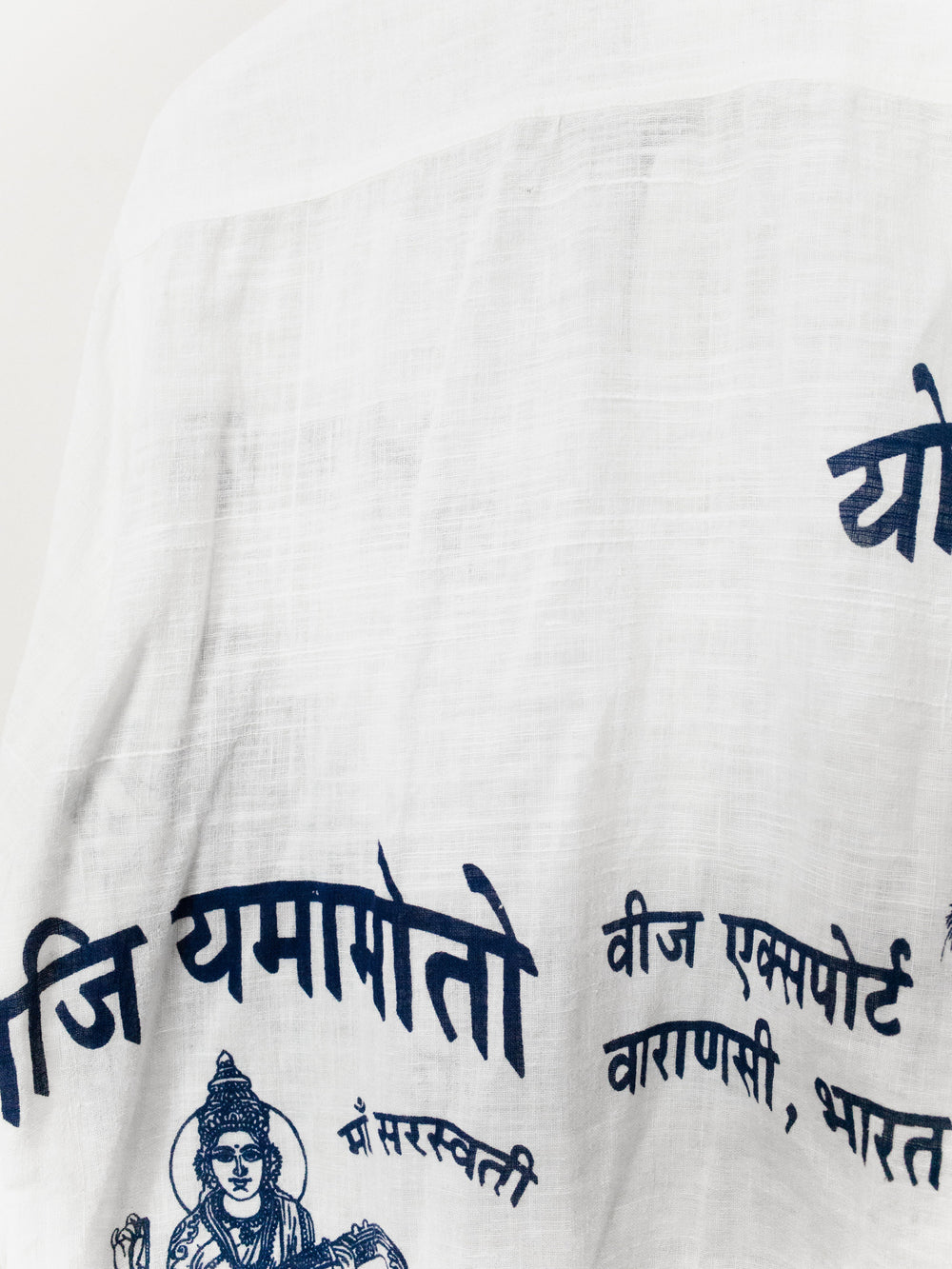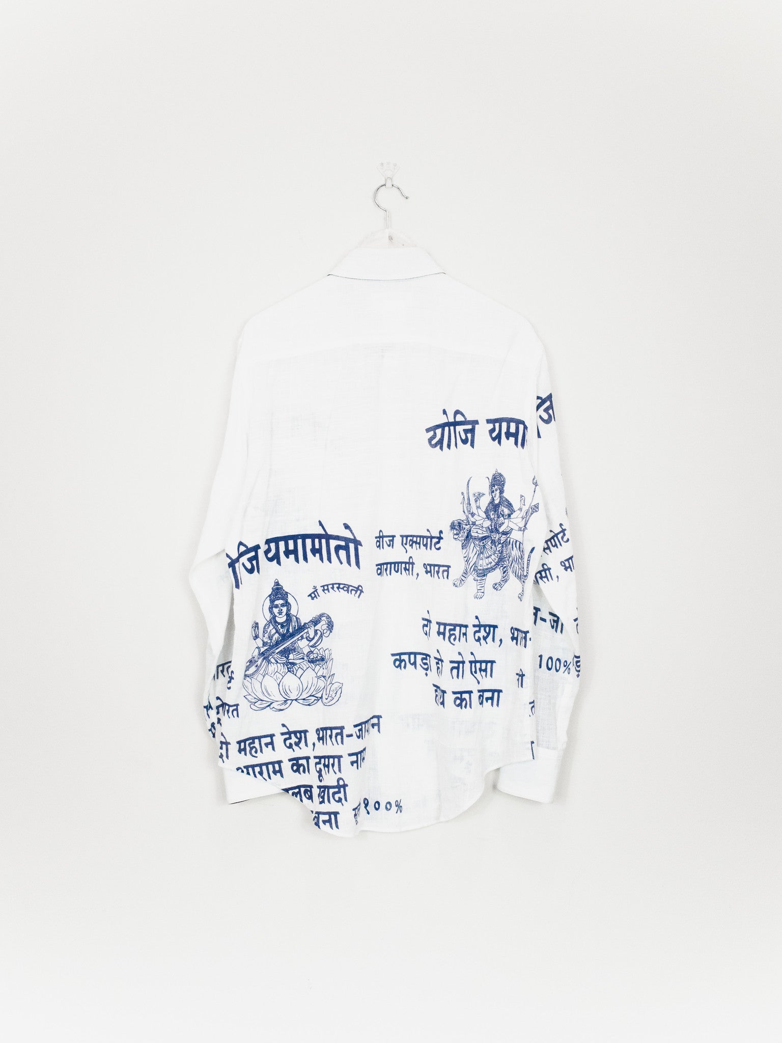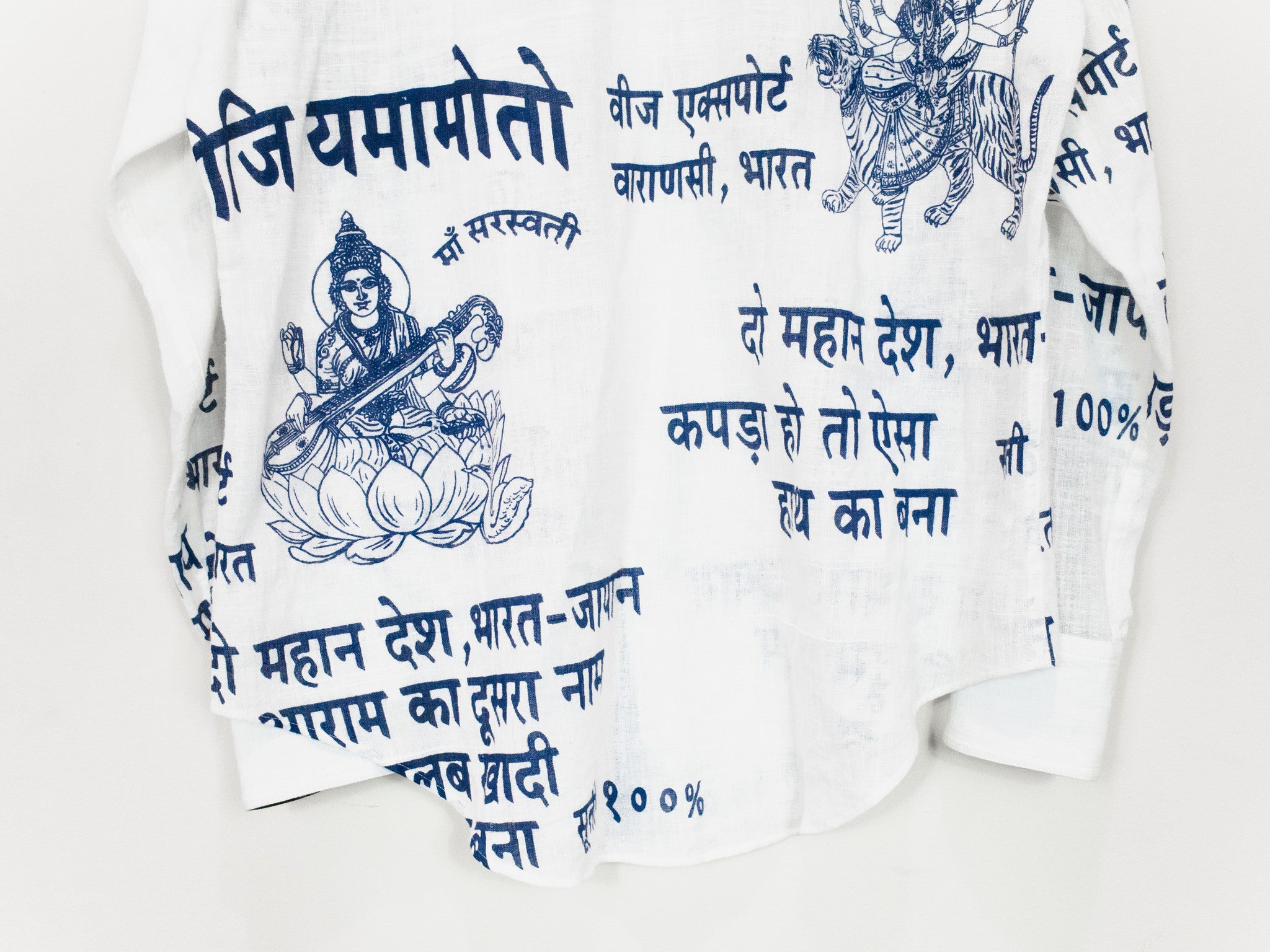 Here is a standout piece from Yohji Yamamoto's Autumn/Winter 2004 collection--a white shirt in an airy cotton/rayon weave, given structure at the collar, cuffs, and placket with an extra layer of contrast navy cotton. The prints that litter the entire shirt are written in Hindi and convey the nonchalantly ostentatious attitude that a lot of Yohji Yamamoto garments carry with them. Among the words scripted are 'Yohji Yamamoto,' 'Two Great Nations,' 'Handmade,' and the best of them all, 'If you have clothes they'd better be like this.' What more of a reason do you need to pick this shirt up?
