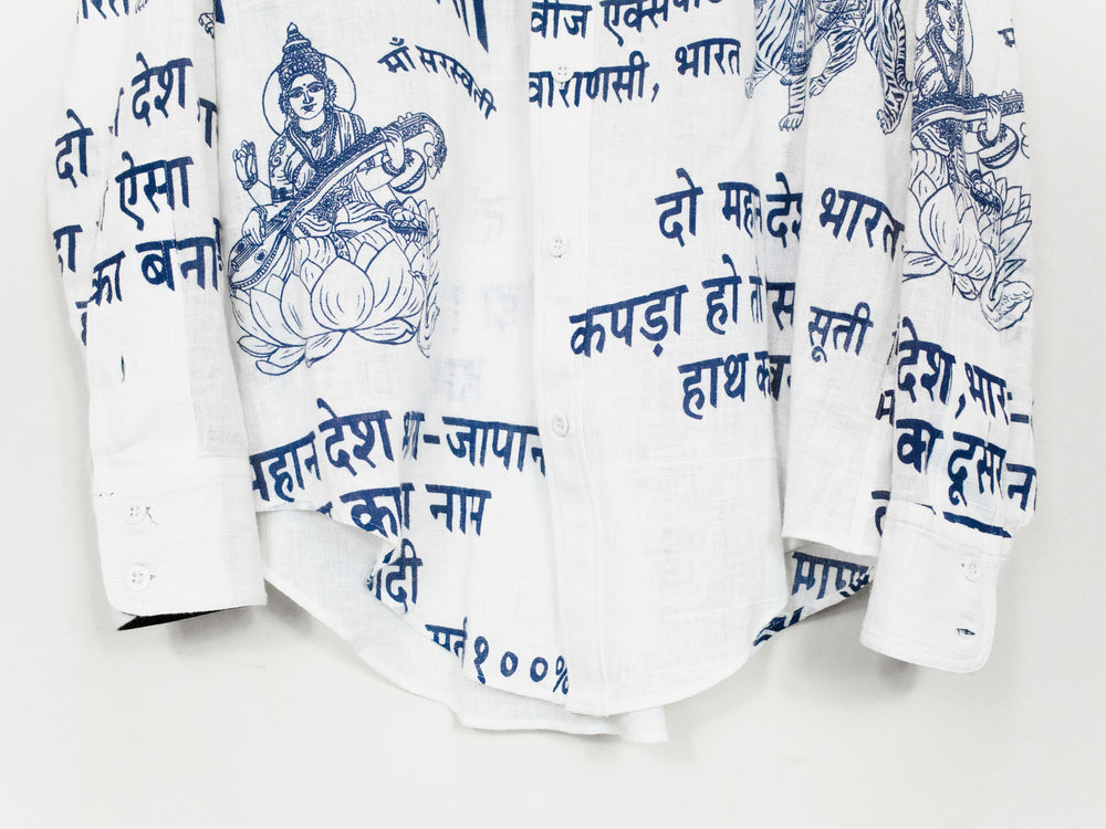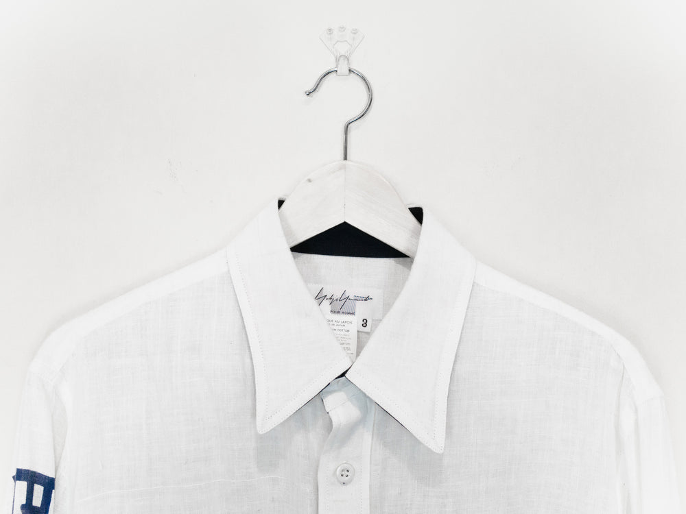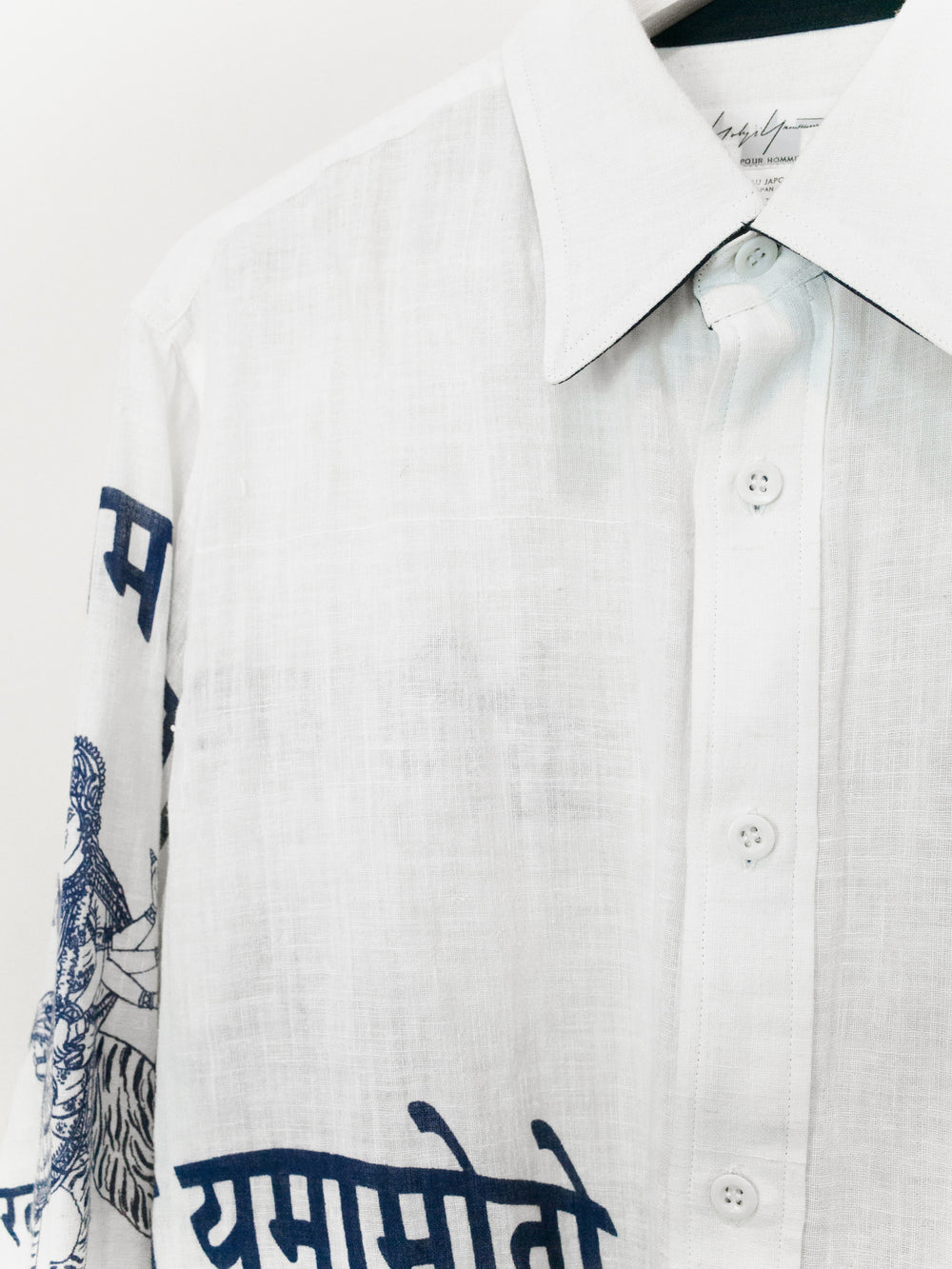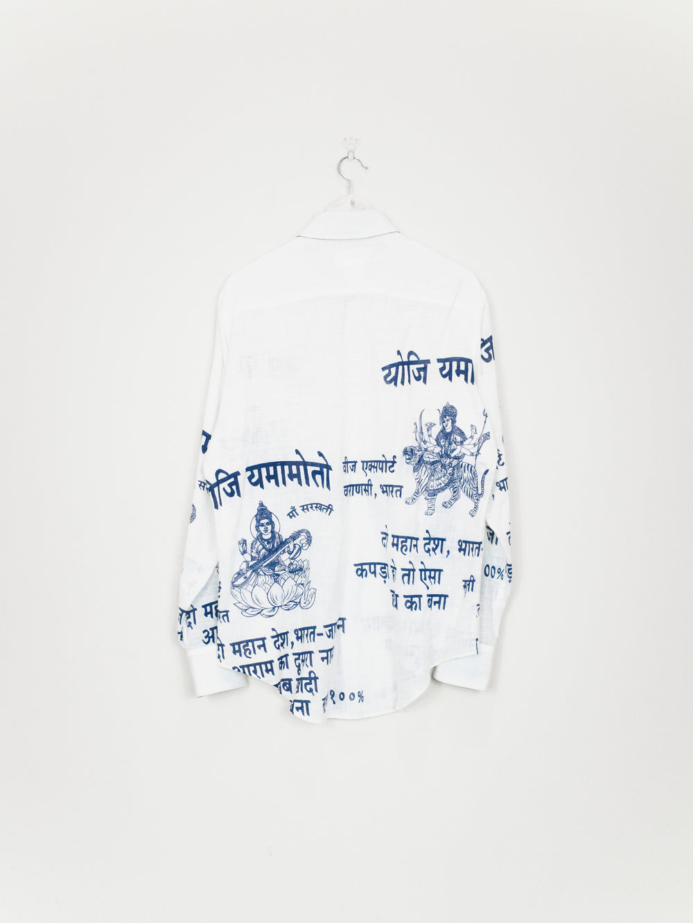 Here is a standout piece from Yohji Yamamoto's Autumn/Winter 2004 collection--a white shirt in an airy cotton/rayon weave, given structure at the collar, cuffs, and placket with an extra layer of contrast navy cotton. The prints that litter the entire shirt are written in Hindi and convey the nonchalantly ostentatious attitude that a lot of Yohji Yamamoto garments carry with them. Among the words scripted are 'Yohji Yamamoto,' 'Two Great Nations,' 'Handmade,' and the best of them all, 'If you have clothes they'd better be like this.' What more of a reason do you need to pick this shirt up?