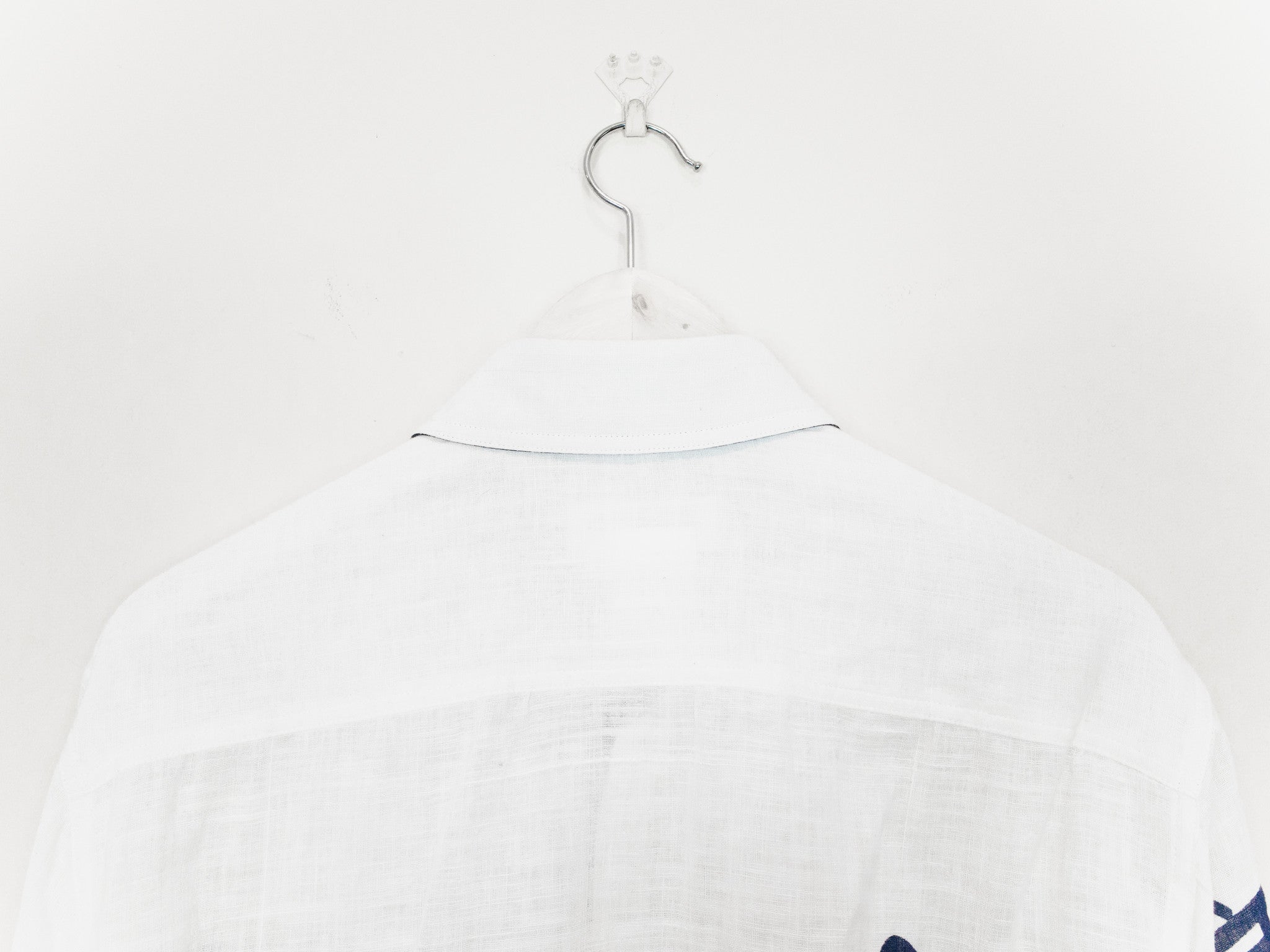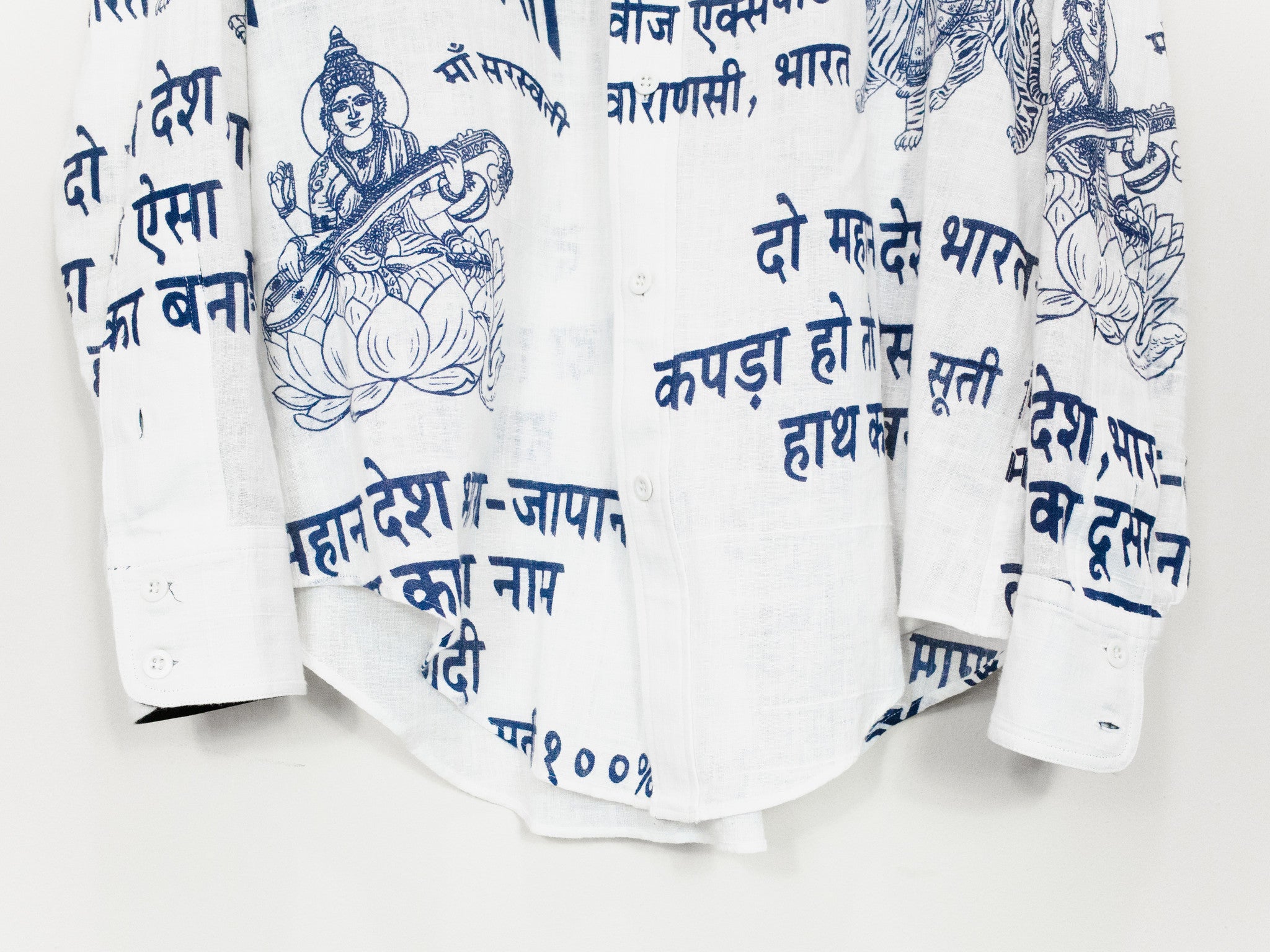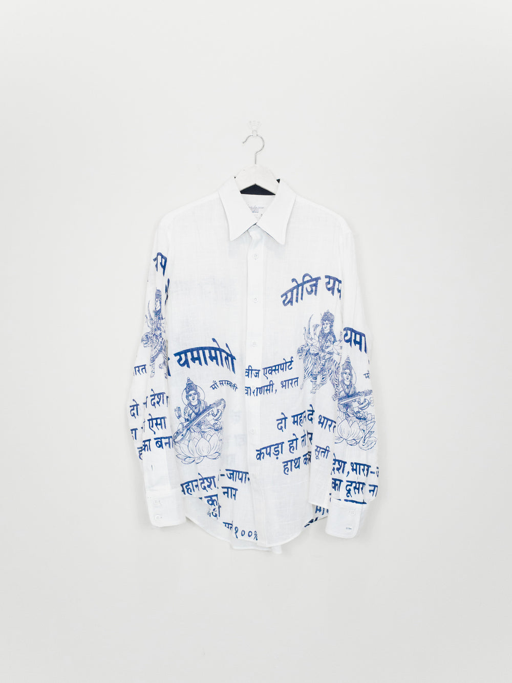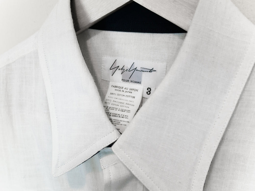 Here is a standout piece from Yohji Yamamoto's Autumn/Winter 2004 collection--a white shirt in an airy cotton/rayon weave, given structure at the collar, cuffs, and placket with an extra layer of contrast navy cotton. The prints that litter the entire shirt are written in Hindi and convey the nonchalantly ostentatious attitude that a lot of Yohji Yamamoto garments carry with them. Among the words scripted are 'Yohji Yamamoto,' 'Two Great Nations,' 'Handmade,' and the best of them all, 'If you have clothes they'd better be like this.' What more of a reason do you need to pick this shirt up?