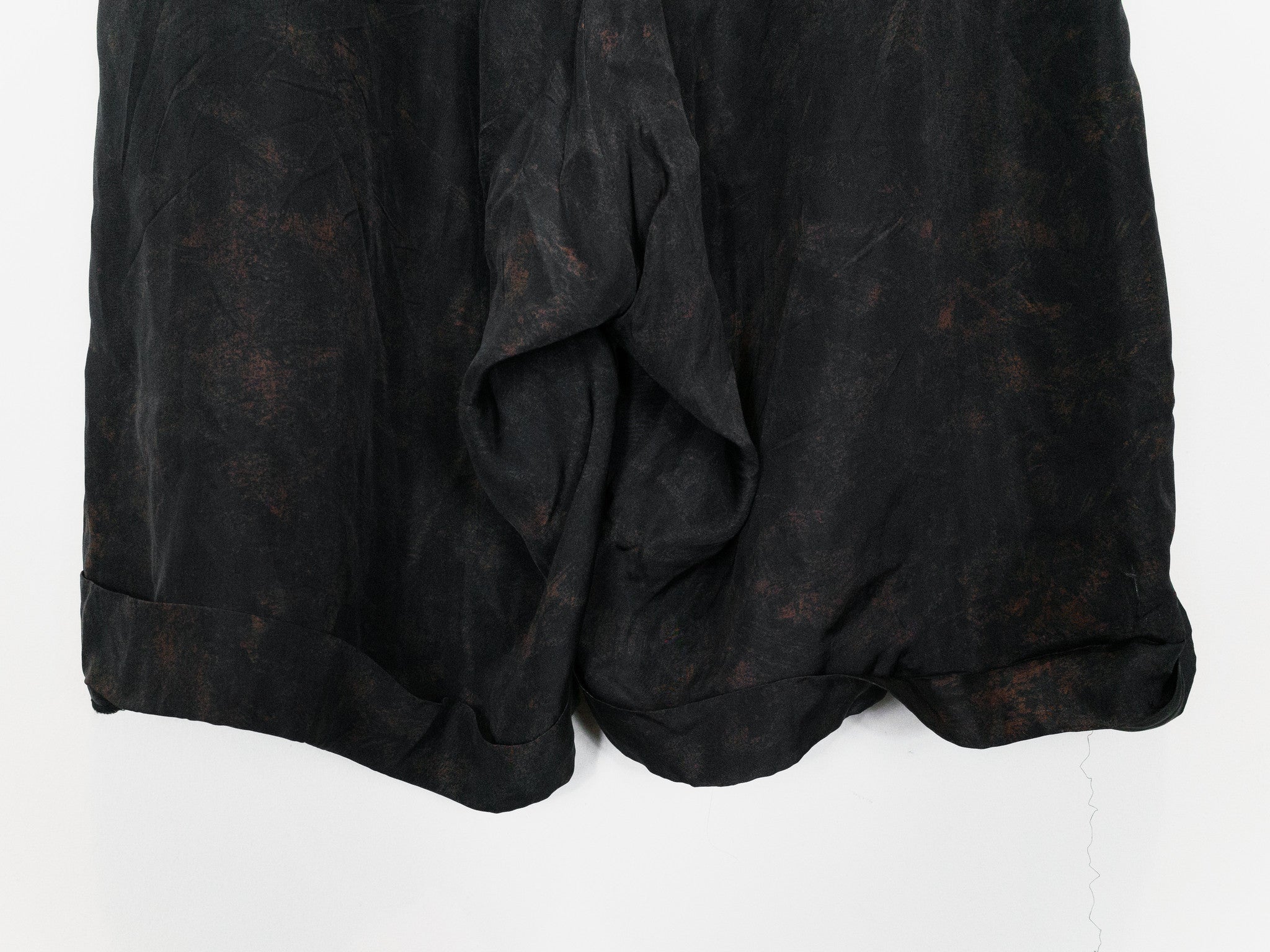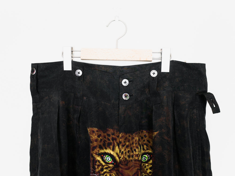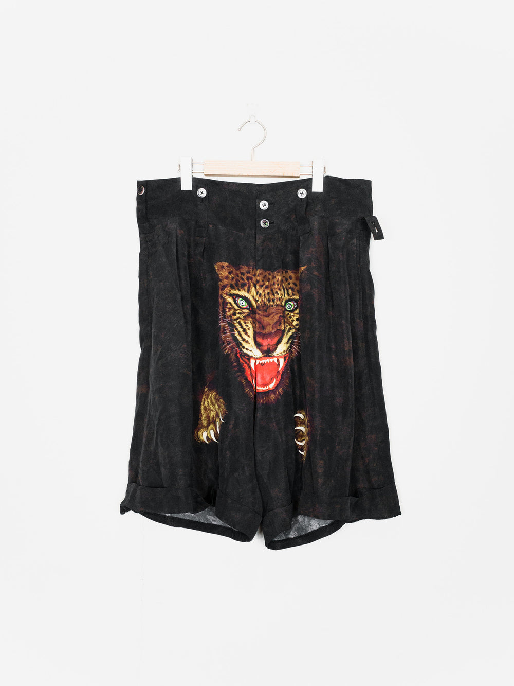 100% (fabric) shorts, cut voluminously with a stitched in cuff. This iteration of the animal printed boxers is one of the few that features a fully executed upper block. Featuring a waist button closure, a zipper fly, slash side pockets, back pockets, and belt loops, this pair is executed at a more complete and refined level that lends it more wearability. As is the case with many Yohji Yamamoto pants, the waist is sized generously and allows any wearer to belt them down to size to fit. This is also the case given the option to style these over another pair of pants.