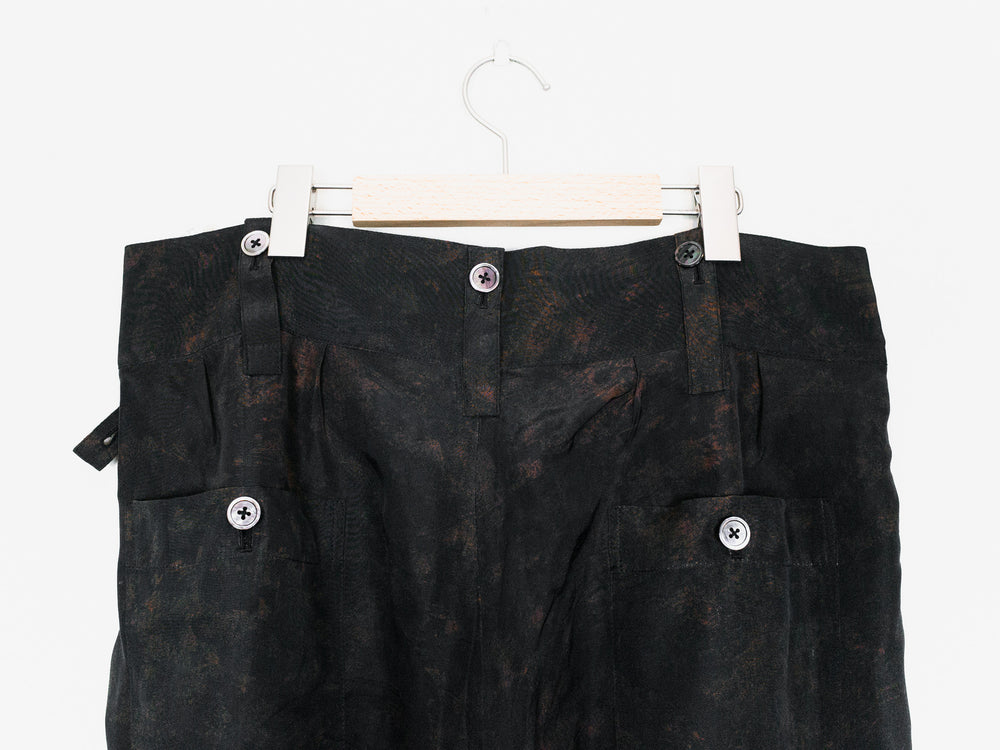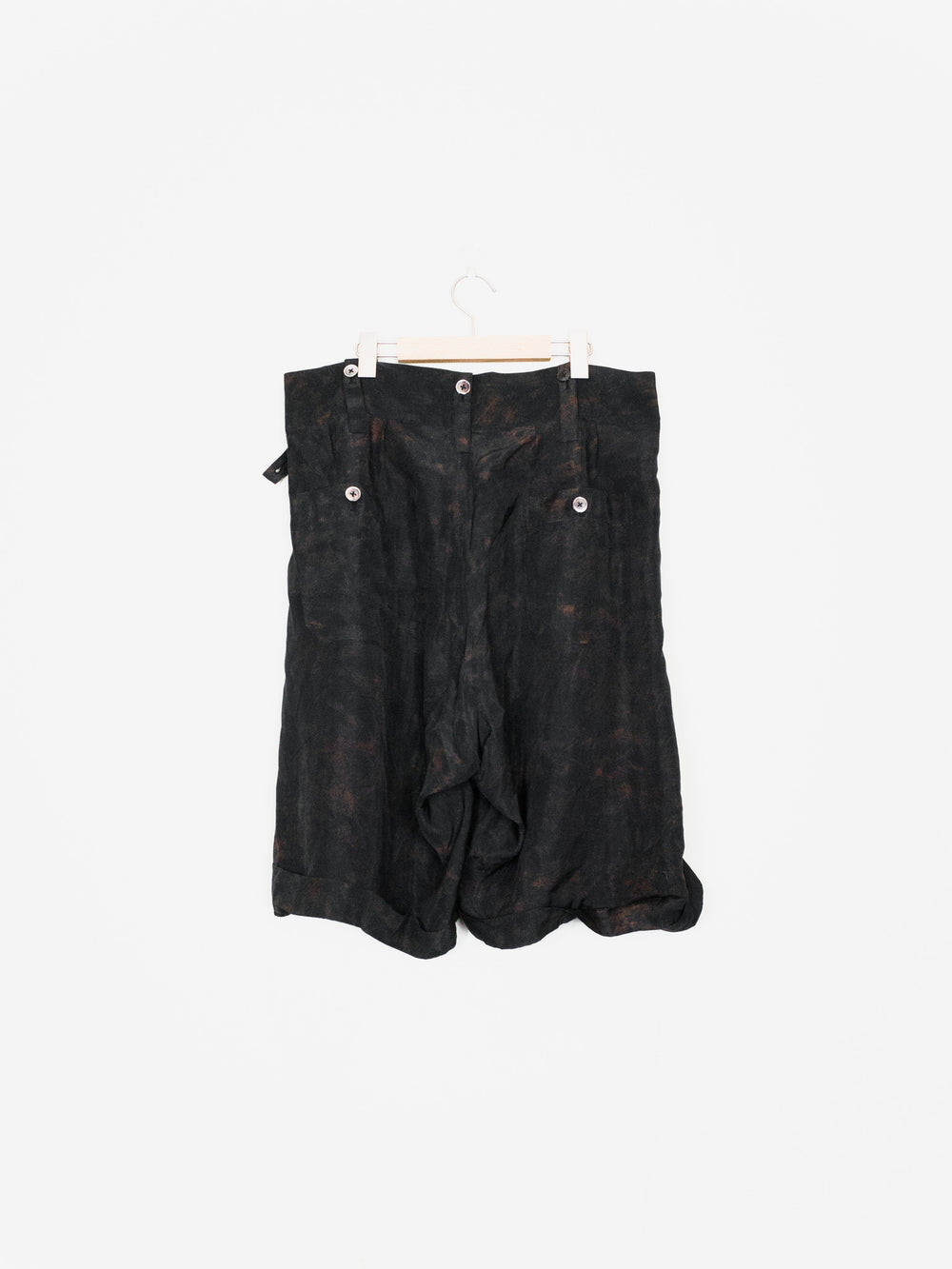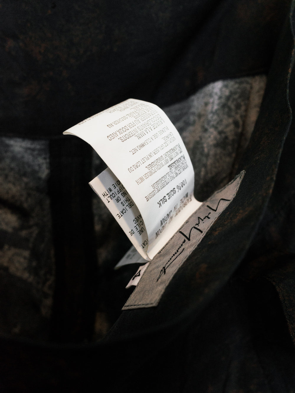 100% (fabric) shorts, cut voluminously with a stitched in cuff. This iteration of the animal printed boxers is one of the few that features a fully executed upper block. Featuring a waist button closure, a zipper fly, slash side pockets, back pockets, and belt loops, this pair is executed at a more complete and refined level that lends it more wearability. As is the case with many Yohji Yamamoto pants, the waist is sized generously and allows any wearer to belt them down to size to fit. This is also the case given the option to style these over another pair of pants.