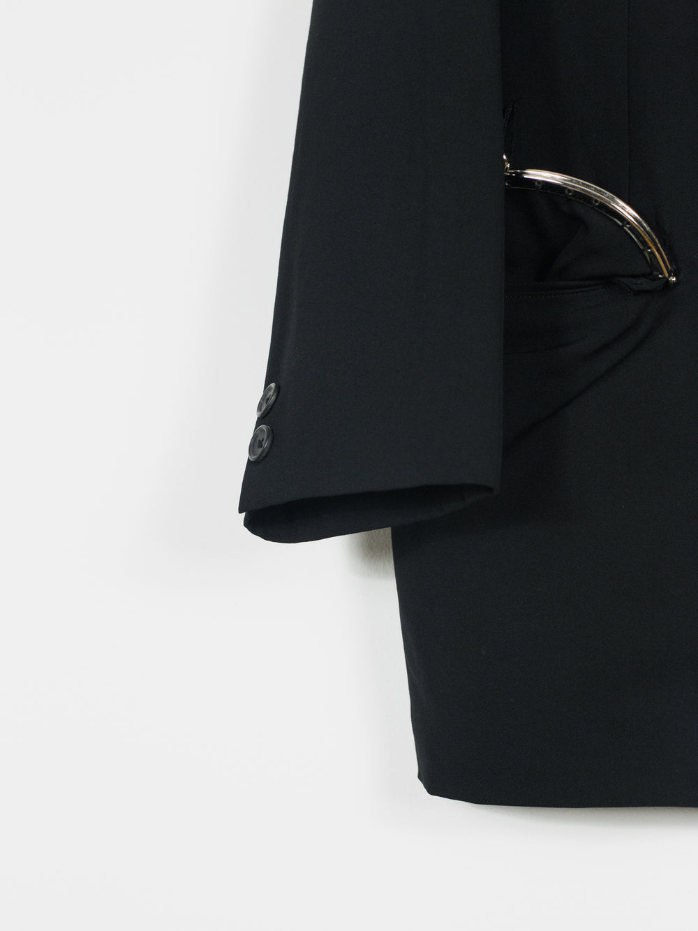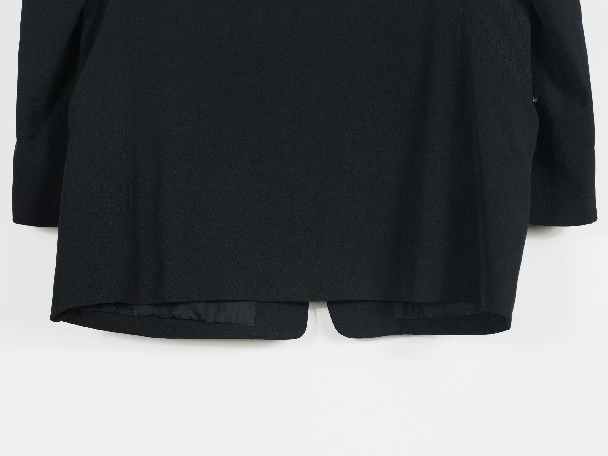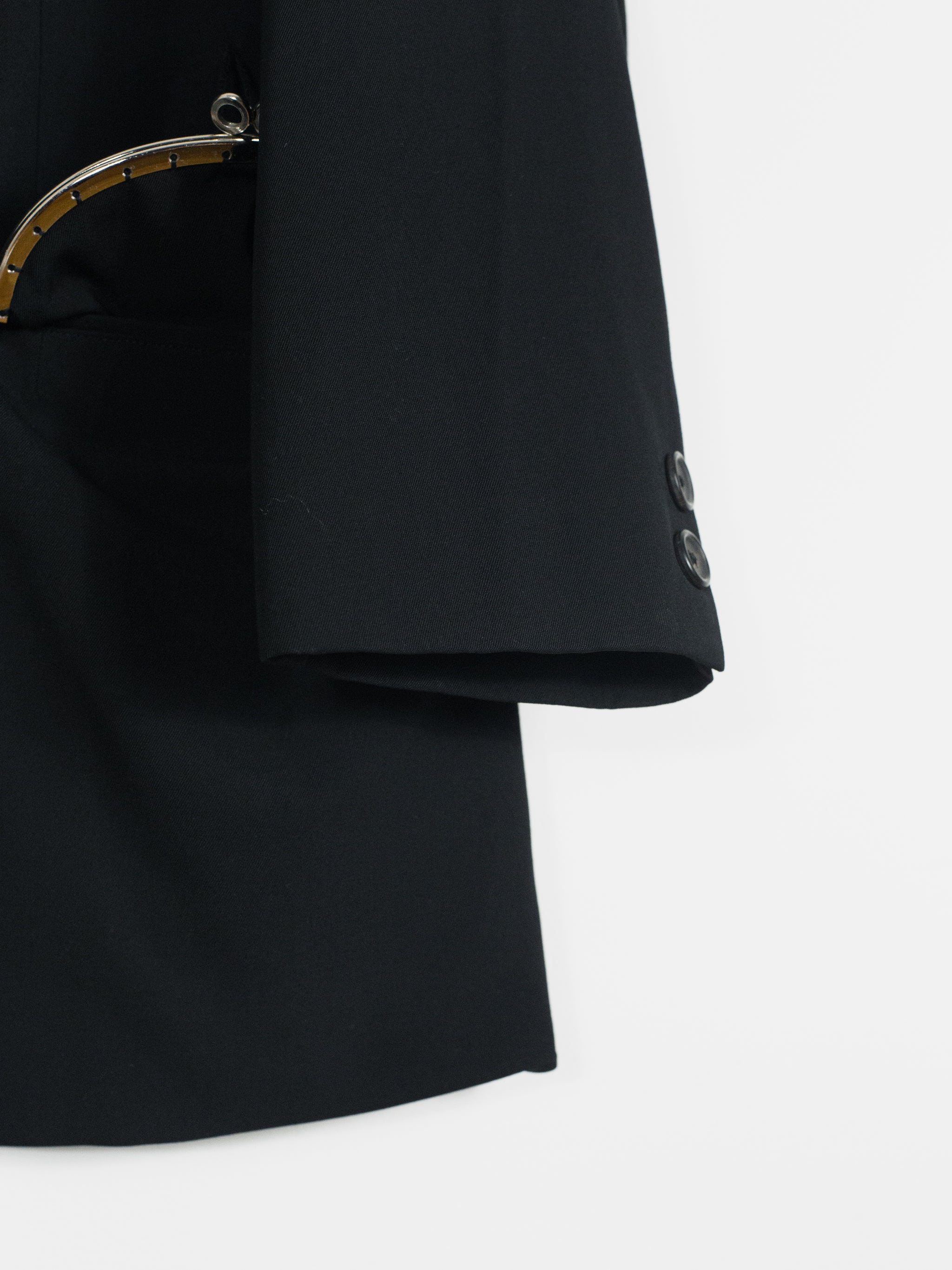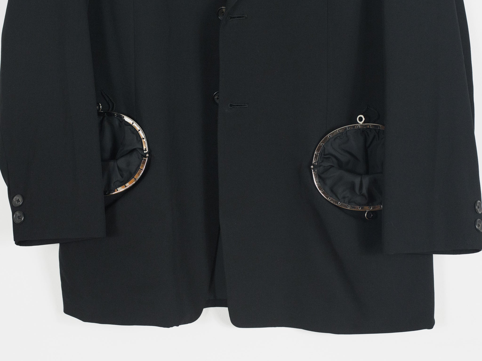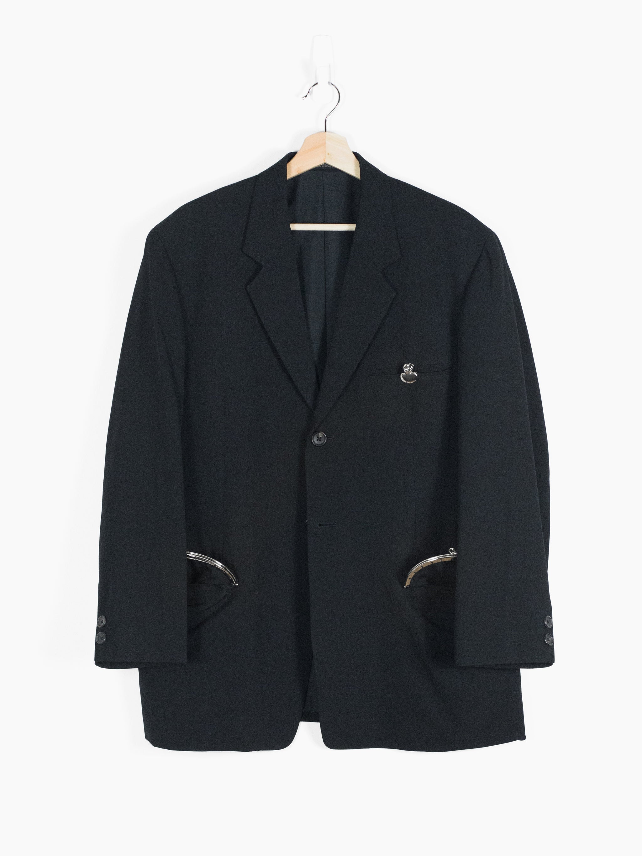 -This jacket is cut in a signature vintage Yohji shape with over-wide structured shoulders and a long body. Fully lined and adorned with metal purse details at the breast and waist pockets, the jacket imbues the wearer with a  beautiful irreverence. It contentiously juxtaposes a masculine silhouette with markers of feminine luxury and glamour, as to say the wearer isn't preoccupied with this sort of gendered ambiguity.