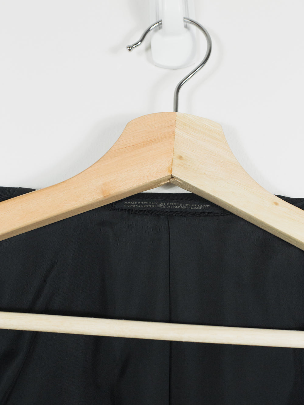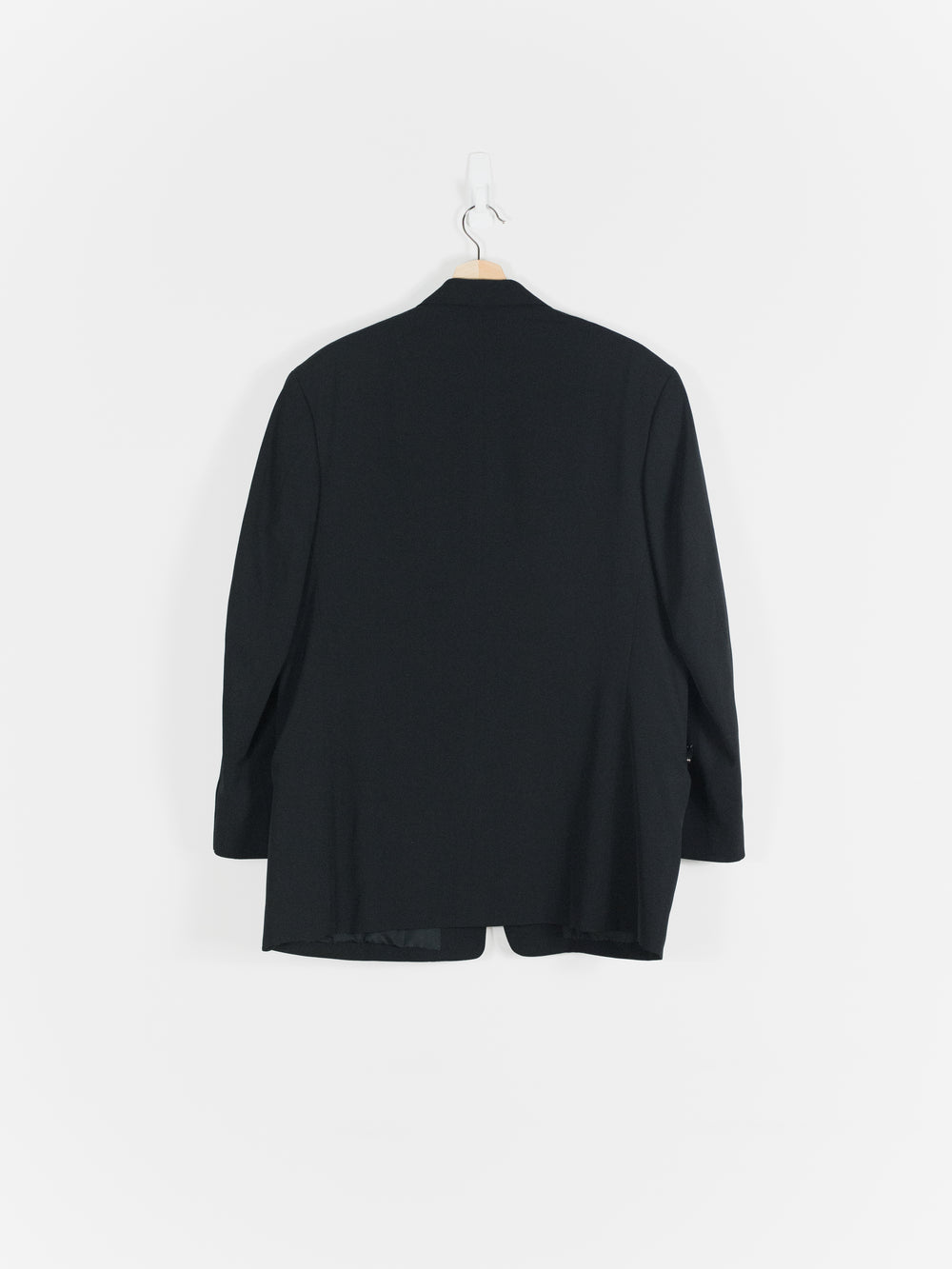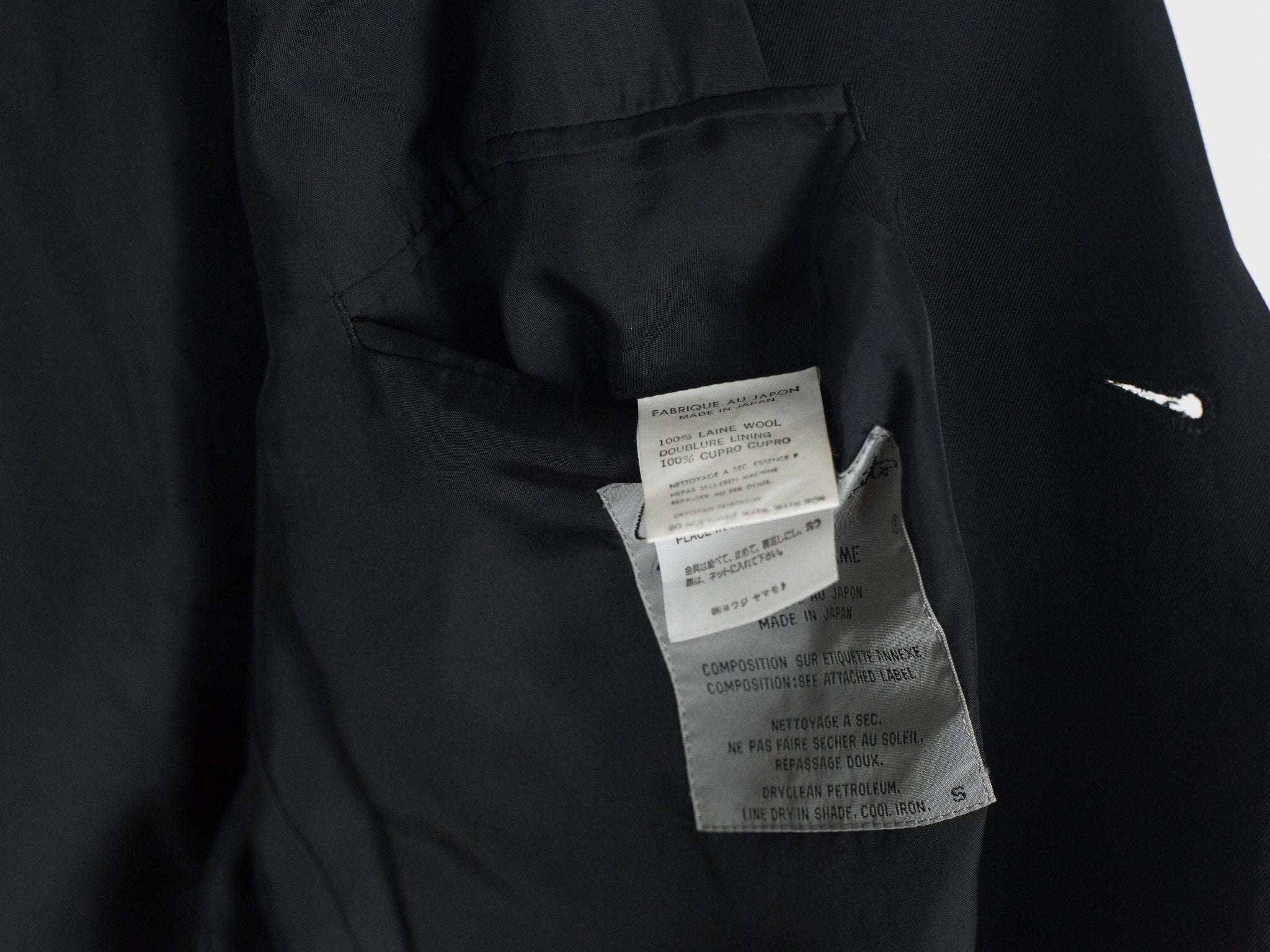 -The traditionally 80s square-shouldered cut of the jacket is contrasted with a slightly dropped button-stance, quite normally-sized notch lapels, and the even smaller-scale intricate purse detailing. This variation of scale and play with proportion gives the jacket a purposely 'imbalanced' visual appearance. Yohji's subtle subversion of traditional menswear and tailoring codes is in full effect in this piece and it makes for a beautifully off-kilter yet wearable garment.