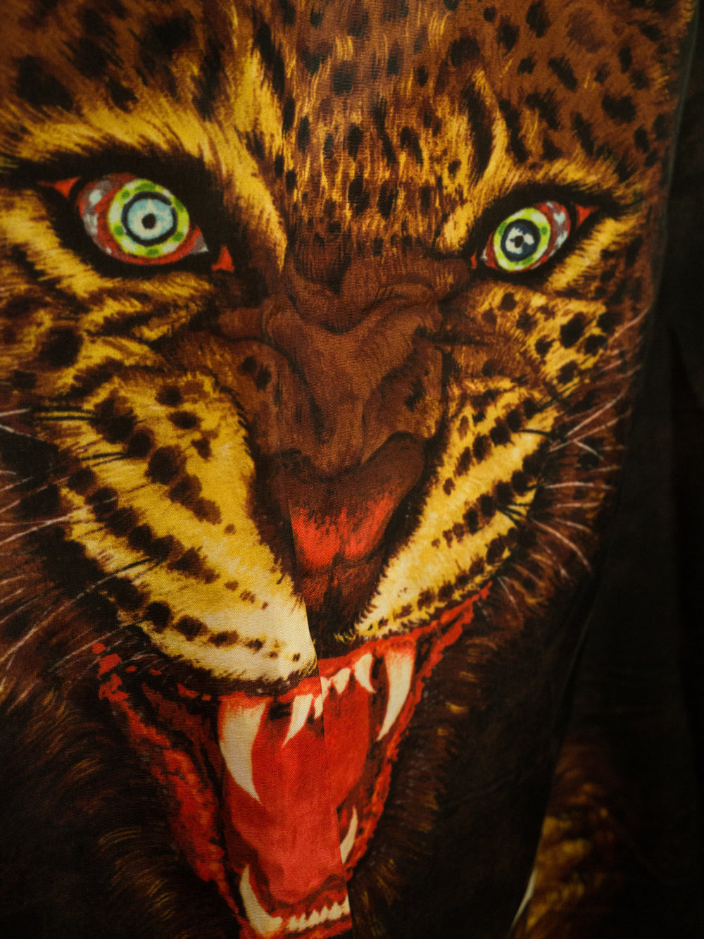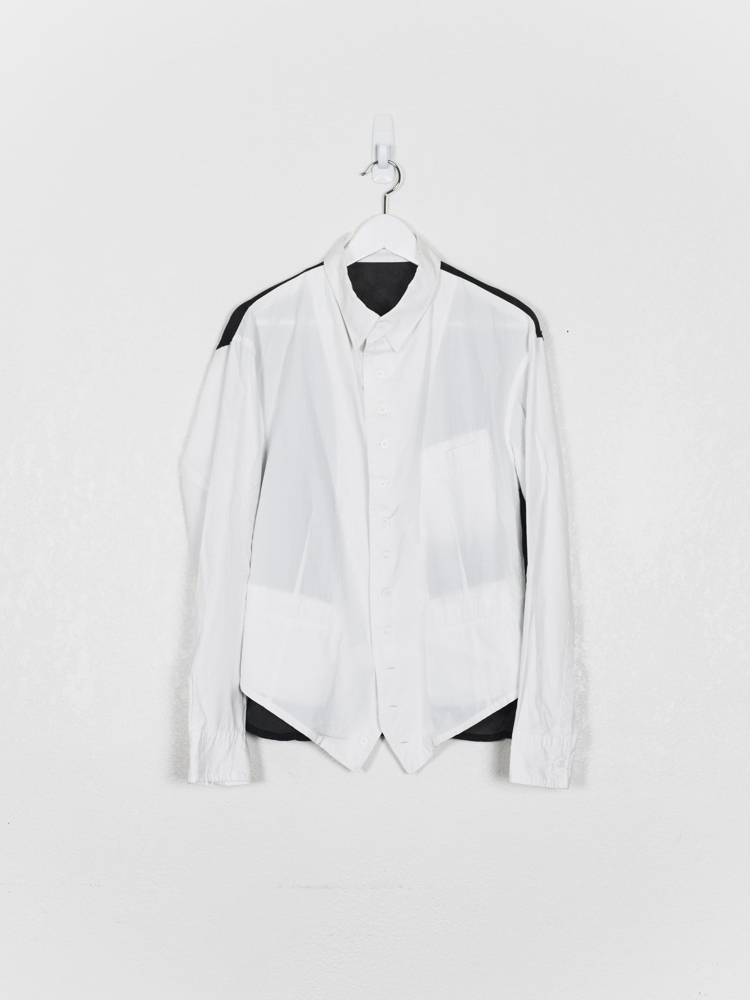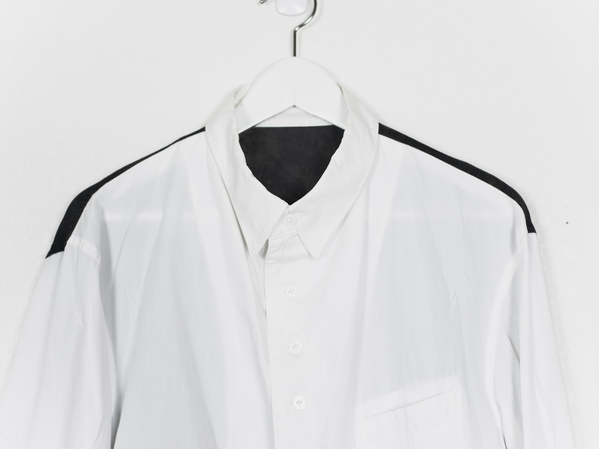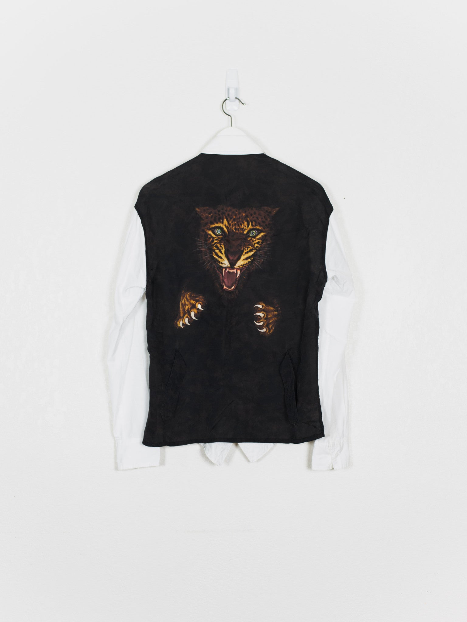 White A shirt from Yohji Yamamoto’s Autumn/Winter 2009 Menswear collection, which featured animal prints on silky fabrics in addition to his usual all black and paired pajamas with tailored suiting to invite a fresh and playful juxtaposition of how we dress inside and outside. This piece cleverly encapsulates the contrast found in this collection. The front is a formal white cotton shirt, complete with an extra dense front button closure, angled chest pocket, a darted body, and waist pockets, while the back is a bold 100% cupro panel with the print of a manic tiger baring its fangs and claws.