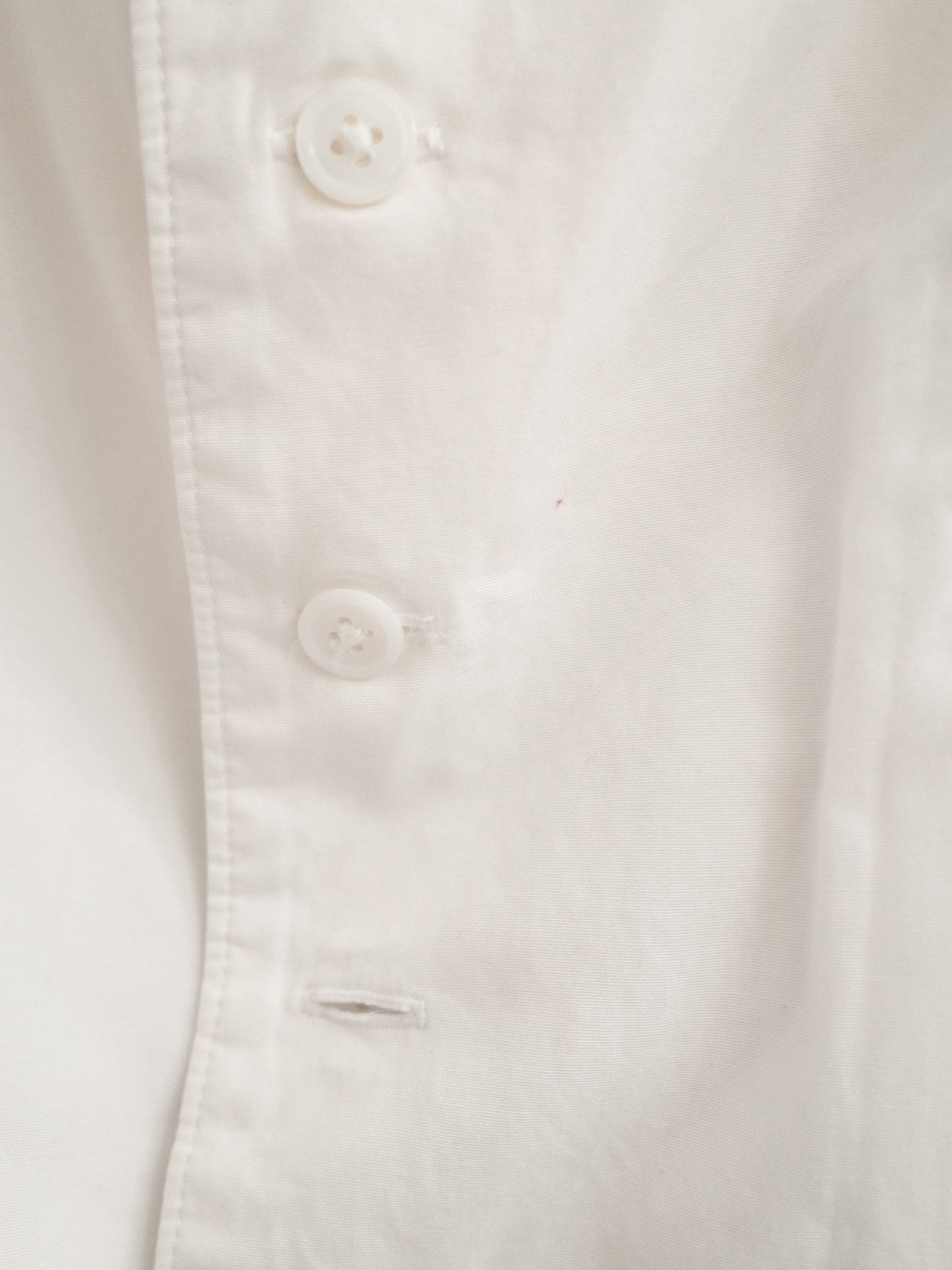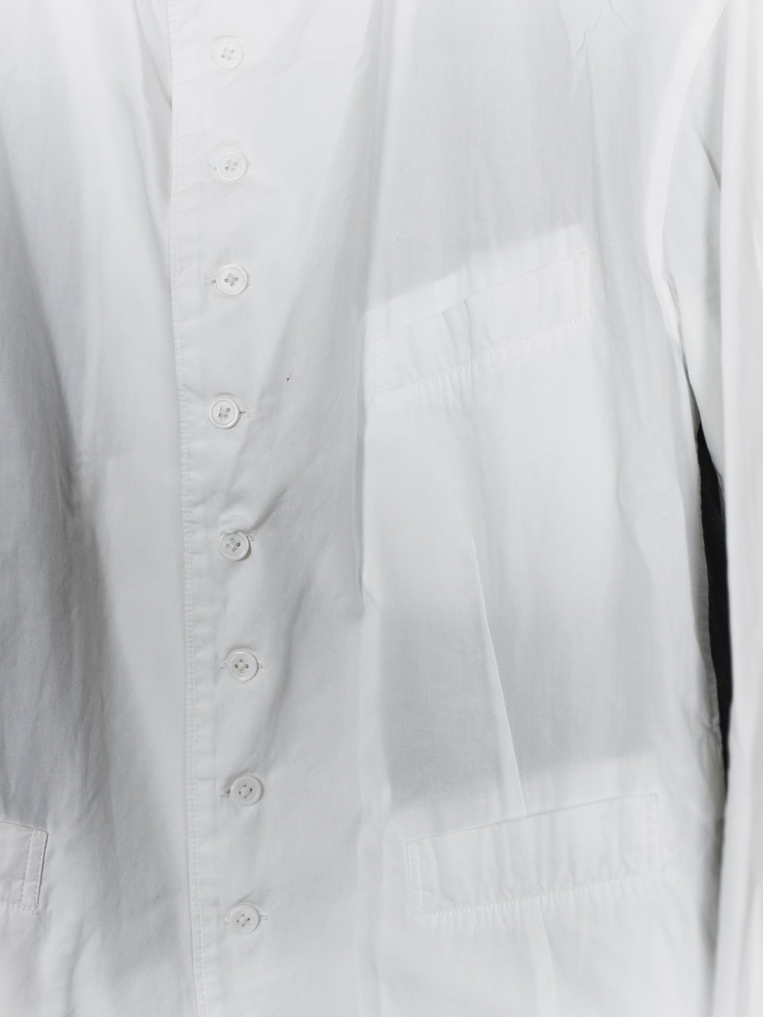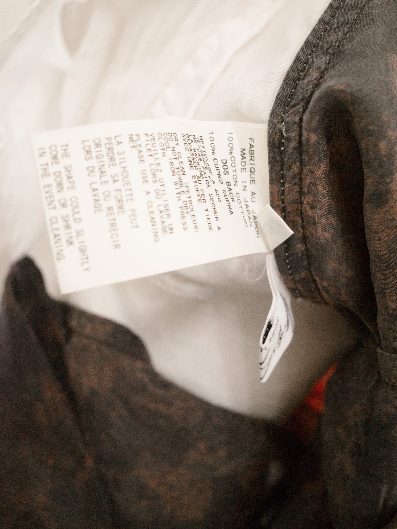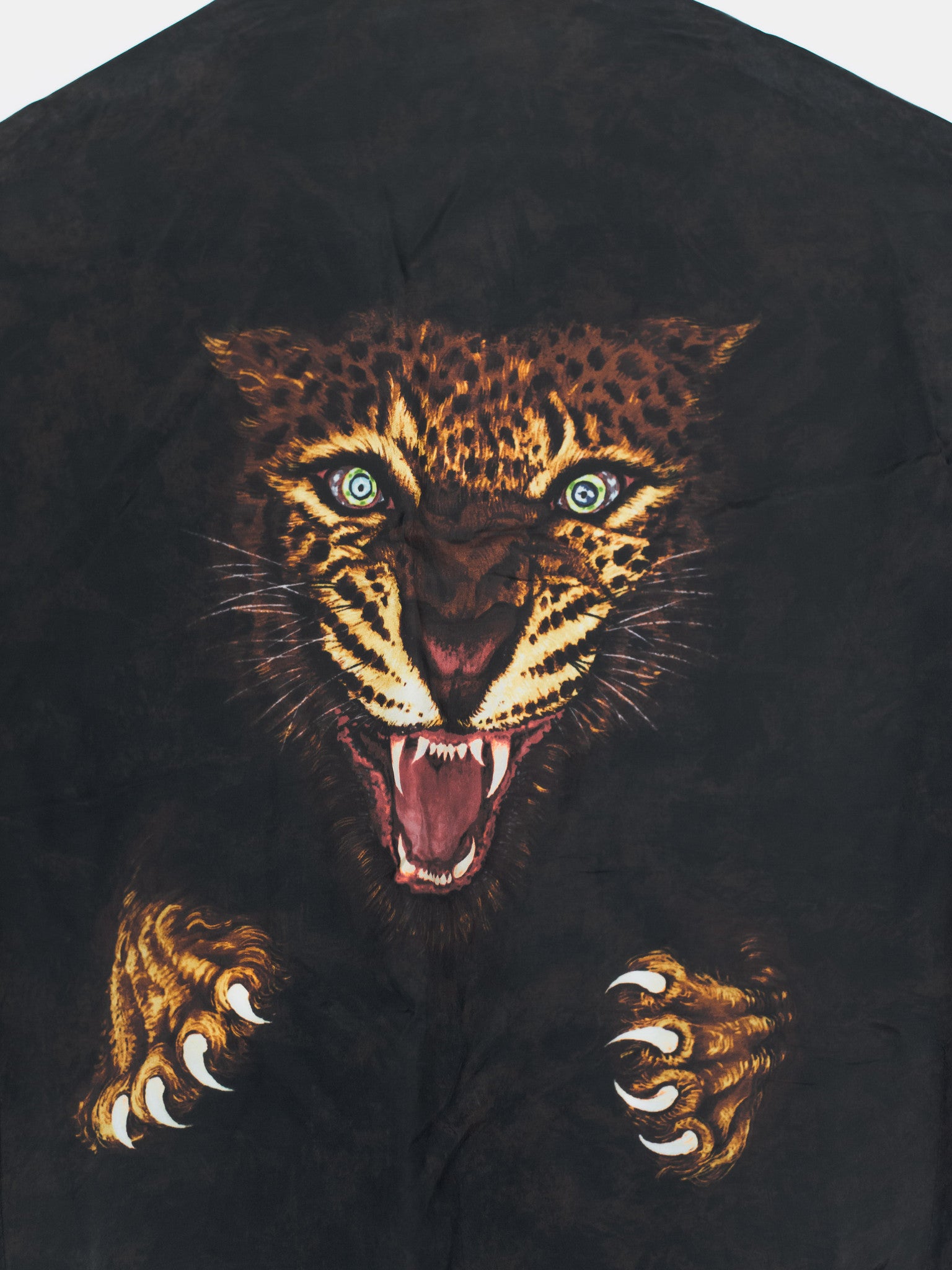 White A shirt from Yohji Yamamoto’s Autumn/Winter 2009 Menswear collection, which featured animal prints on silky fabrics in addition to his usual all black and paired pajamas with tailored suiting to invite a fresh and playful juxtaposition of how we dress inside and outside. This piece cleverly encapsulates the contrast found in this collection. The front is a formal white cotton shirt, complete with an extra dense front button closure, angled chest pocket, a darted body, and waist pockets, while the back is a bold 100% cupro panel with the print of a manic tiger baring its fangs and claws.