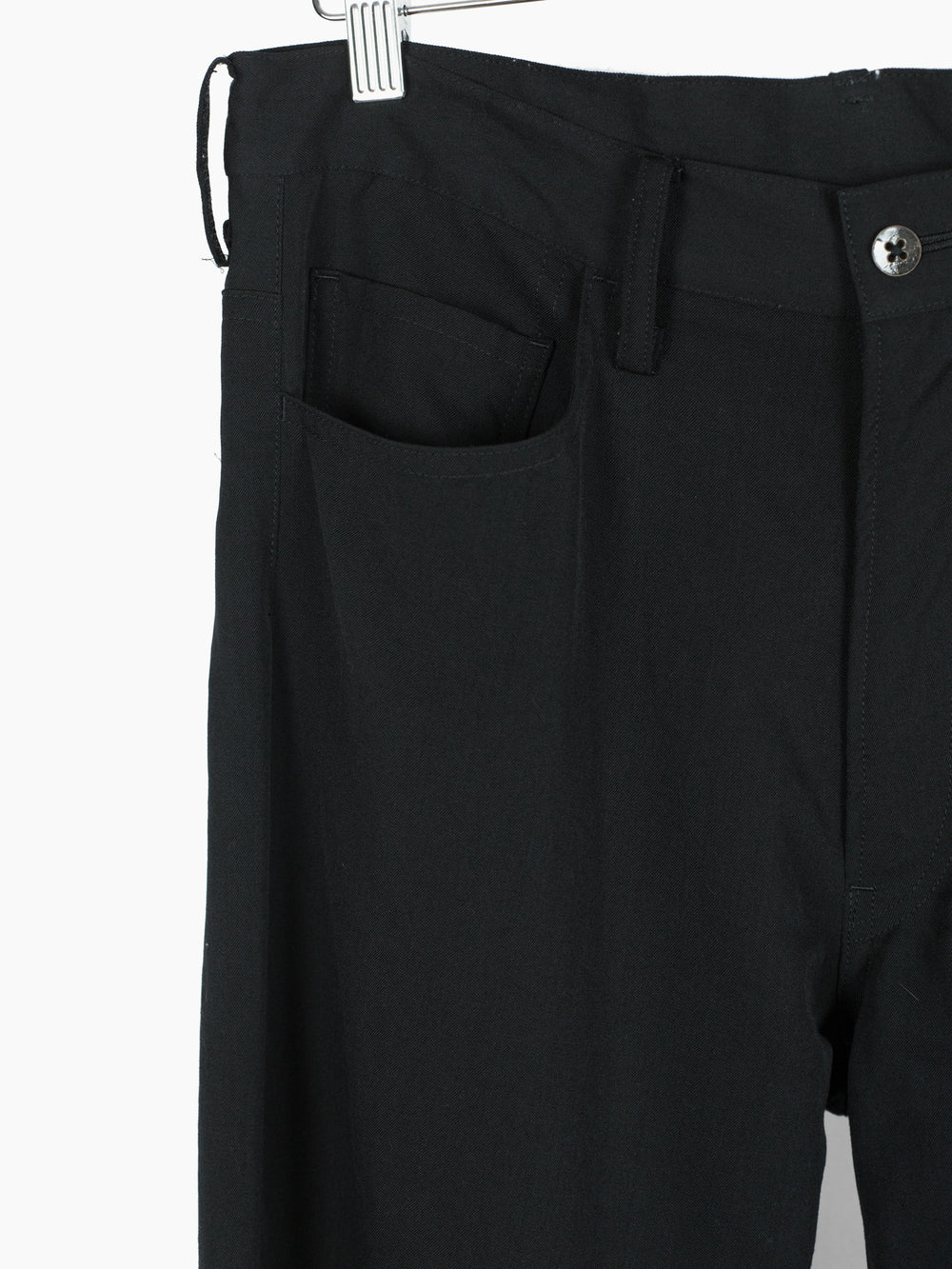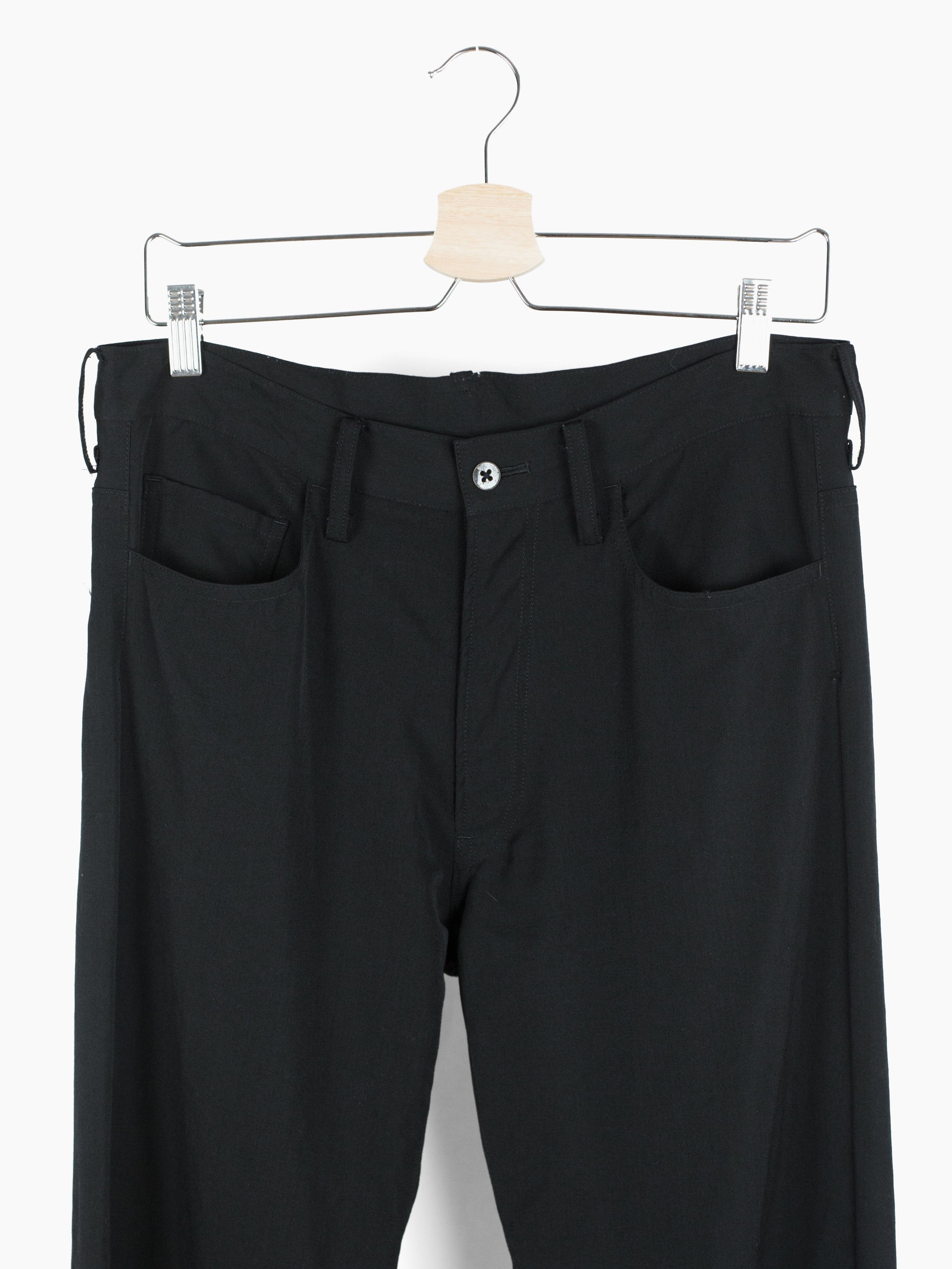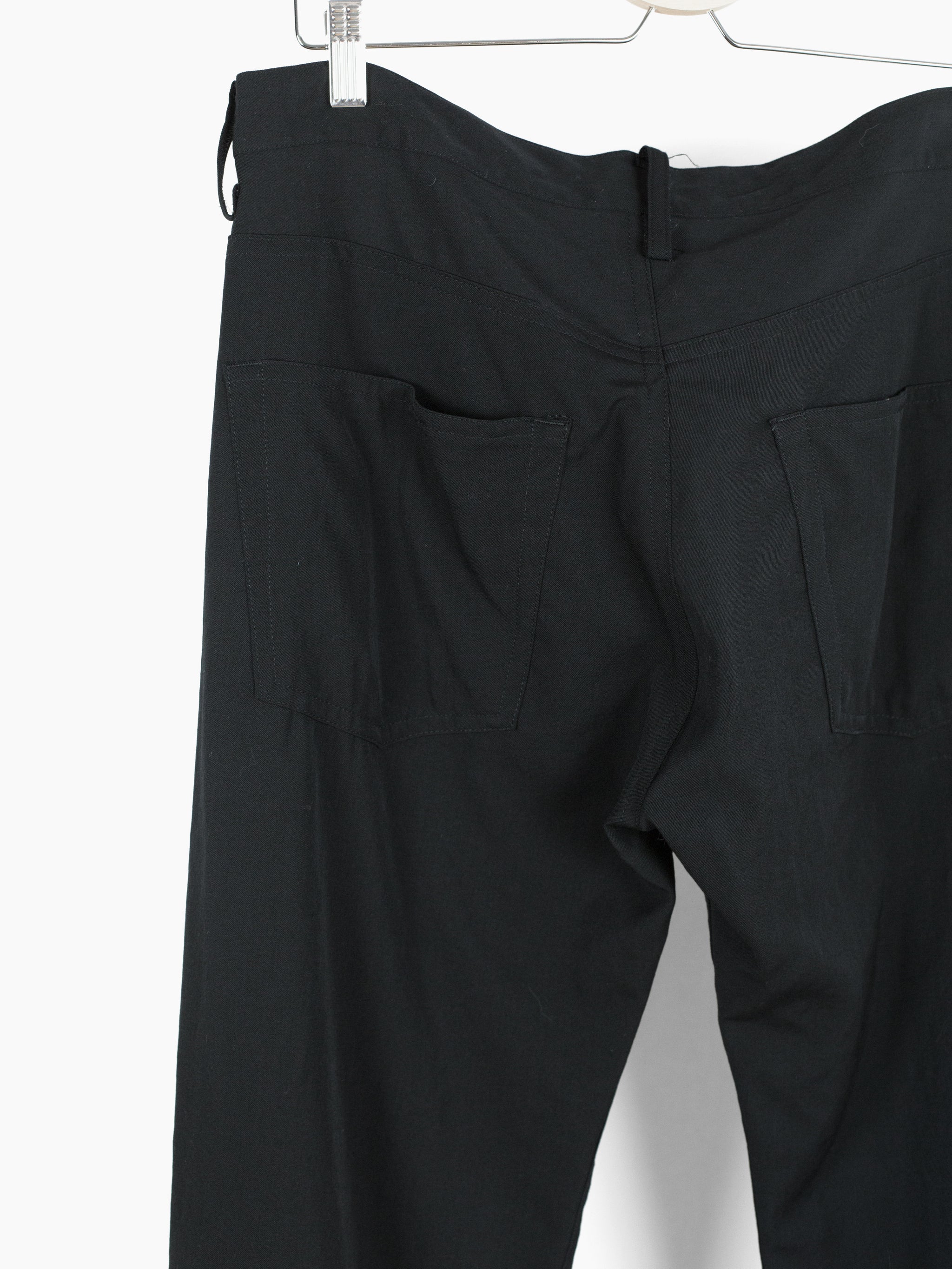 Masterful hybrid menswear piece combining the sleek drape of suiting gabardine with the body-hugging, svelte silhouette of a flared jean. J-style pockets and back yoke shape the pant to fit closer to the body around the hips and seat, with an extremely flattering slim-to-flared leg. This pair is cut in the older black wool gabardine that drapes more fluidly and has a smoother, suppler, and more luxurious hand than recent batches and is lined down to the knee in silky cupro.