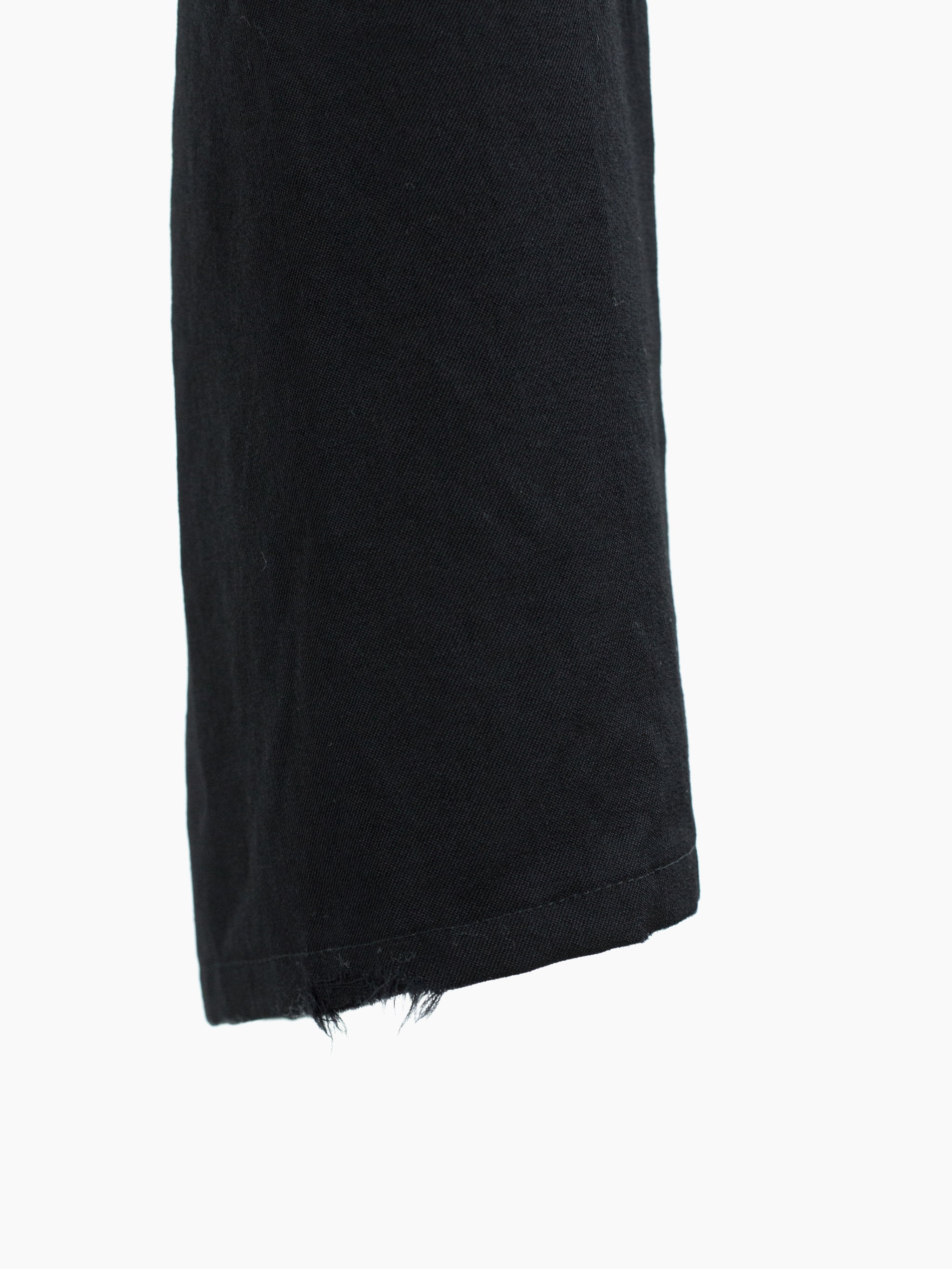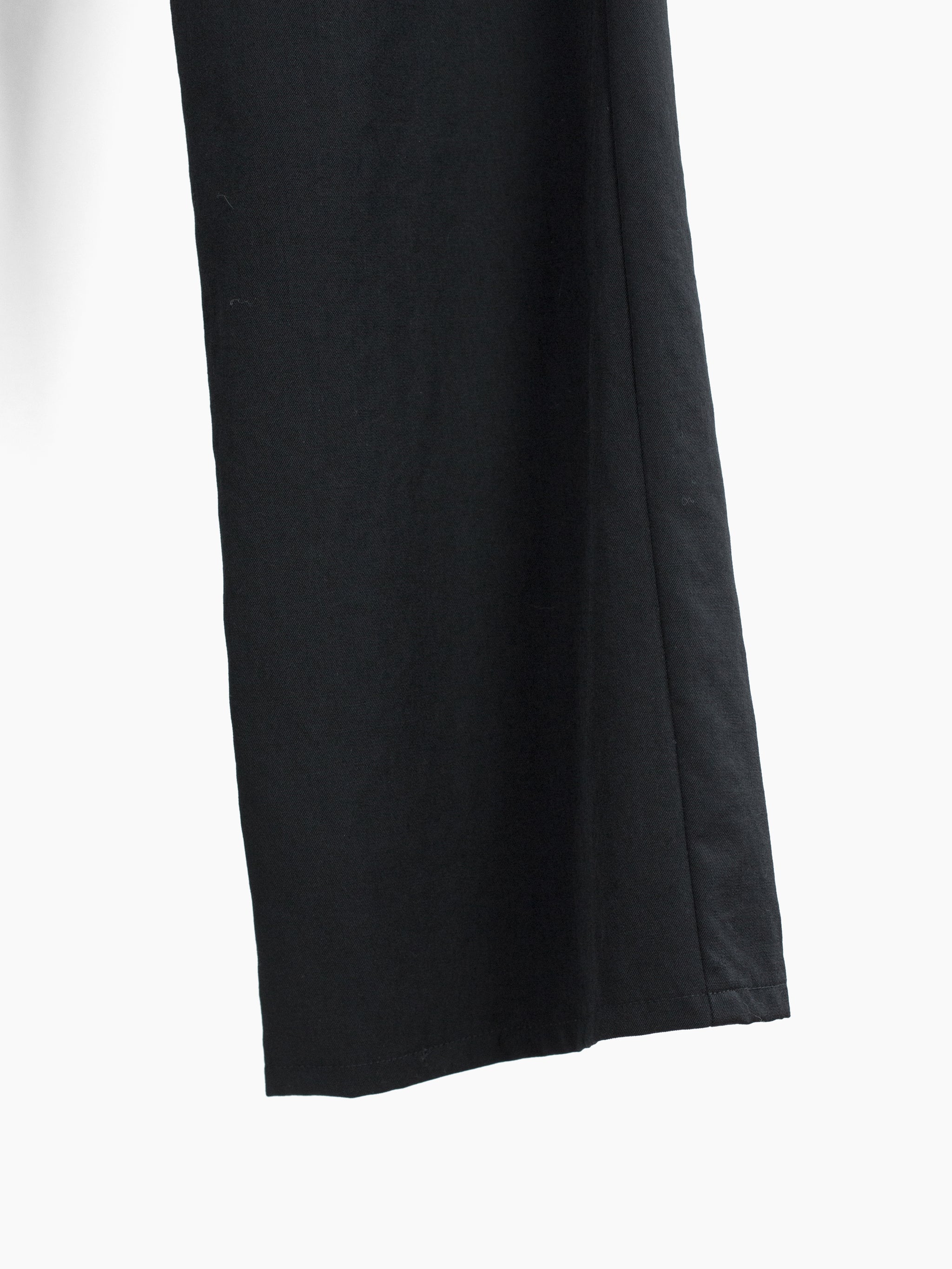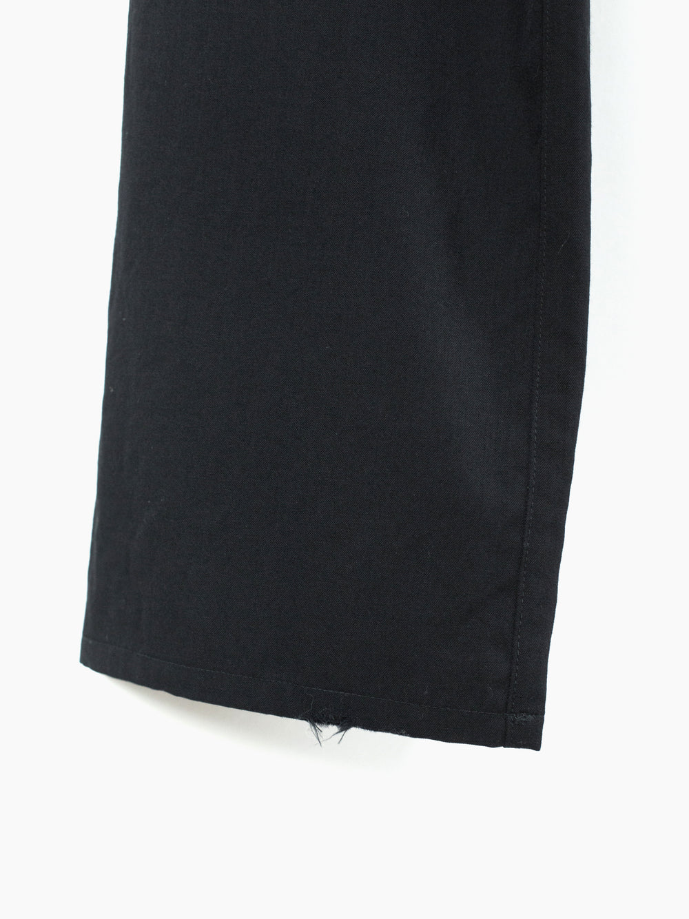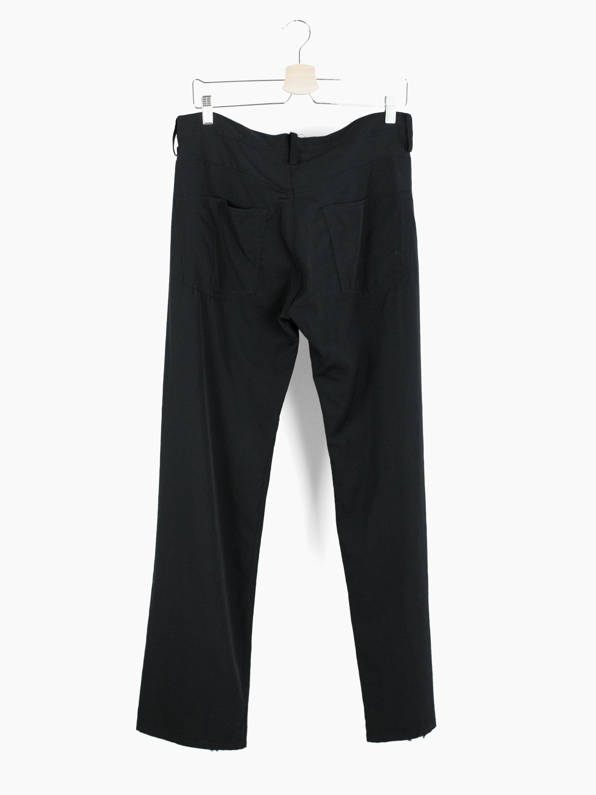 Masterful hybrid menswear piece combining the sleek drape of suiting gabardine with the body-hugging, svelte silhouette of a flared jean. J-style pockets and back yoke shape the pant to fit closer to the body around the hips and seat, with an extremely flattering slim-to-flared leg. This pair is cut in the older black wool gabardine that drapes more fluidly and has a smoother, suppler, and more luxurious hand than recent batches and is lined down to the knee in silky cupro.