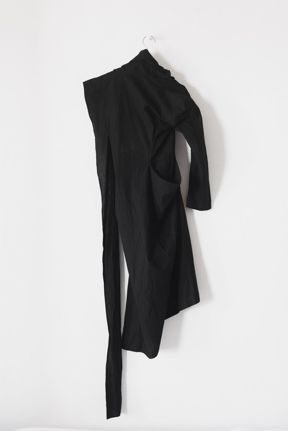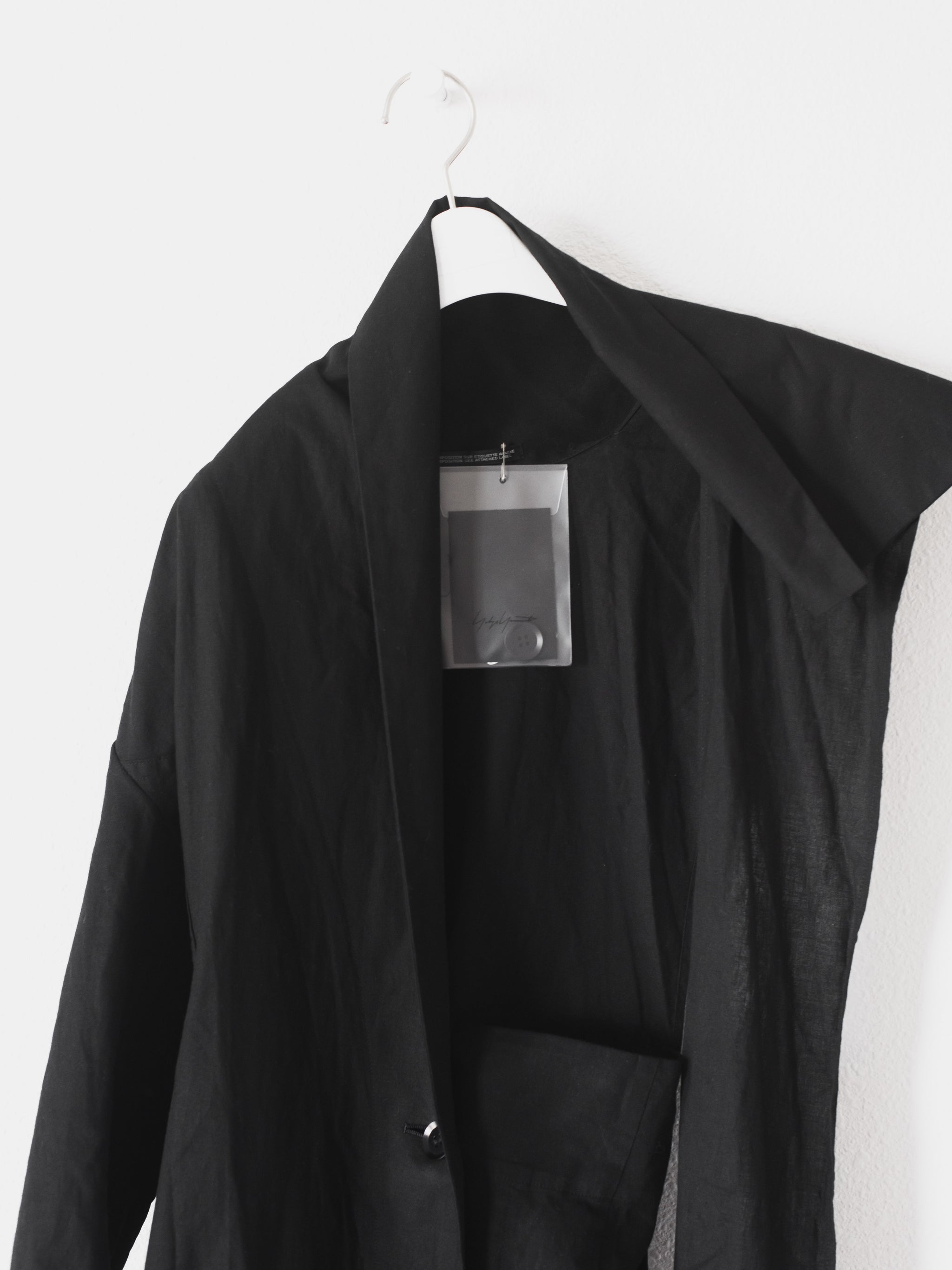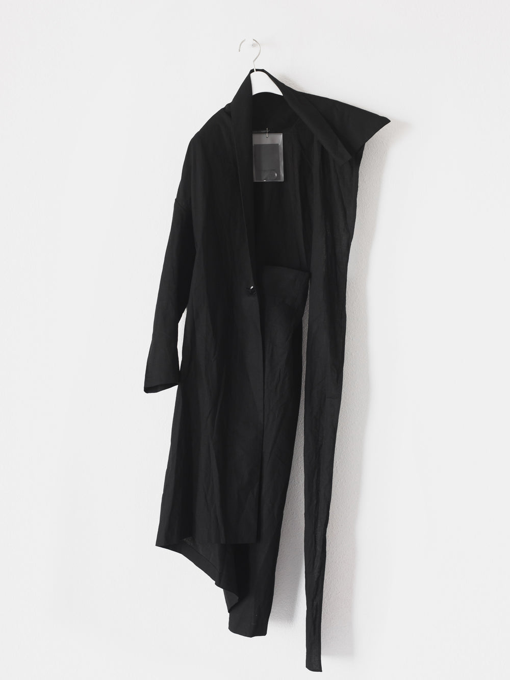 Incredible and unique spring coat with a full length right sleeve traditional shawl collar deconstructing into a long stole wrap that can be worn in numerous configurations as a bandeau top, arm sleeve, choker, or left to hang. Can also be worn as a slitted gown.