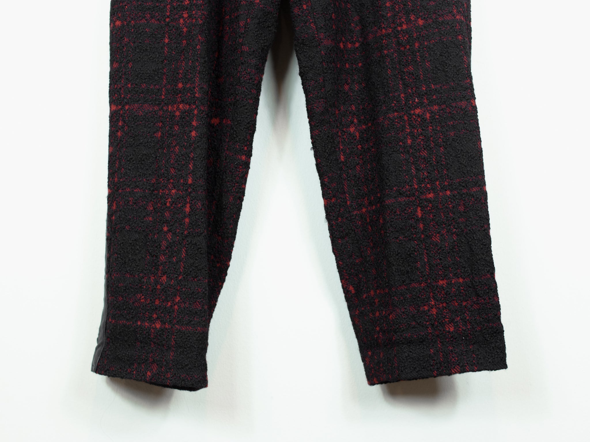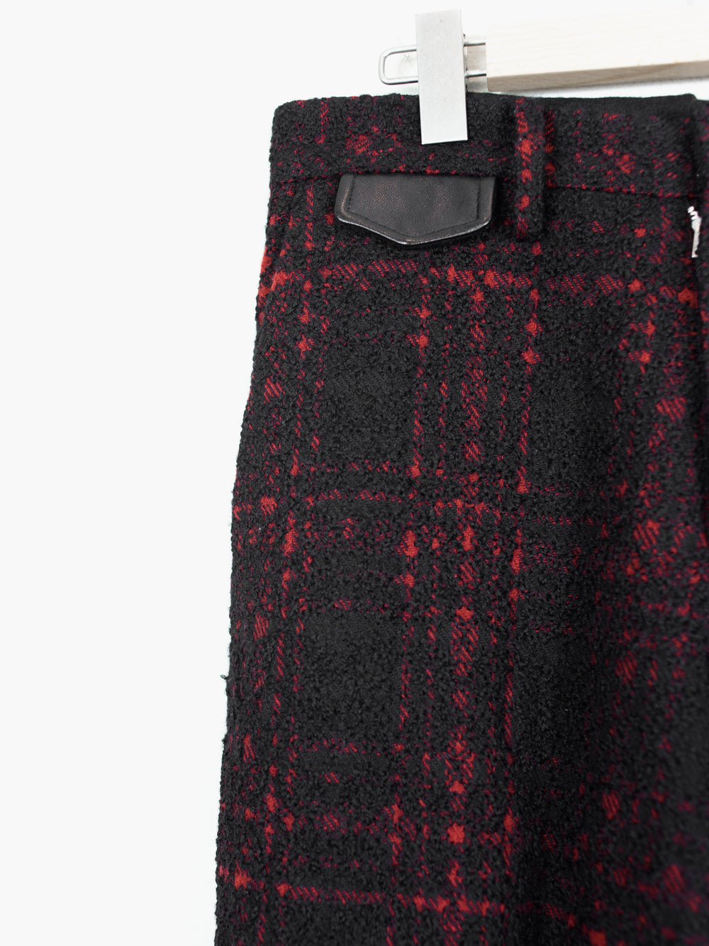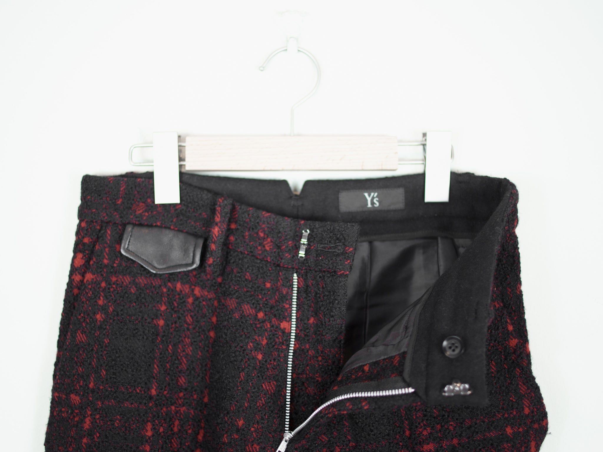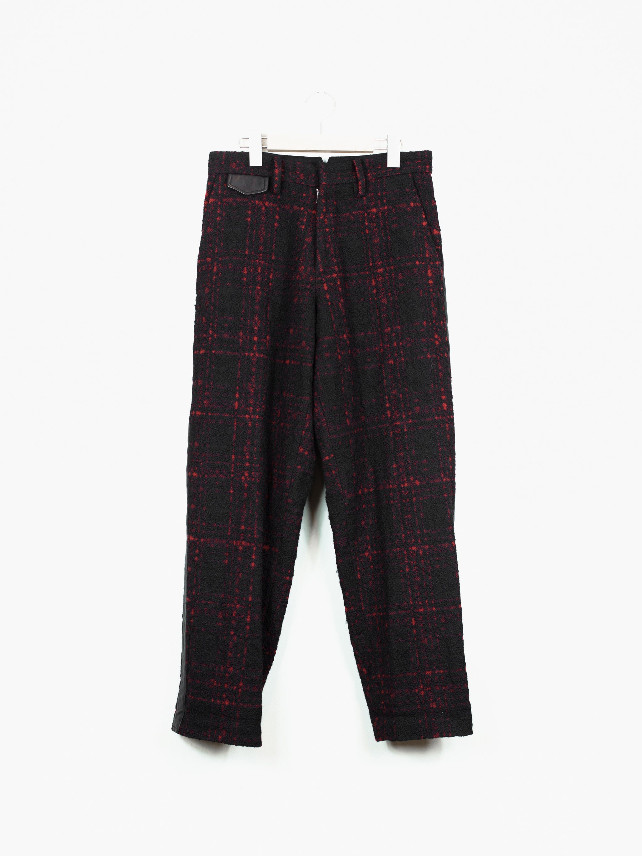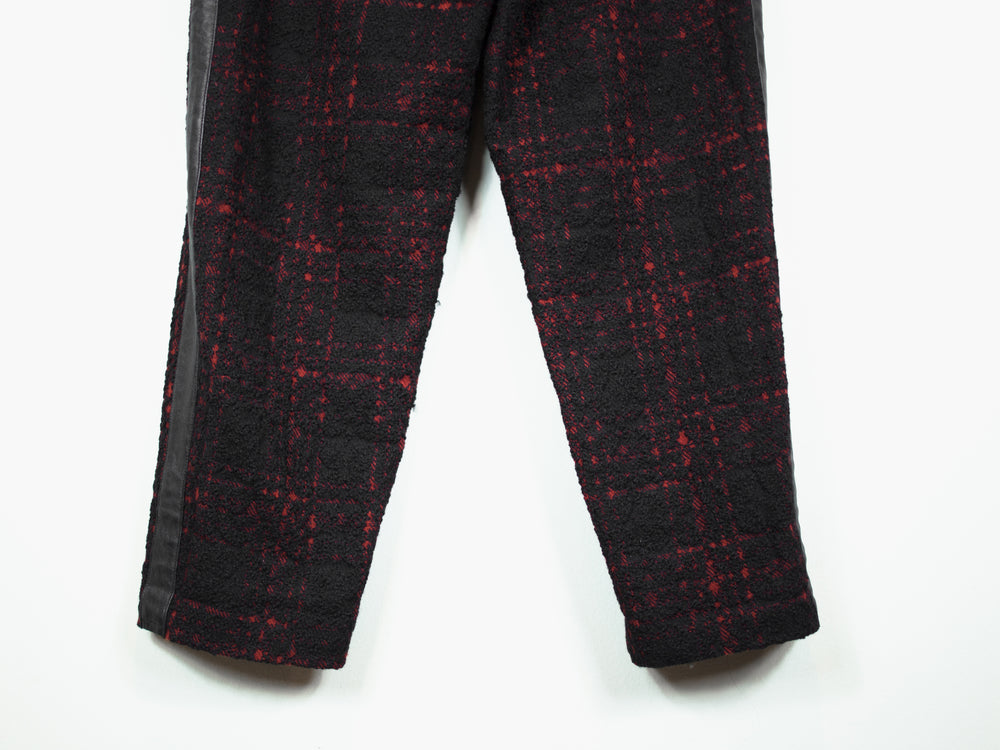 Black/Red A rare sample pair of pleated trousers by Y's Yohji Yamamoto, featuring a dramatic red/black woven face fabric reminiscent of a shadow plaid. Cut with a high rise, these pants sit at your natural waist and have a wider top block that tapers for a refined silhouette. They're punctuated with leather detailing along the outseam and above a coin pocket that's been tucked under the waistband. Lined to the knee in what feels like a silky smooth polyester and finished with a zipper fly and two flap-closed back pockets.