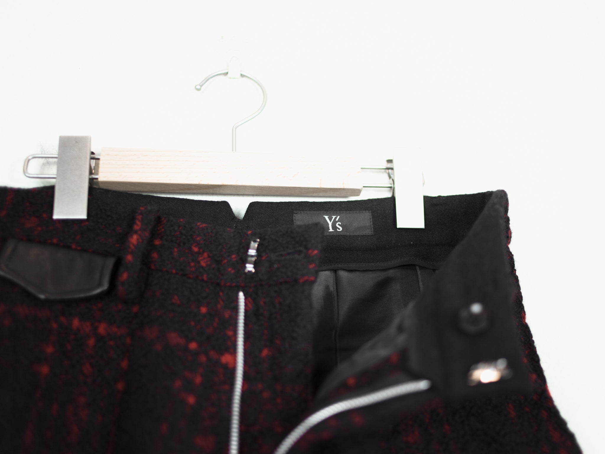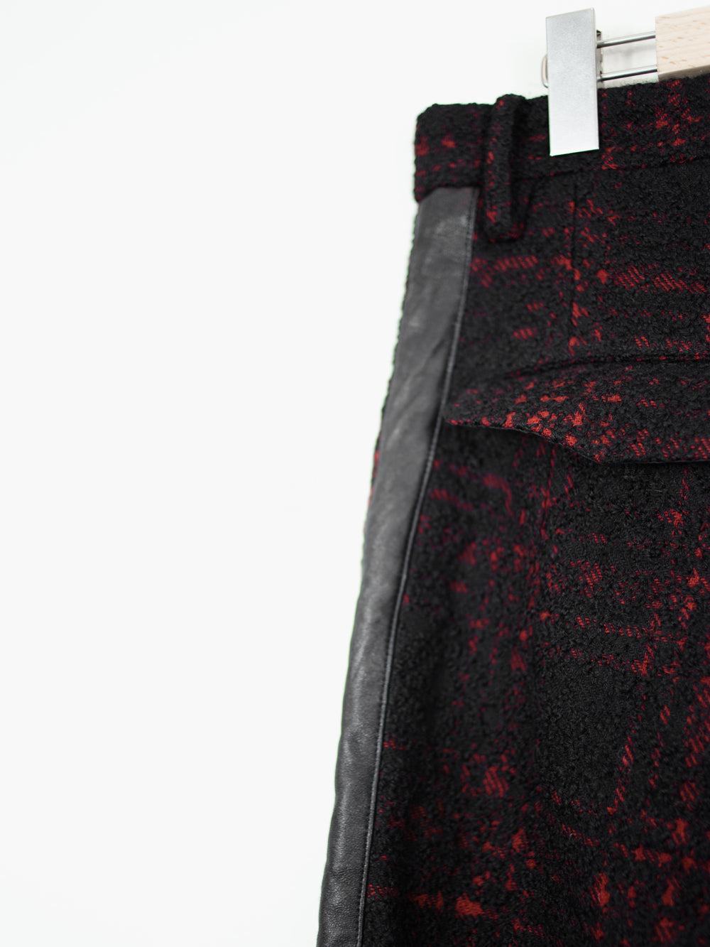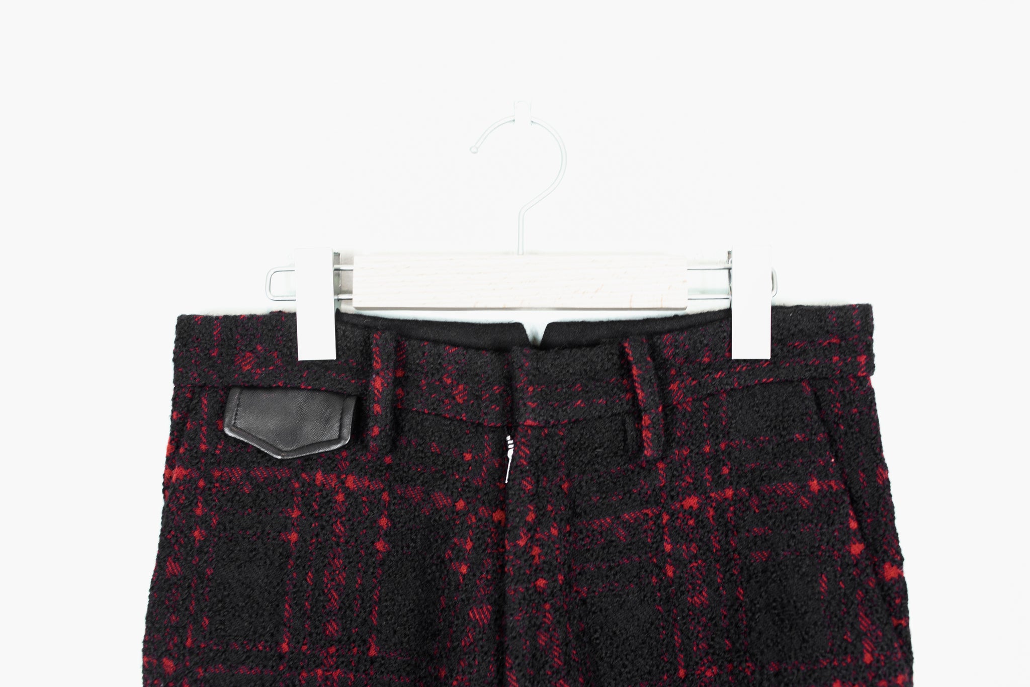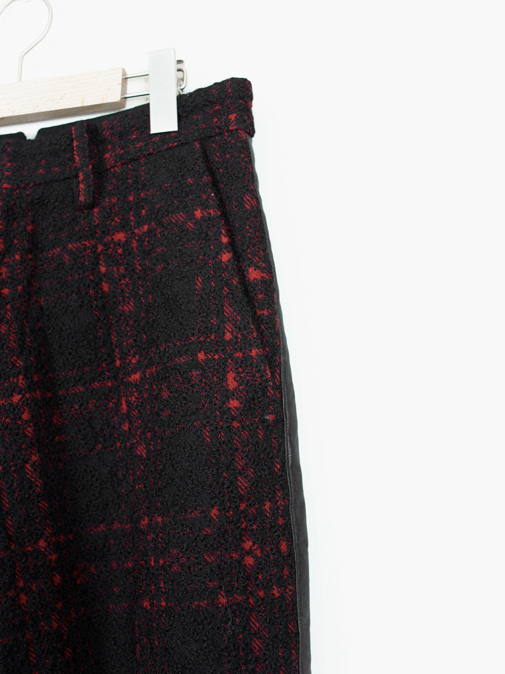 Black/Red A rare sample pair of pleated trousers by Y's Yohji Yamamoto, featuring a dramatic red/black woven face fabric reminiscent of a shadow plaid. Cut with a high rise, these pants sit at your natural waist and have a wider top block that tapers for a refined silhouette. They're punctuated with leather detailing along the outseam and above a coin pocket that's been tucked under the waistband. Lined to the knee in what feels like a silky smooth polyester and finished with a zipper fly and two flap-closed back pockets.