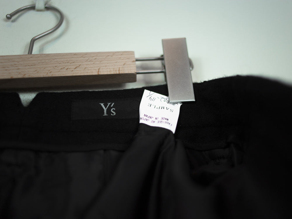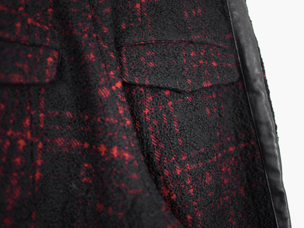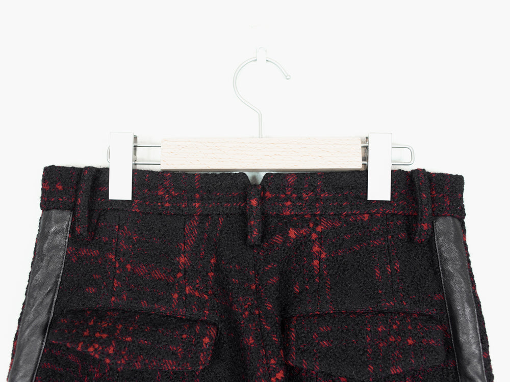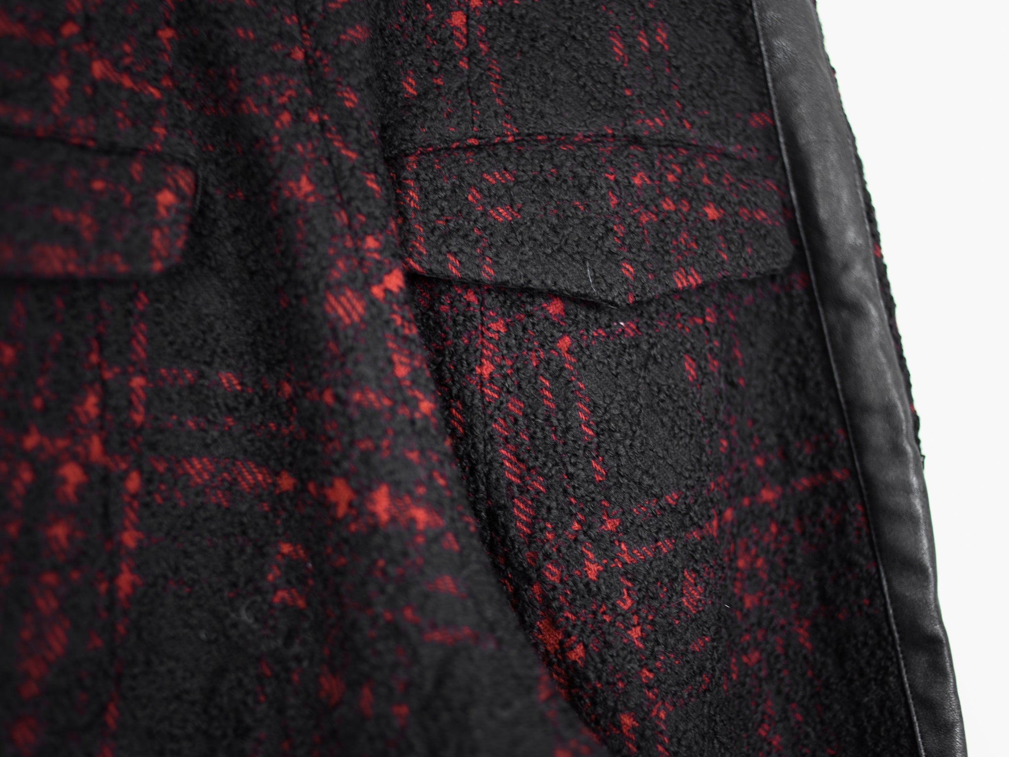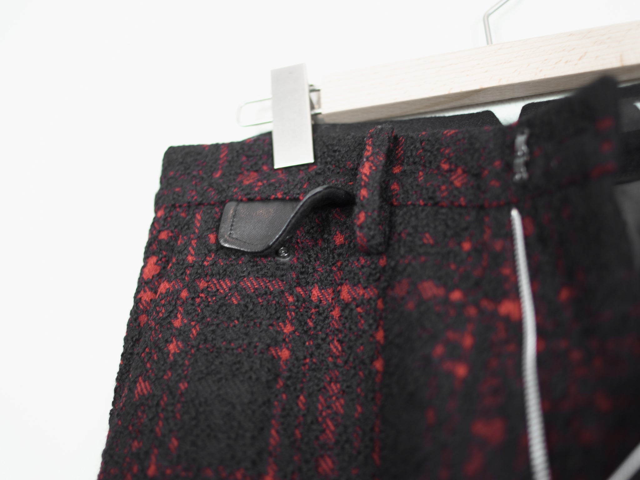 Black/Red A rare sample pair of pleated trousers by Y's Yohji Yamamoto, featuring a dramatic red/black woven face fabric reminiscent of a shadow plaid. Cut with a high rise, these pants sit at your natural waist and have a wider top block that tapers for a refined silhouette. They're punctuated with leather detailing along the outseam and above a coin pocket that's been tucked under the waistband. Lined to the knee in what feels like a silky smooth polyester and finished with a zipper fly and two flap-closed back pockets.