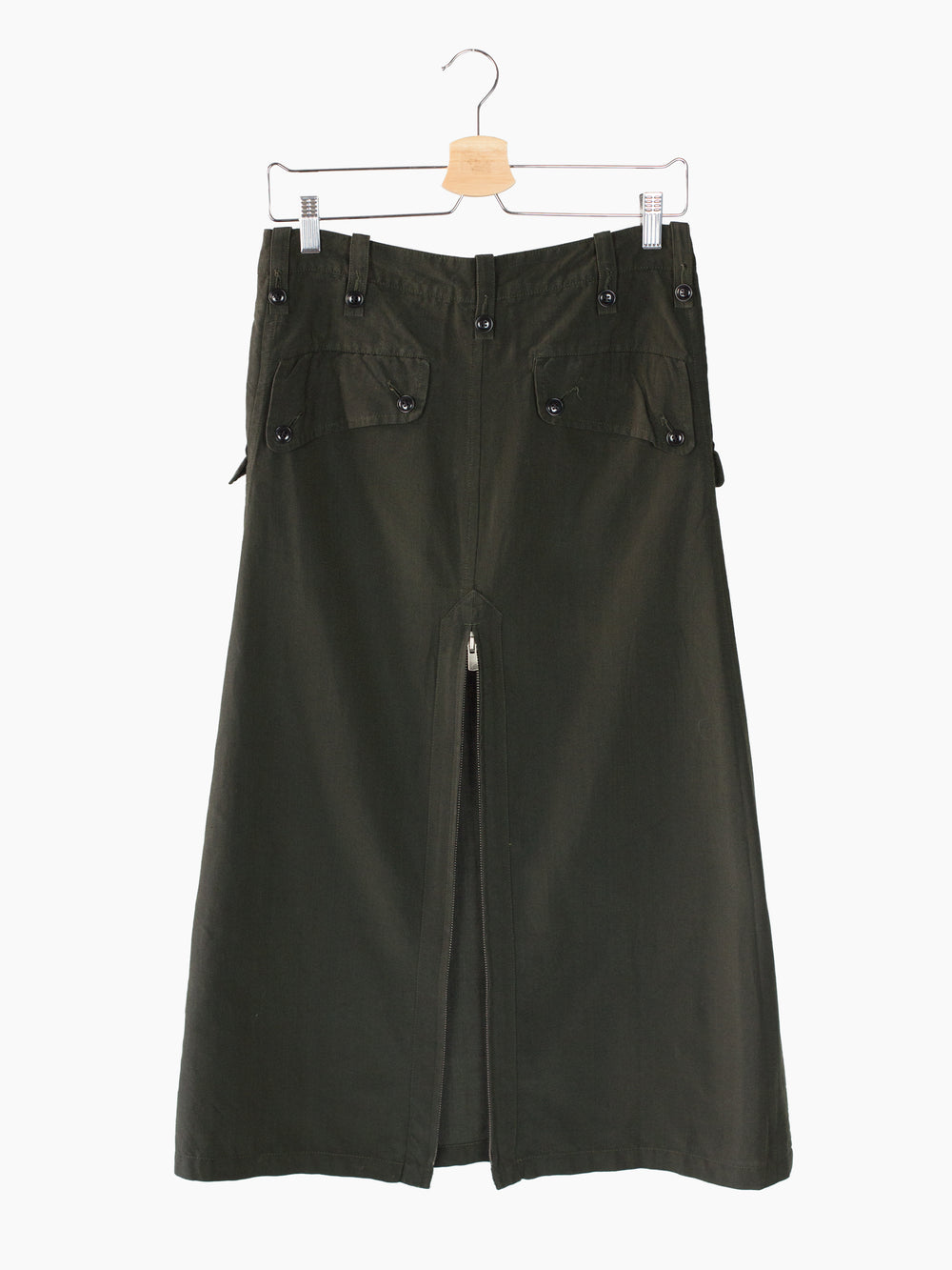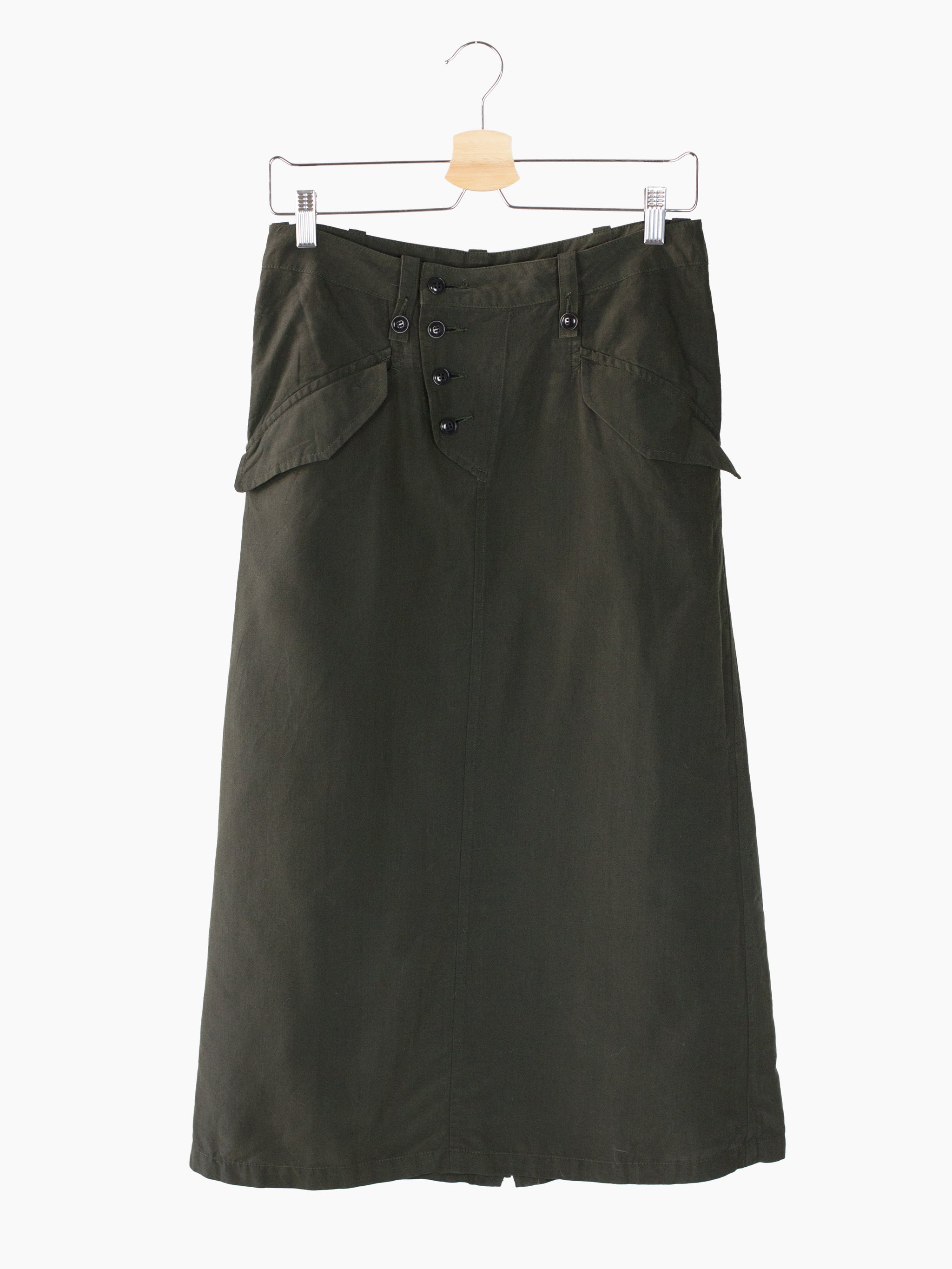 Lightweight cotton-cupro skirt from Y's, featuring an array of military-inspired details like asymmetrical exposed button fly, angled flap front pockets, and button-secured belt loops. Irregularly colored yarns create a visually rich shade of dark olive with a slight sateen finish. Back features excella zippered openable vent for a range of looks and silhouettes.