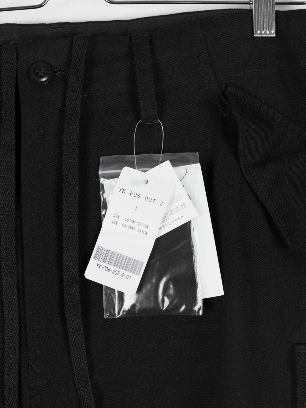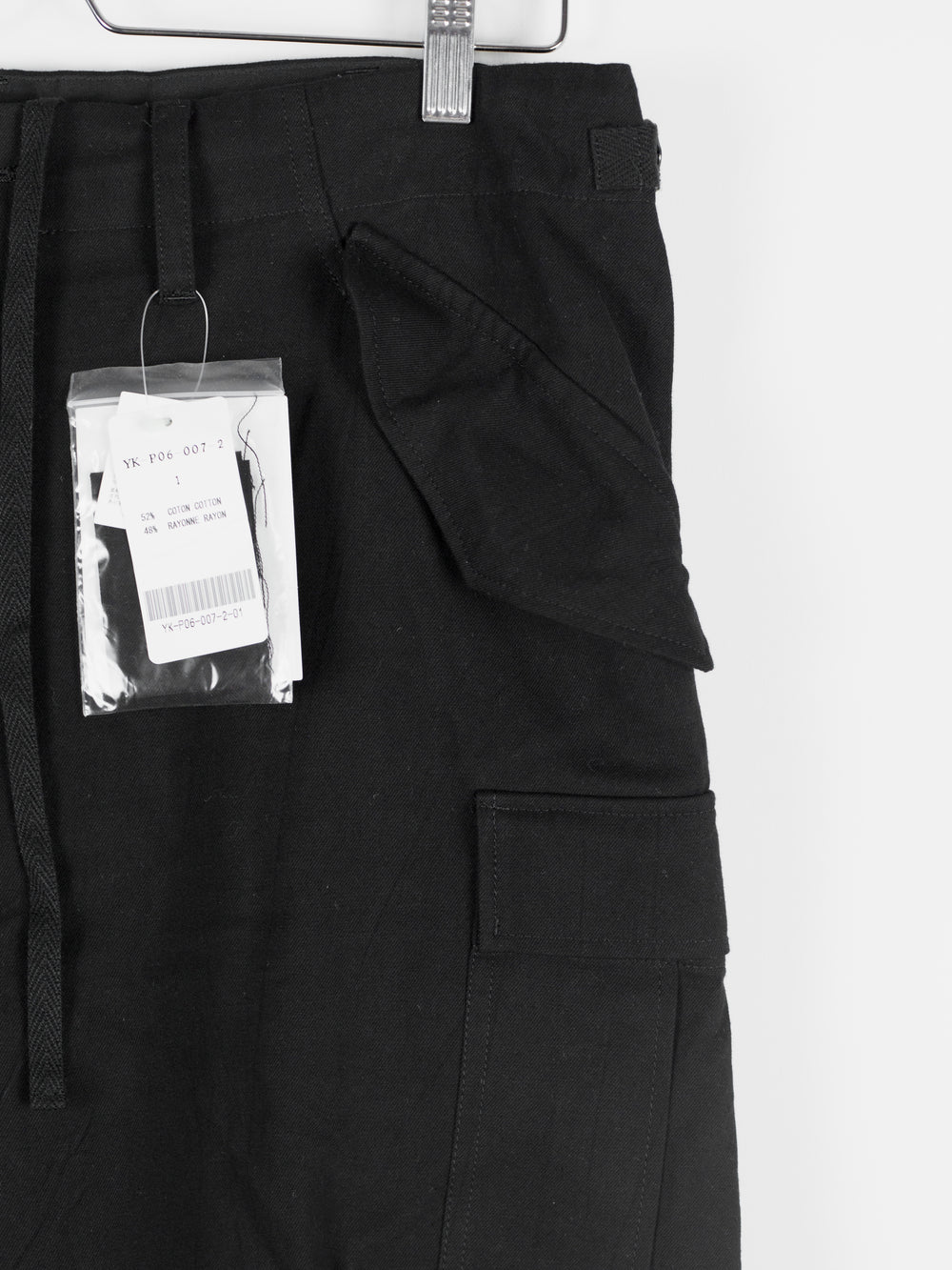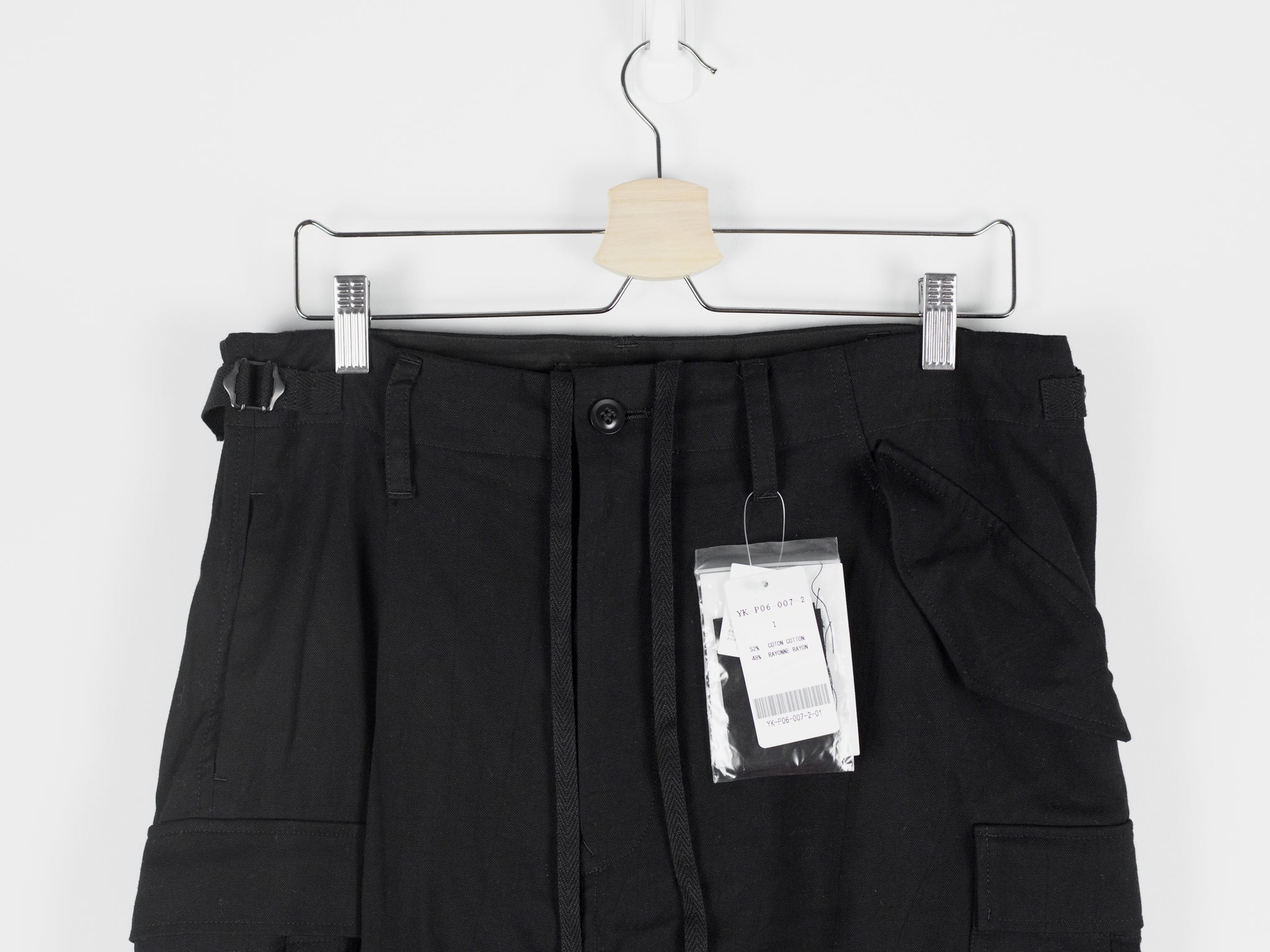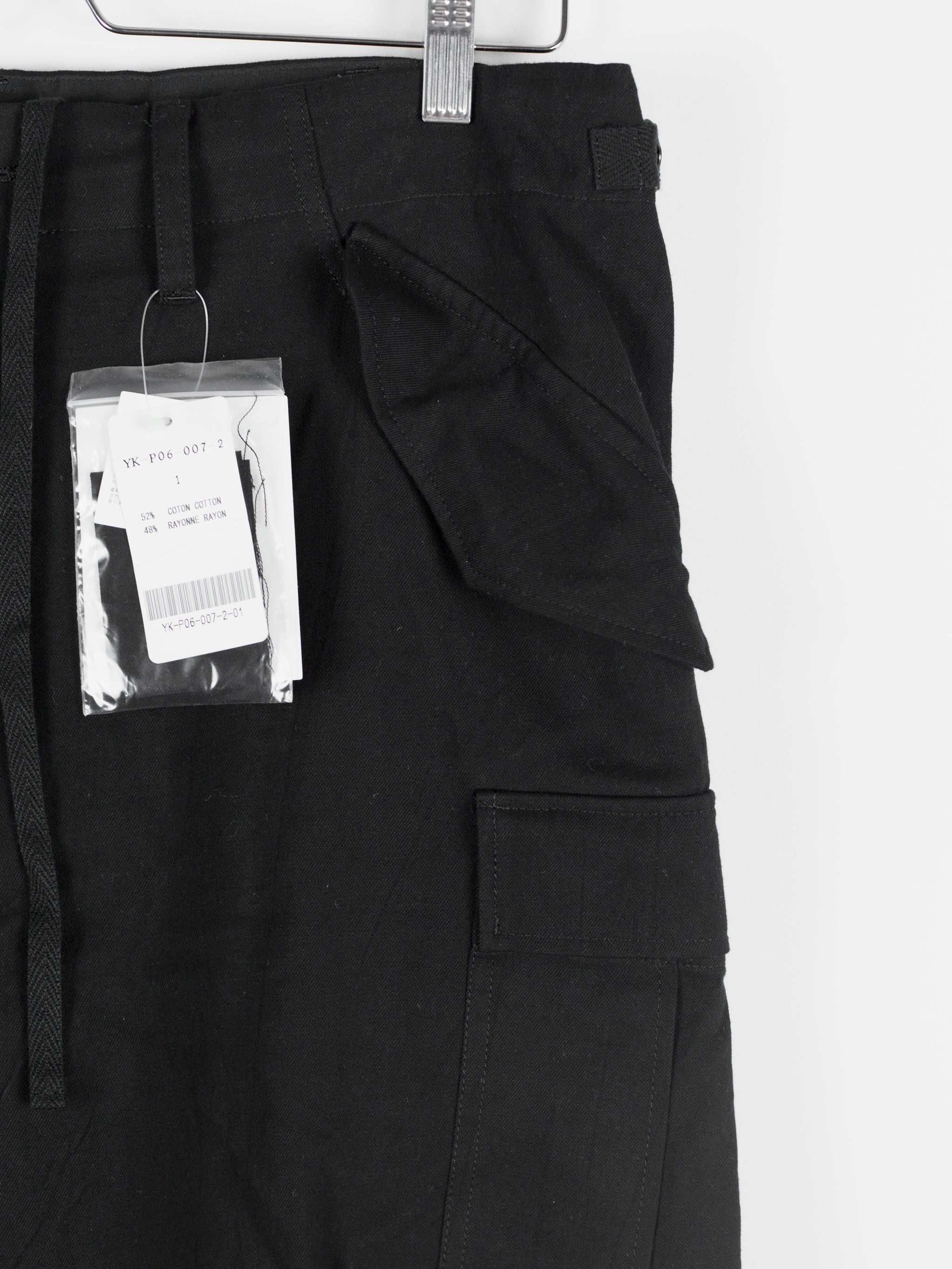 Yohji Yamamoto uses a more summer-suitable cotton-rayon blend in this cropped length wide leg cargo pant that features an asymmetrical design. The left and right sides use a different set of design details around the hip pockets and also different patterning on each leg. One side features a plain front leg while the other is pleated to create a silhouette that is more voluminous on one side than the other. Finished with string ties around the hem to alter the silhouette, knee articulation, and belt adjusters at the waist.