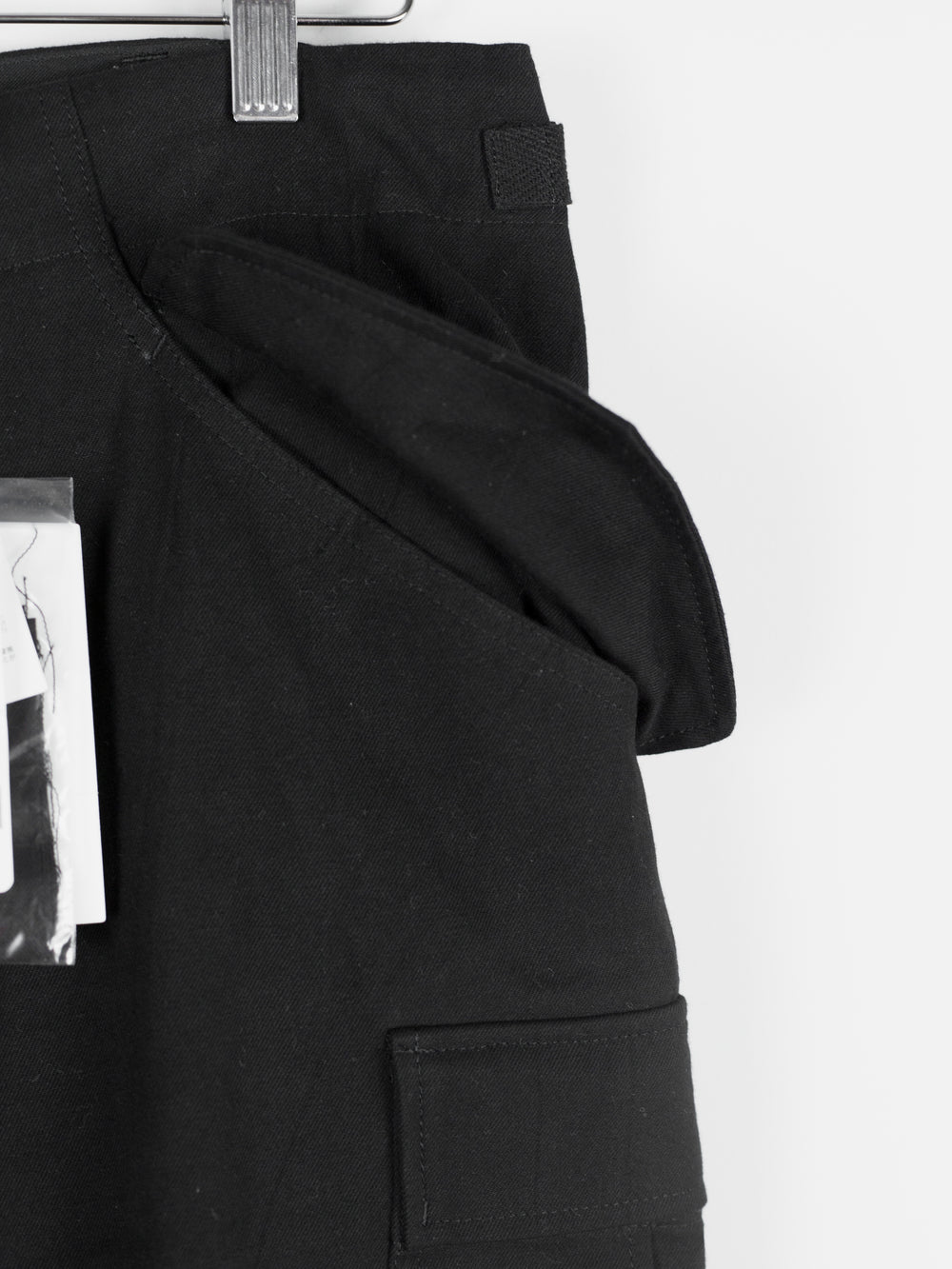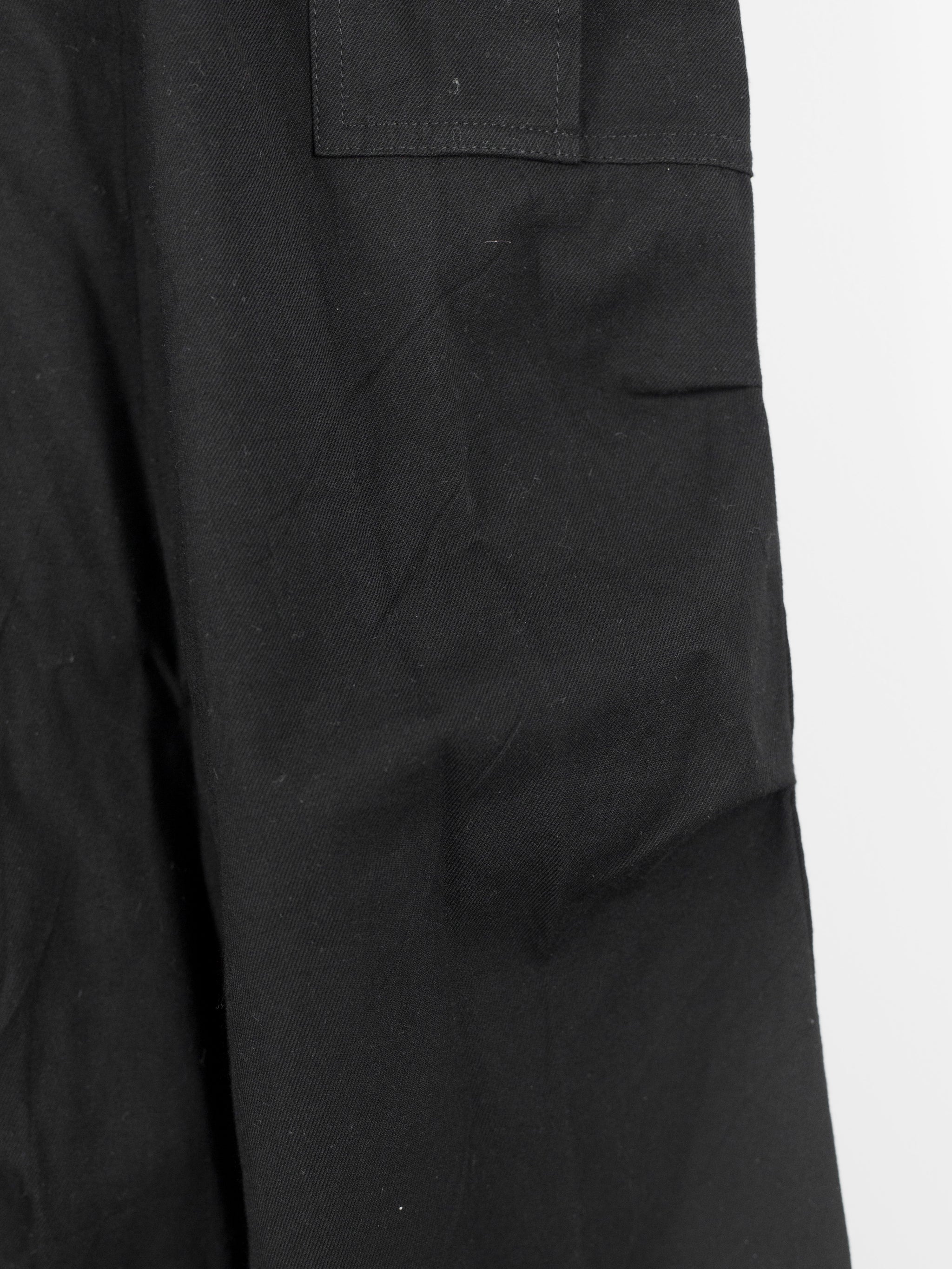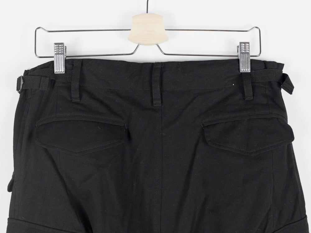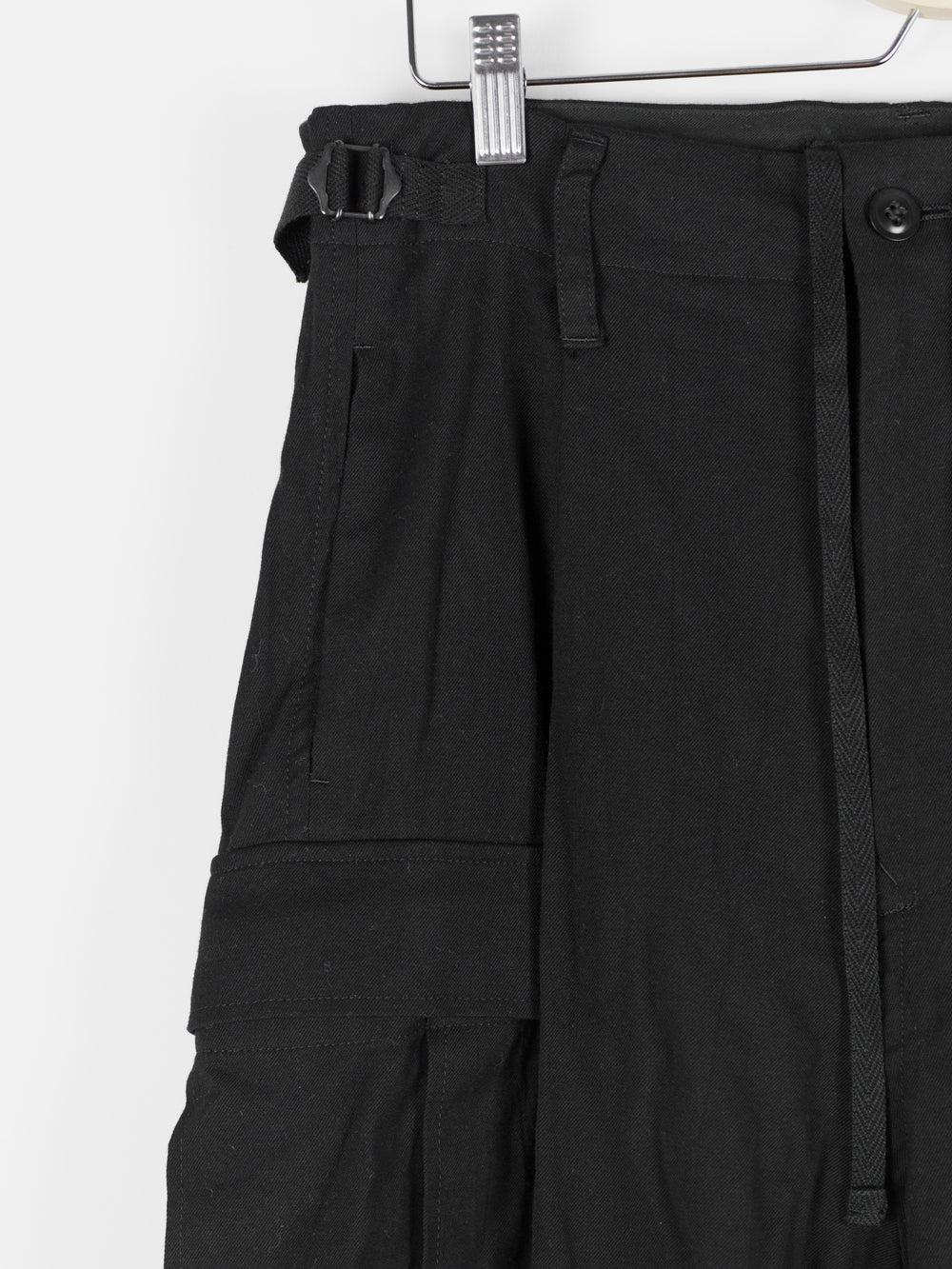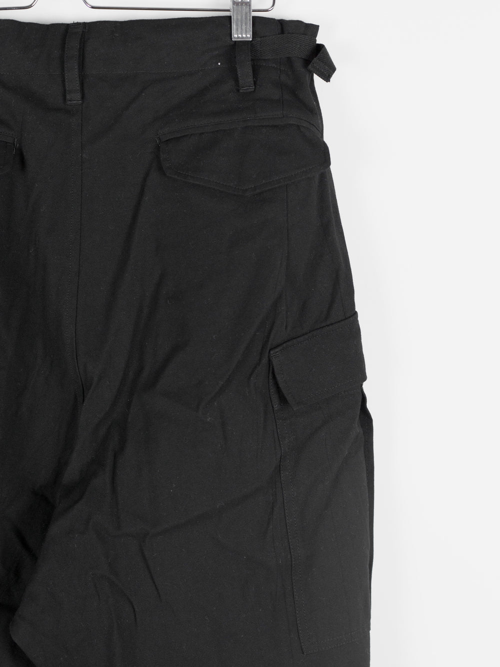 Yohji Yamamoto uses a more summer-suitable cotton-rayon blend in this cropped length wide leg cargo pant that features an asymmetrical design. The left and right sides use a different set of design details around the hip pockets and also different patterning on each leg. One side features a plain front leg while the other is pleated to create a silhouette that is more voluminous on one side than the other. Finished with string ties around the hem to alter the silhouette, knee articulation, and belt adjusters at the waist.