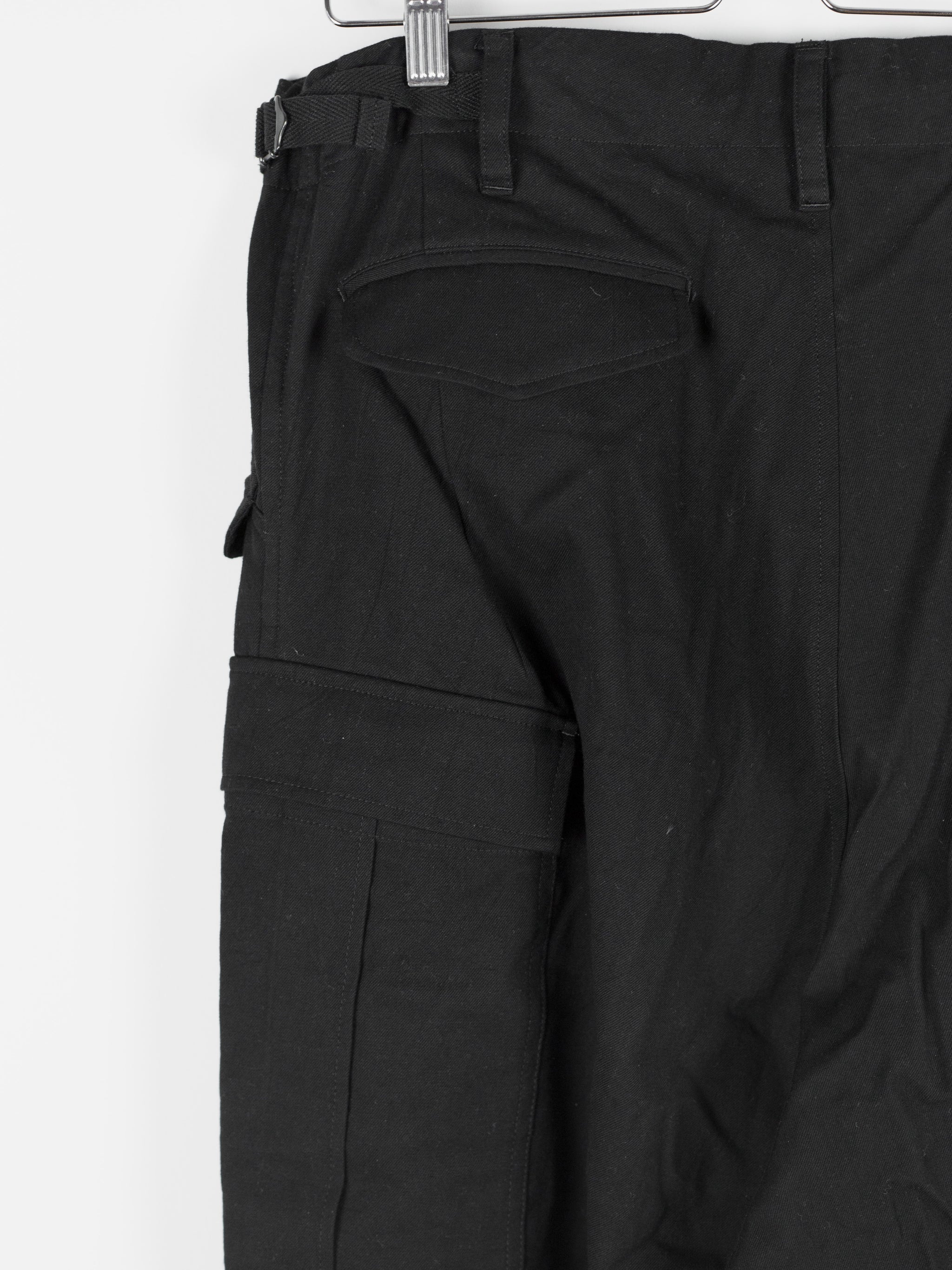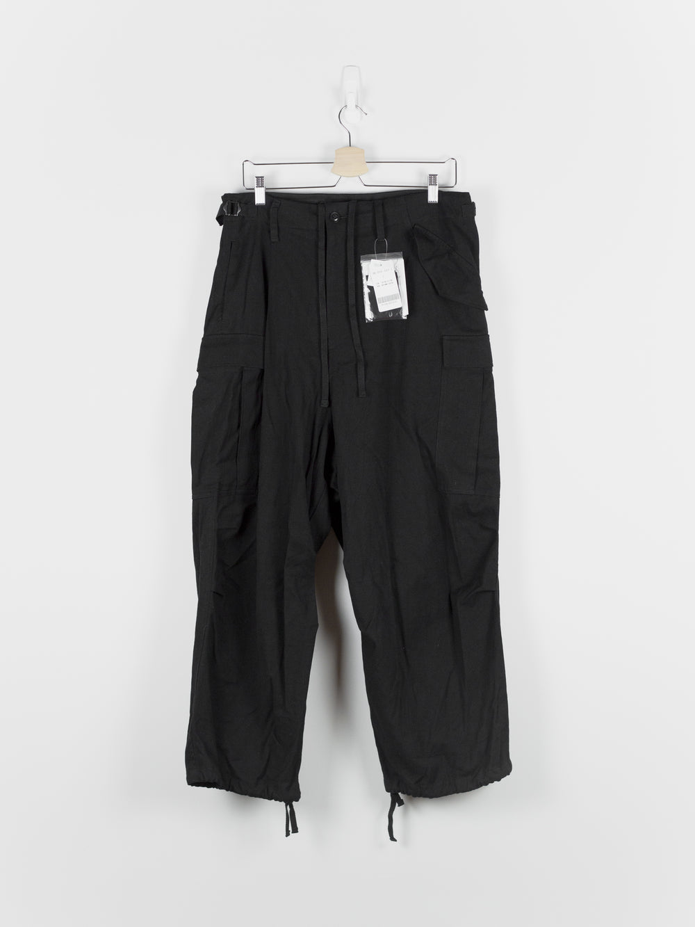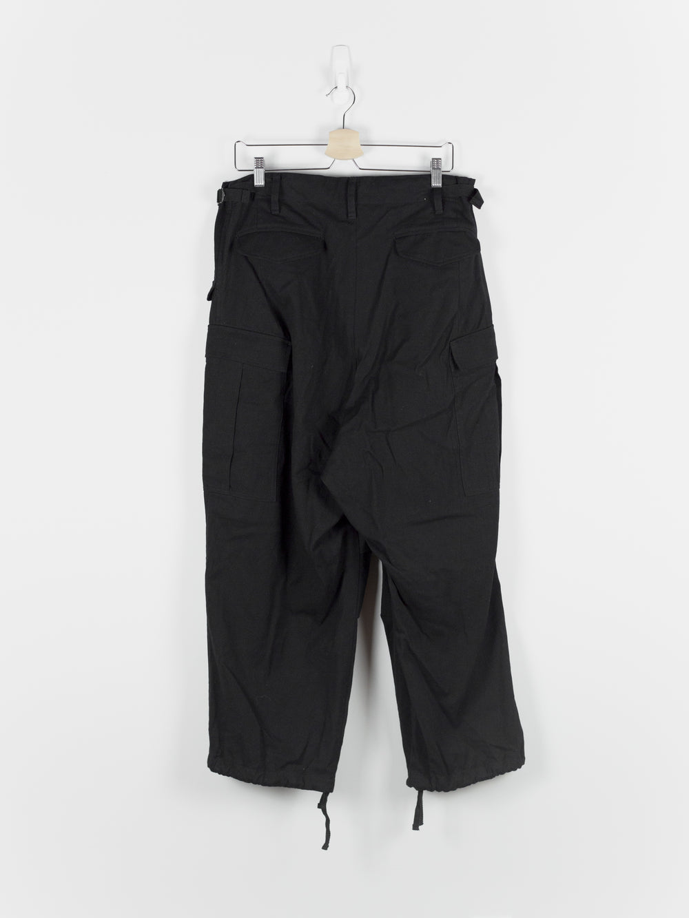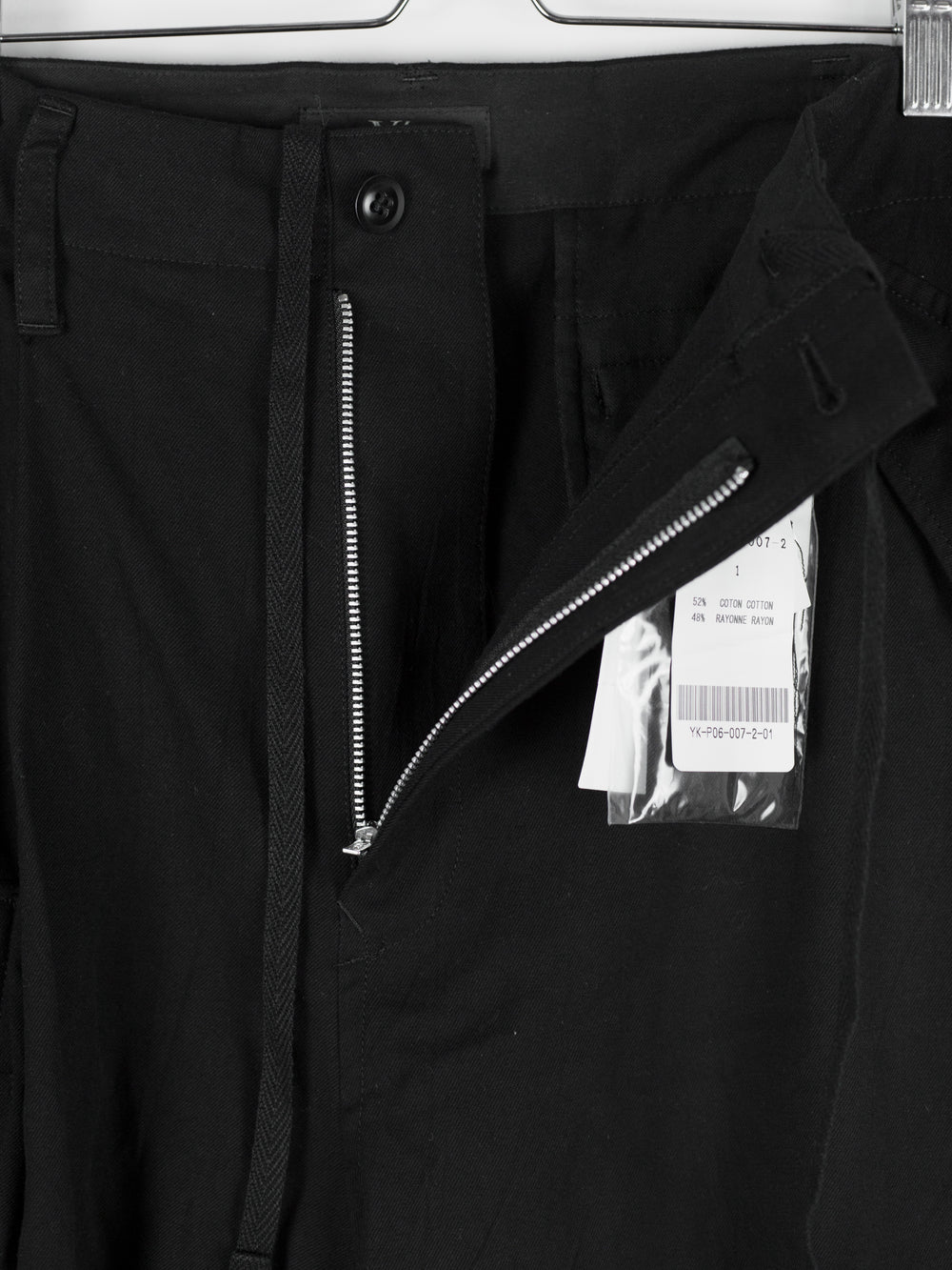 Yohji Yamamoto uses a more summer-suitable cotton-rayon blend in this cropped length wide leg cargo pant that features an asymmetrical design. The left and right sides use a different set of design details around the hip pockets and also different patterning on each leg. One side features a plain front leg while the other is pleated to create a silhouette that is more voluminous on one side than the other. Finished with string ties around the hem to alter the silhouette, knee articulation, and belt adjusters at the waist.