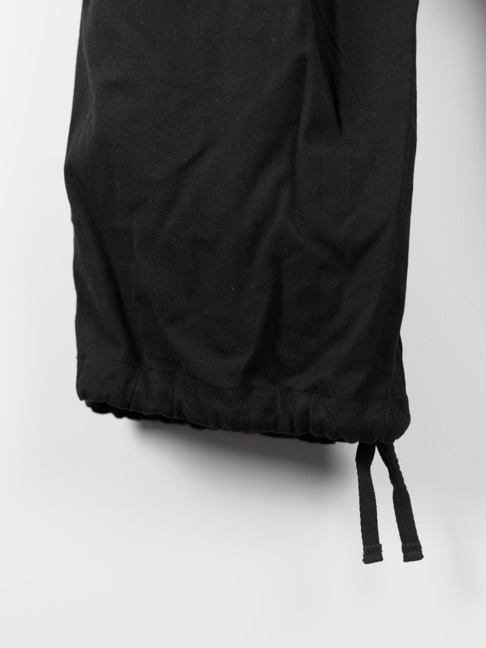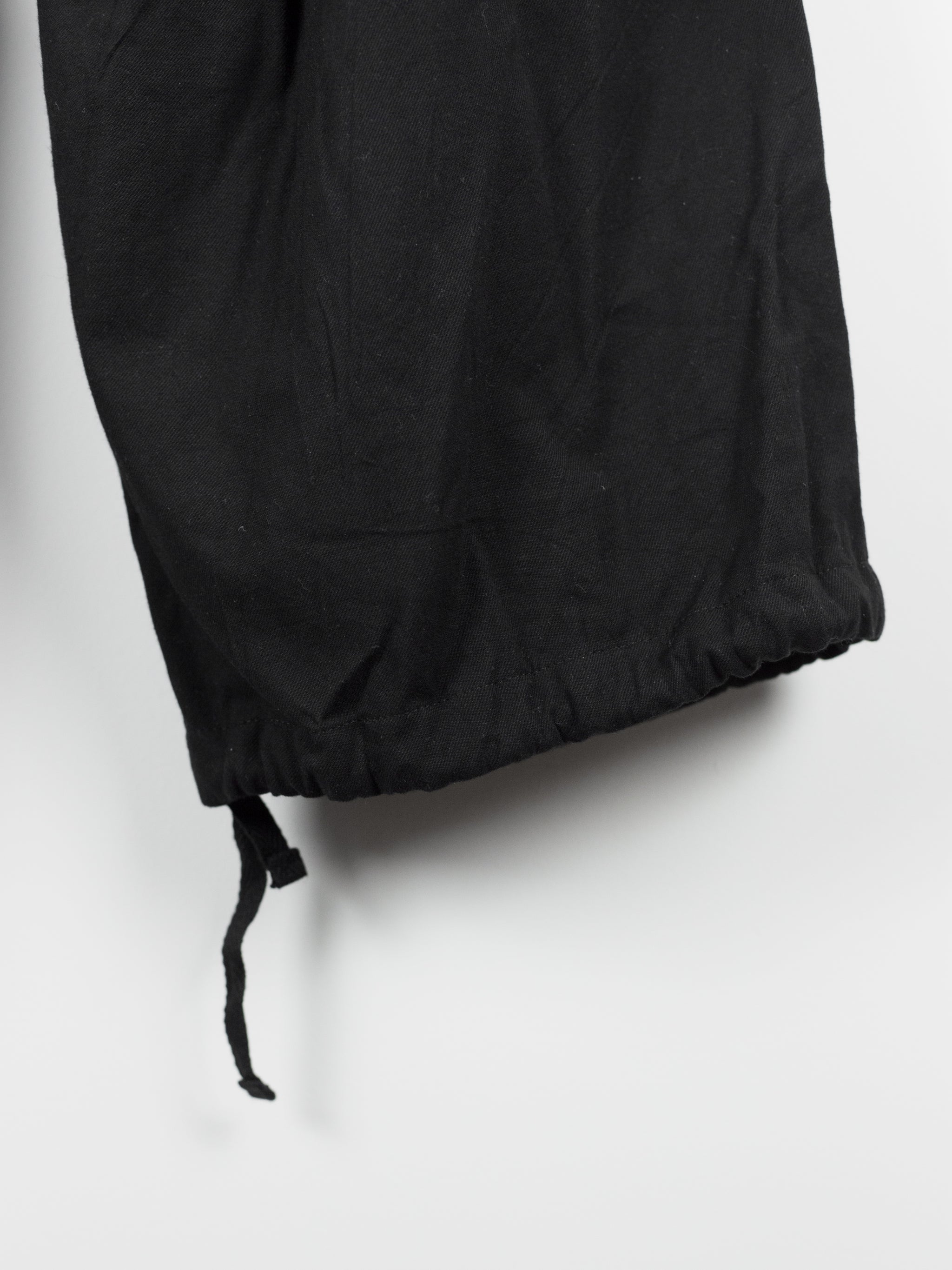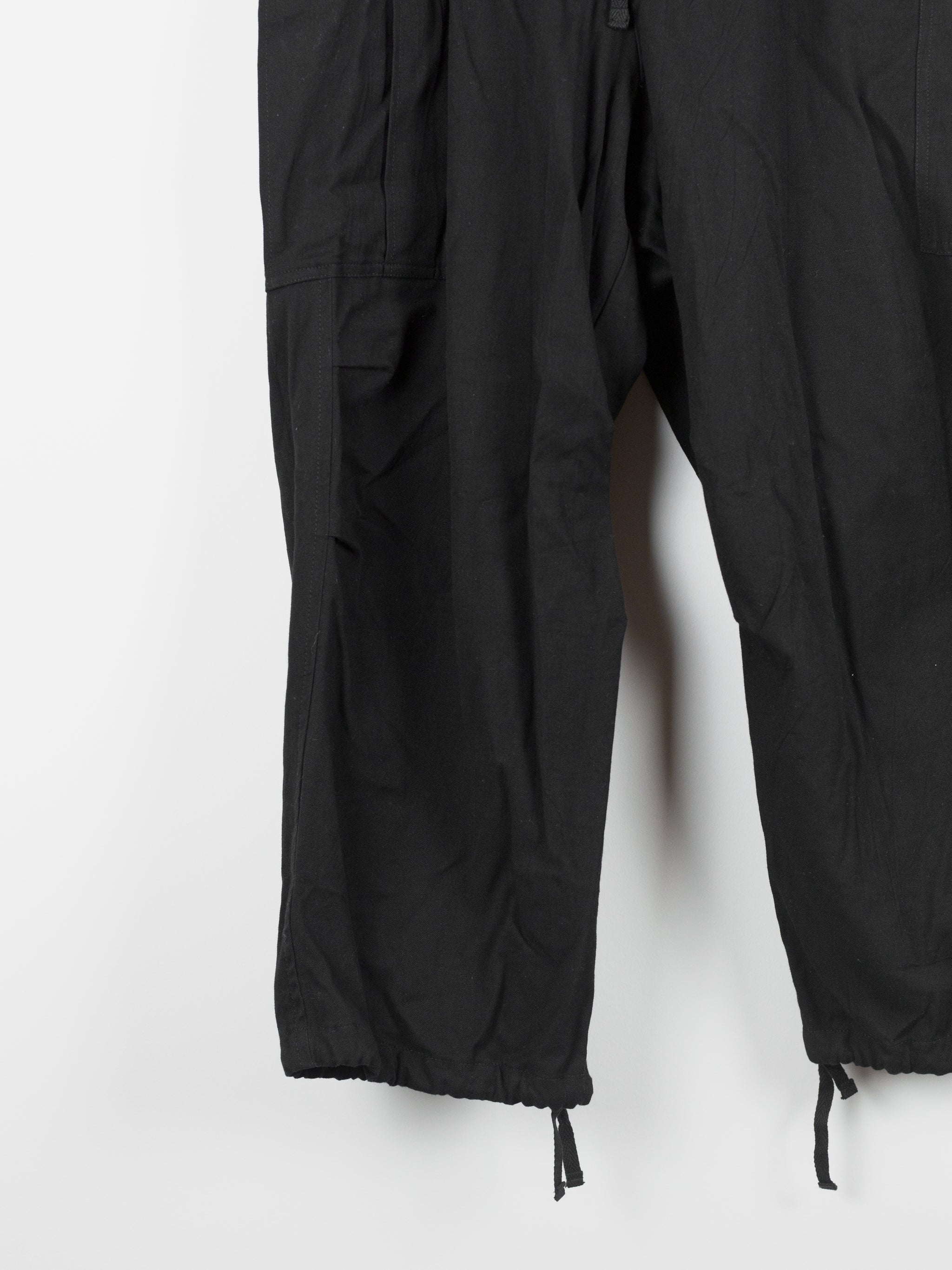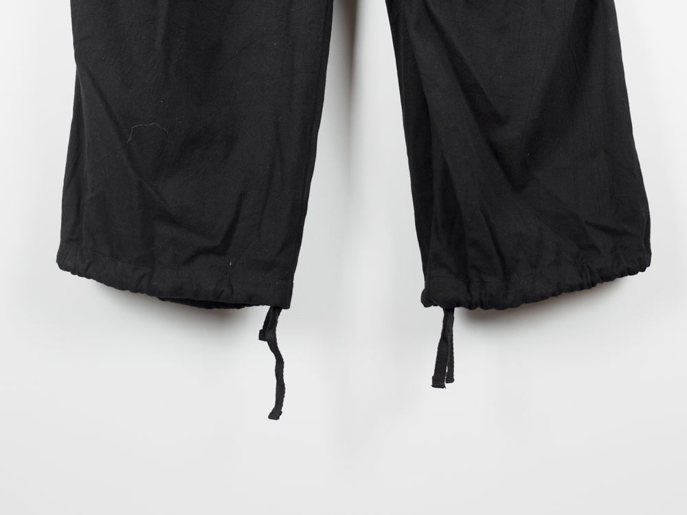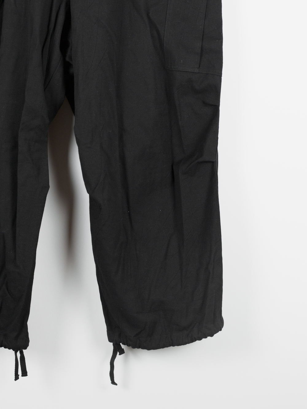 Yohji Yamamoto uses a more summer-suitable cotton-rayon blend in this cropped length wide leg cargo pant that features an asymmetrical design. The left and right sides use a different set of design details around the hip pockets and also different patterning on each leg. One side features a plain front leg while the other is pleated to create a silhouette that is more voluminous on one side than the other. Finished with string ties around the hem to alter the silhouette, knee articulation, and belt adjusters at the waist.