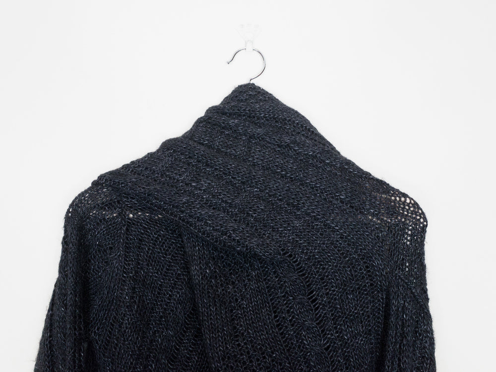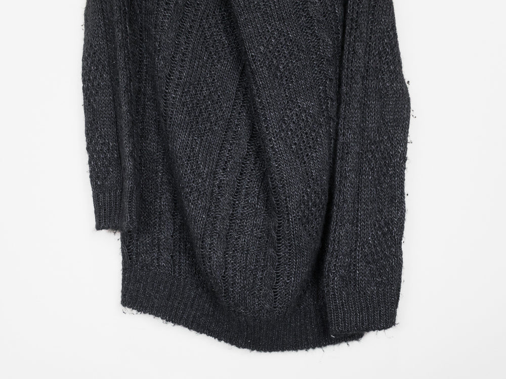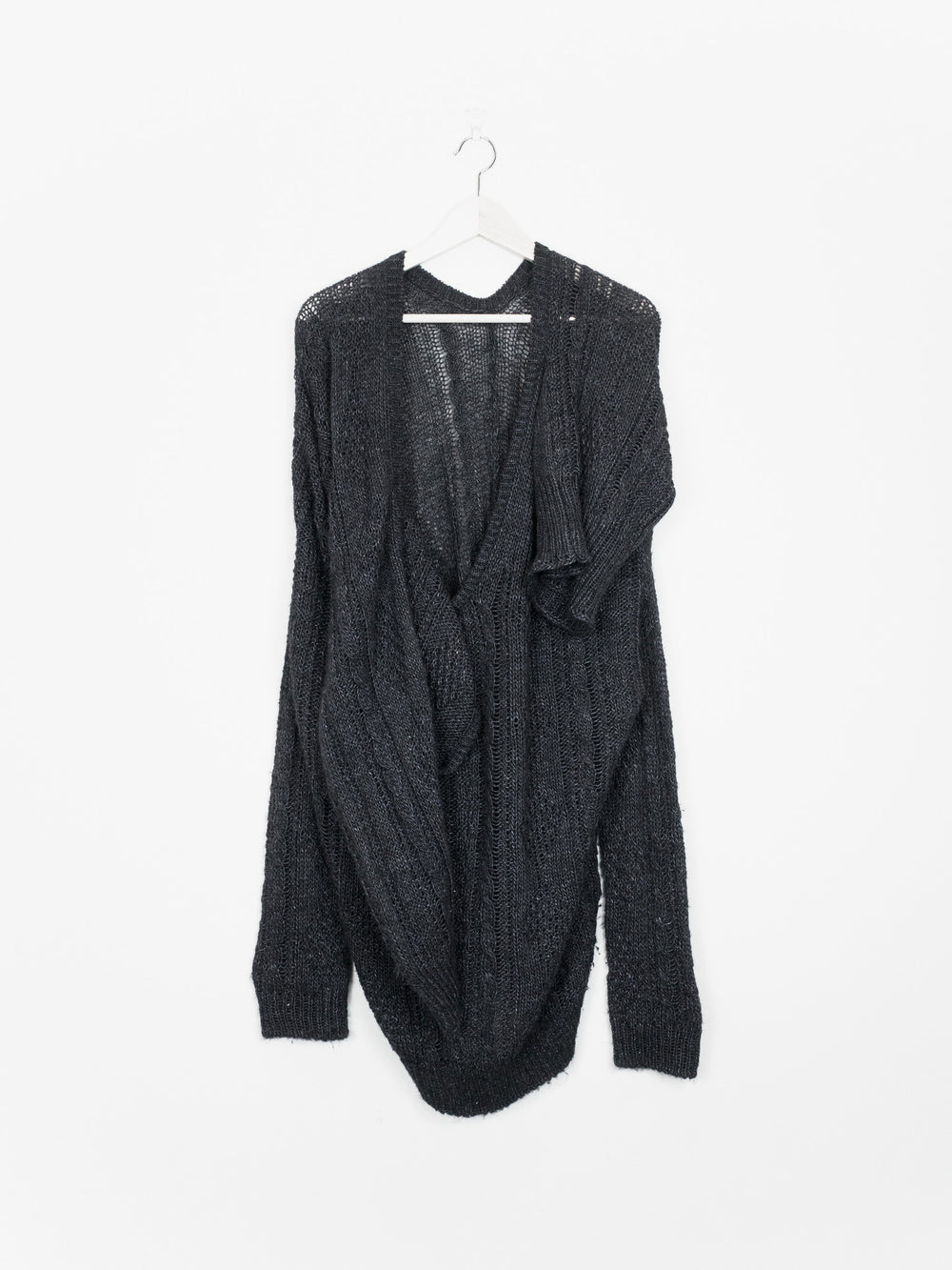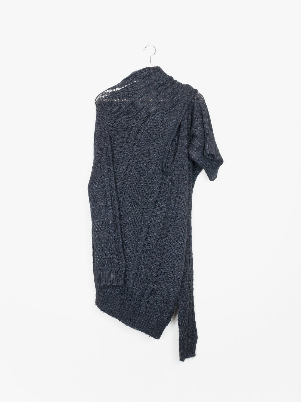 Grey This loosely woven 65% Alpaca 35% Acrylic sweater showcases Yohji Yamamoto's signature deconstructionist sensibilities, being a complete abstraction from the form of a conventional sweater. It is cut with 4 arms and a huge neckline, leaving the choice of how to drape it on the body completely up to the wearer. Wrap the extra ones around your body or let them hang, drape the hood over your head as a shawl or hood, etc, This piece is so much fun--a super playful and comfortable variation on the gray knit sweater.