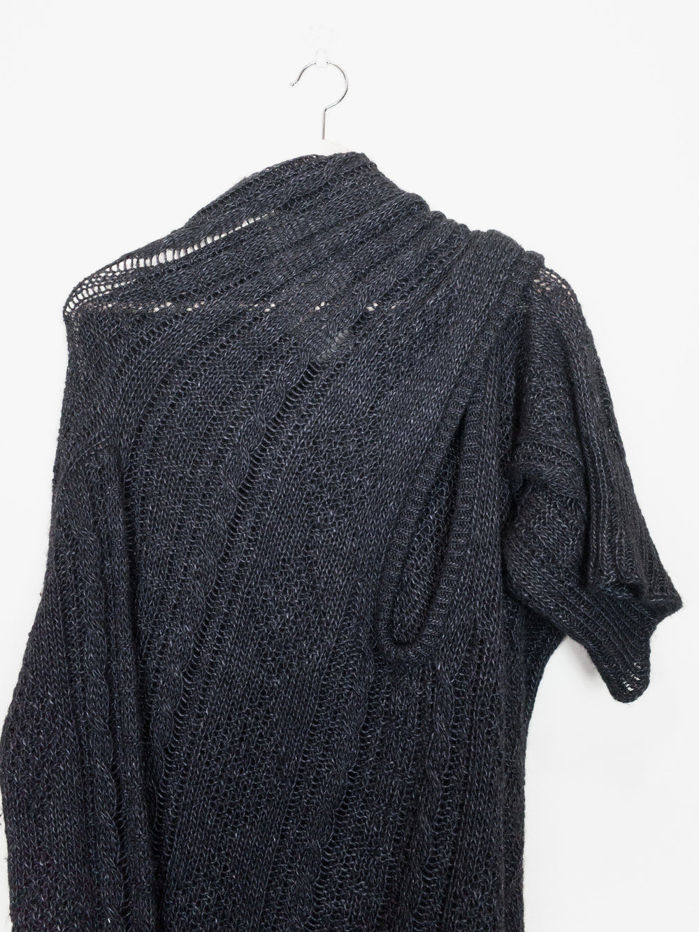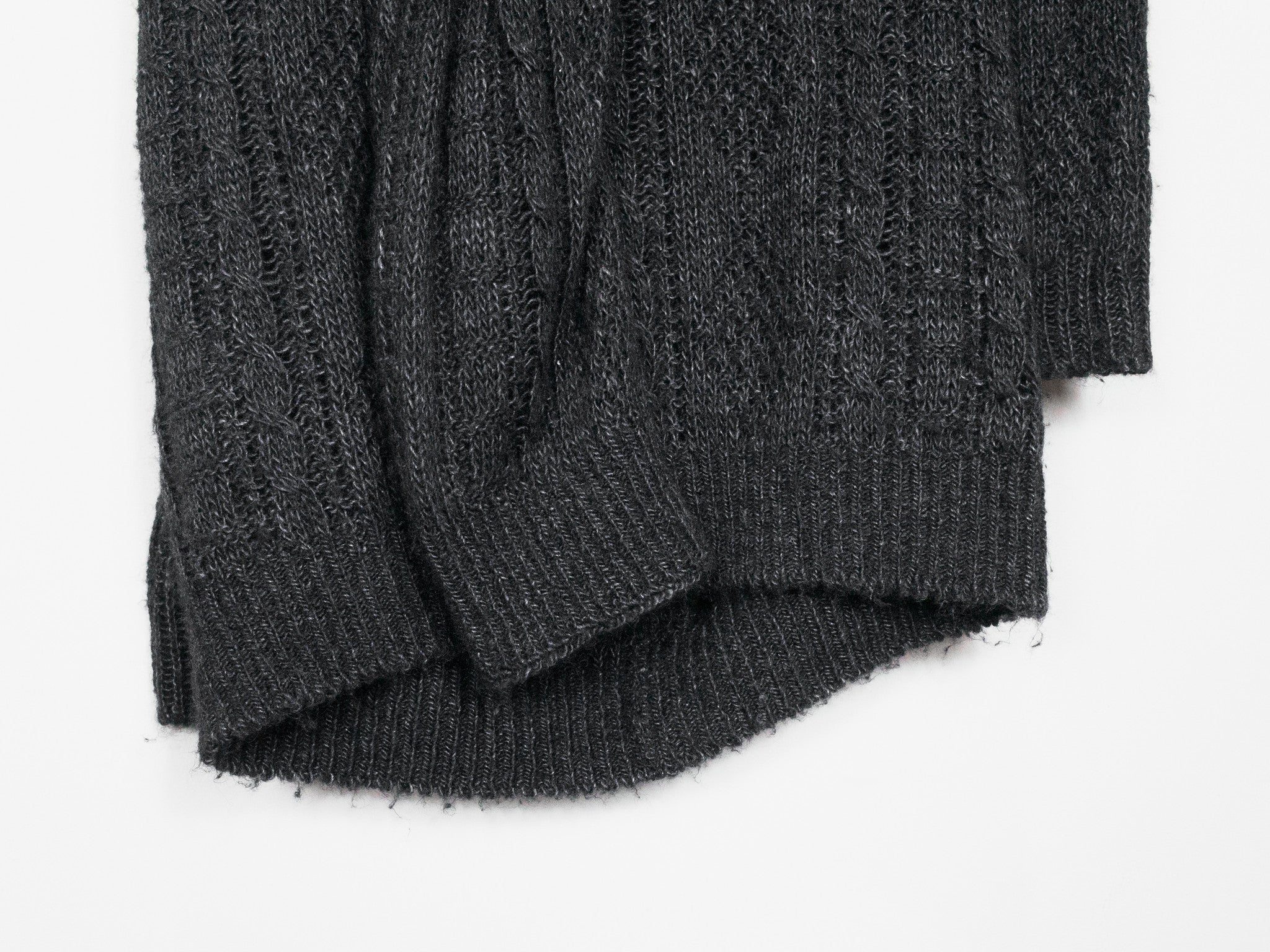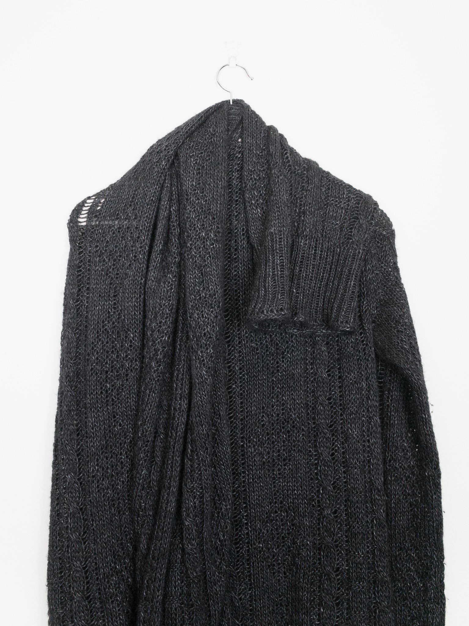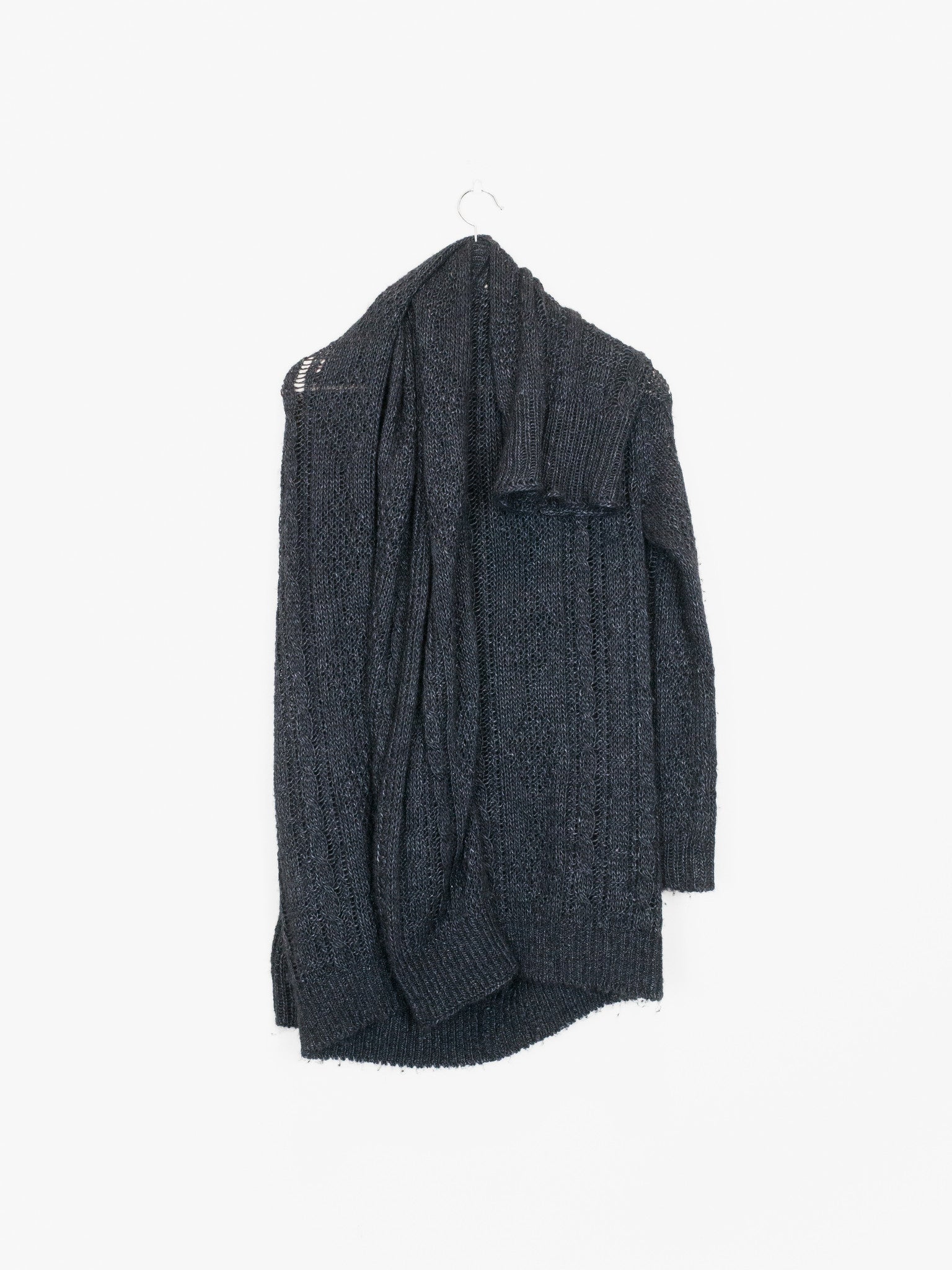 Grey This loosely woven 65% Alpaca 35% Acrylic sweater showcases Yohji Yamamoto's signature deconstructionist sensibilities, being a complete abstraction from the form of a conventional sweater. It is cut with 4 arms and a huge neckline, leaving the choice of how to drape it on the body completely up to the wearer. Wrap the extra ones around your body or let them hang, drape the hood over your head as a shawl or hood, etc, This piece is so much fun--a super playful and comfortable variation on the gray knit sweater.
