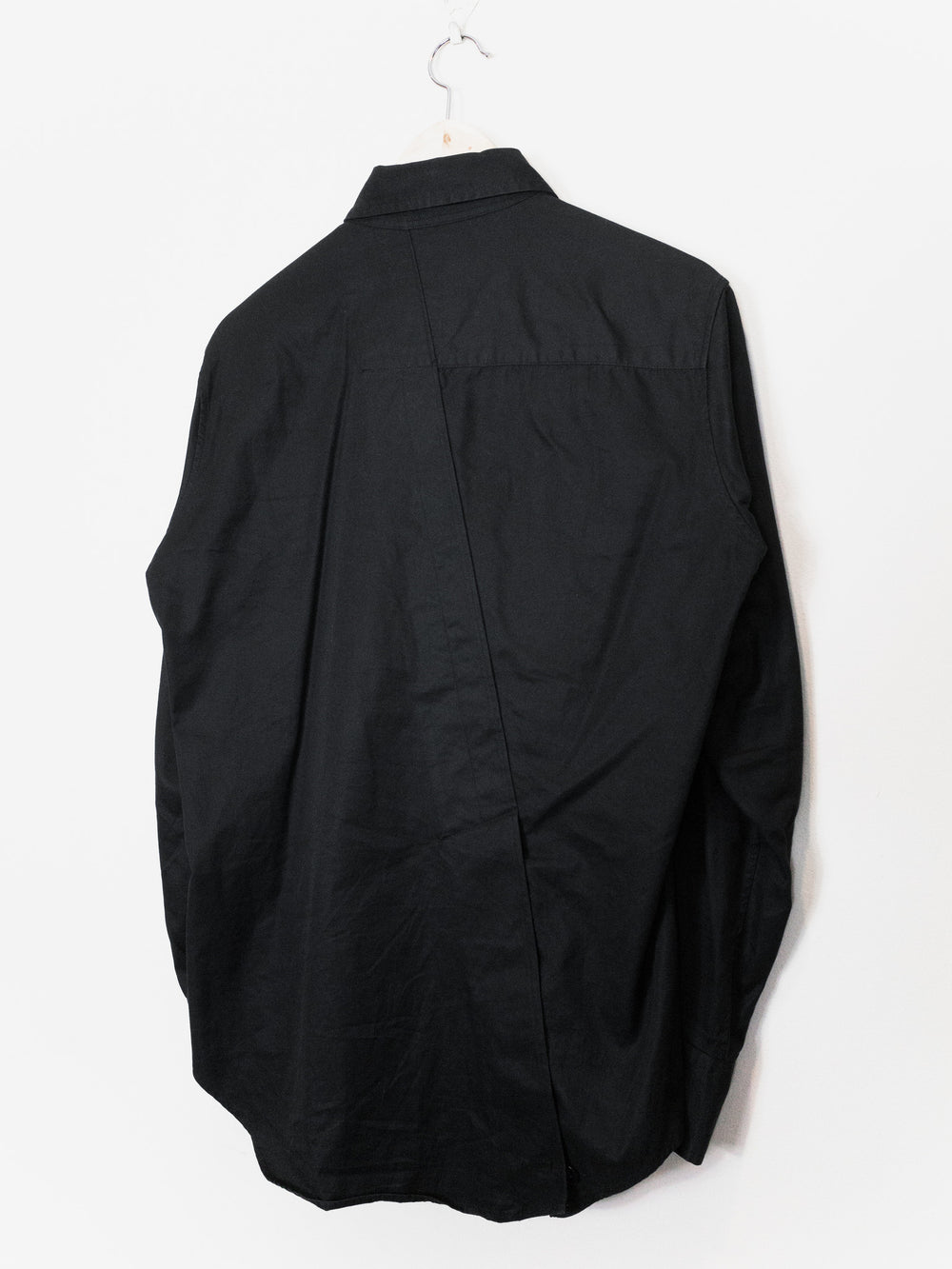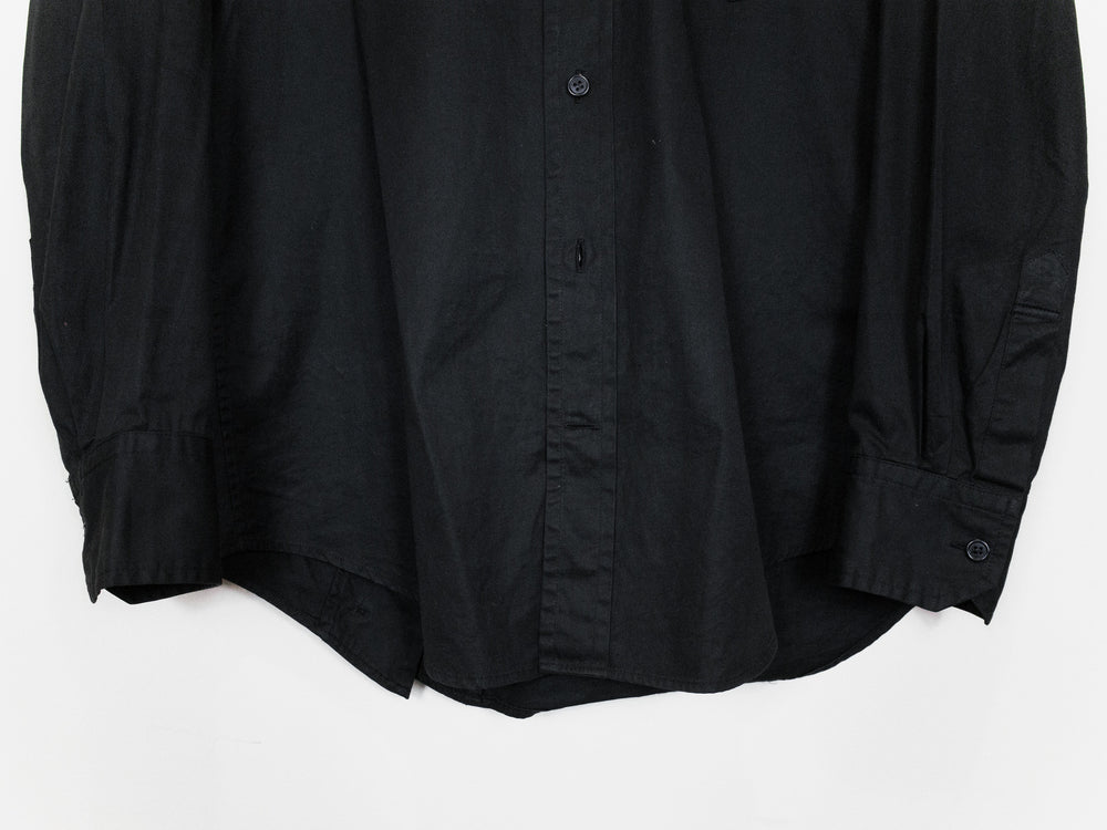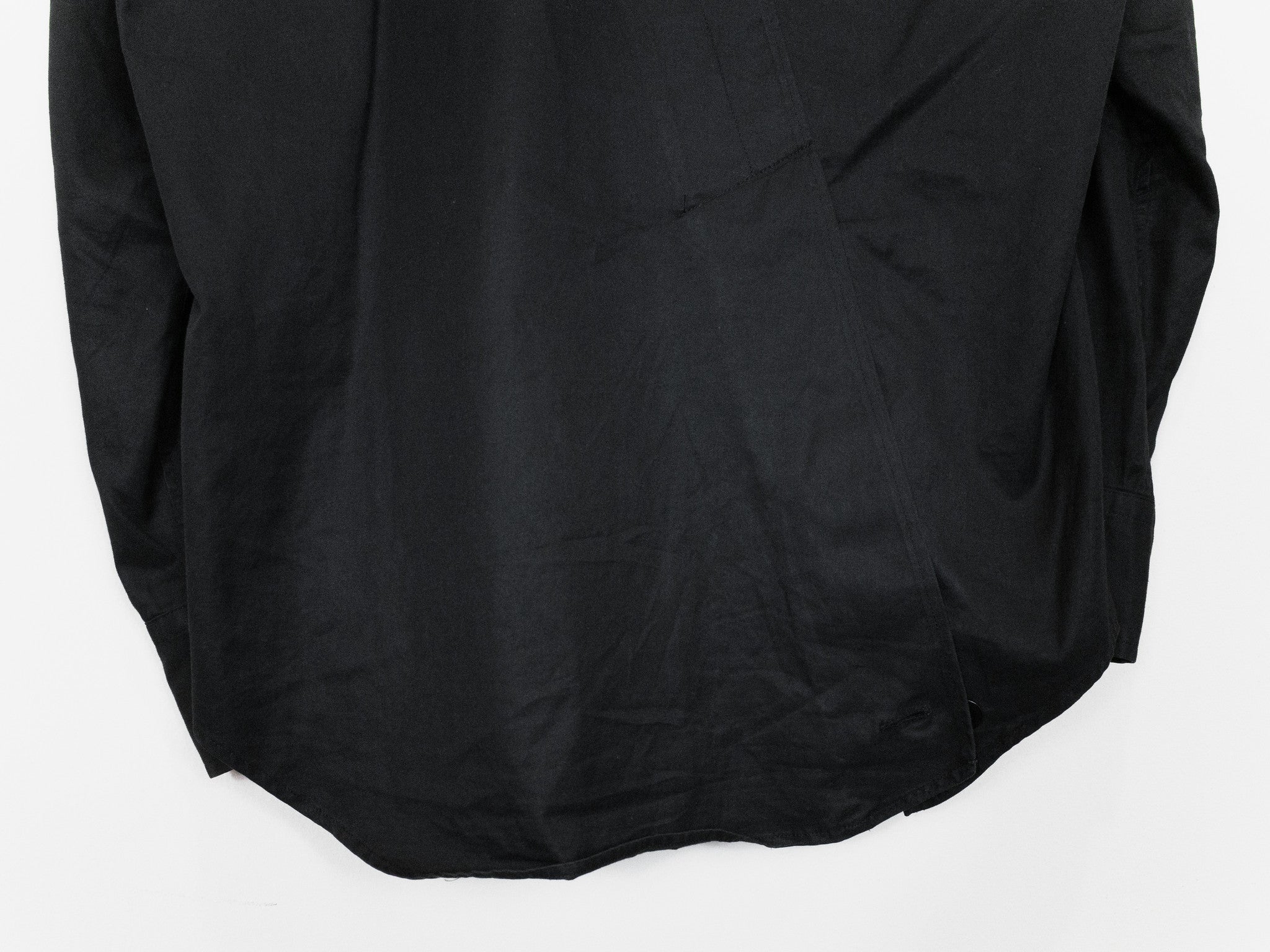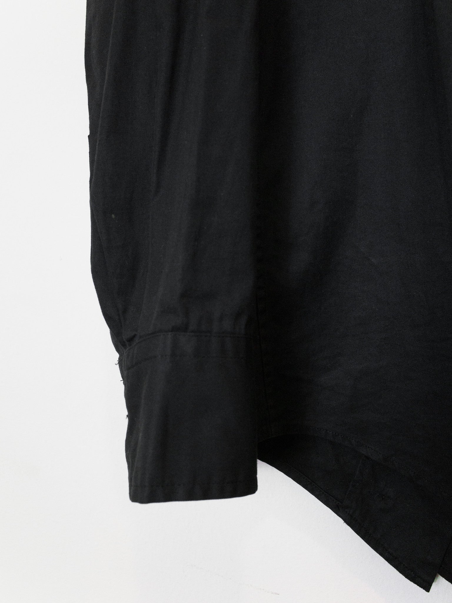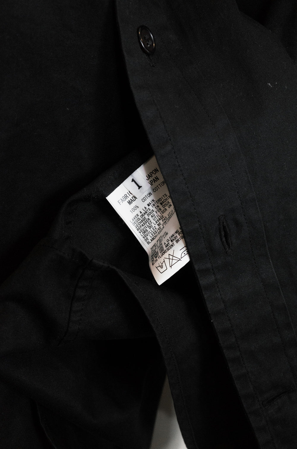 Black The reconstructed patternwork on the shoulder and back of this shirt provides the perfect subtle visual detail. A series of horizontal darts intersects with a diagonally cut back placket that ends at the hem in a reinterpreted functioning sleeve cuff closure (that also reads peculiarly like an offset fishtail hem). Meanwhile, the shoulder features a levitating panel whose cast shadow punctuates the asymmetry of the garment. This shirt is done in Yohji's fine shirting cotton that is smooth, lightweight, and comfortable. Cut slim and sharp, with no extraneous adornments besides the main reconstructed design.
