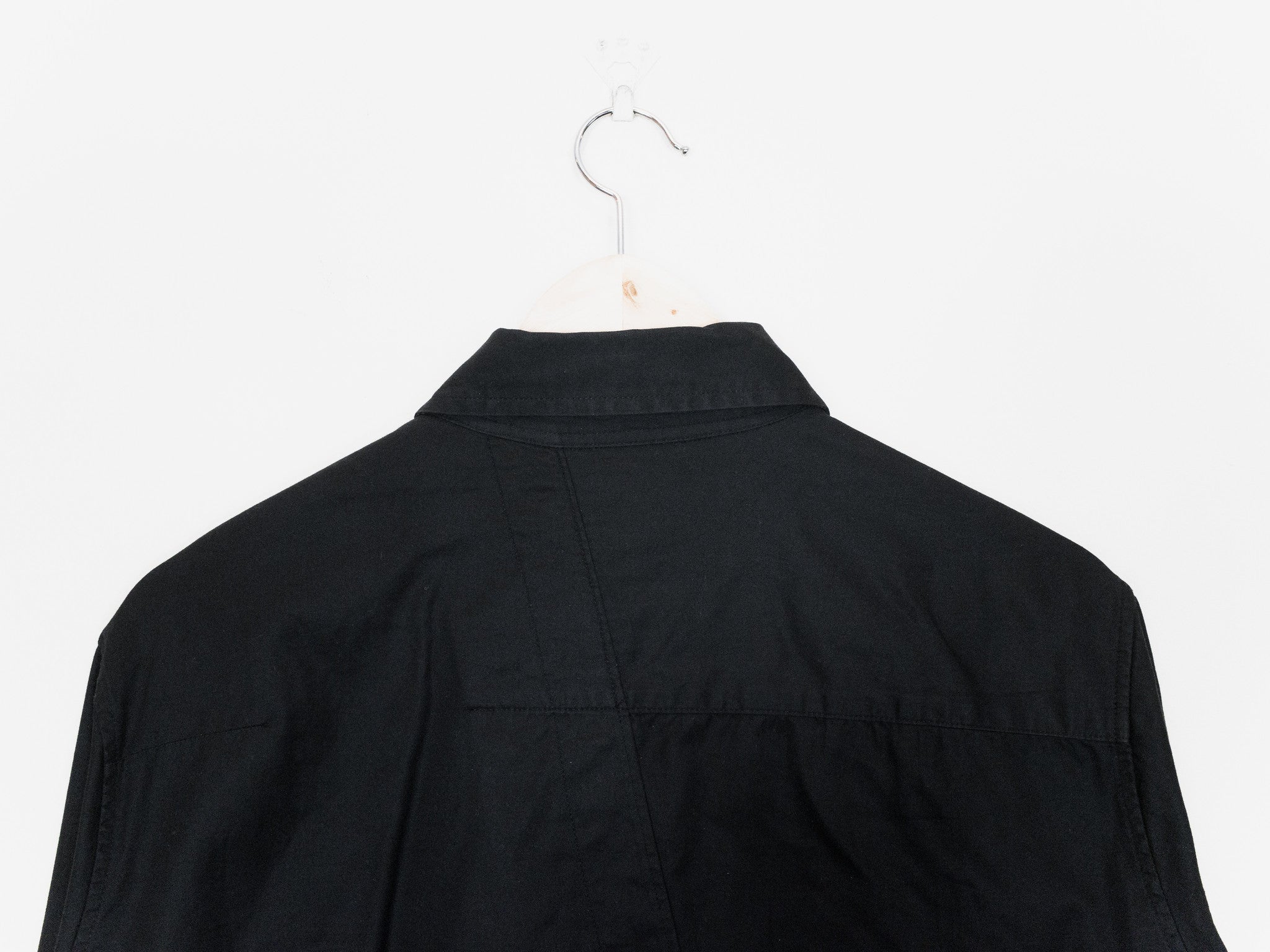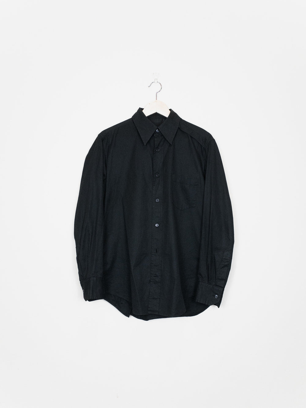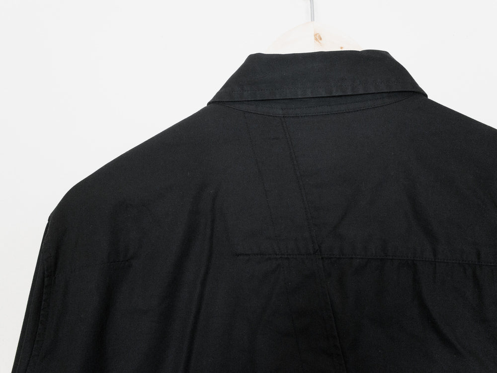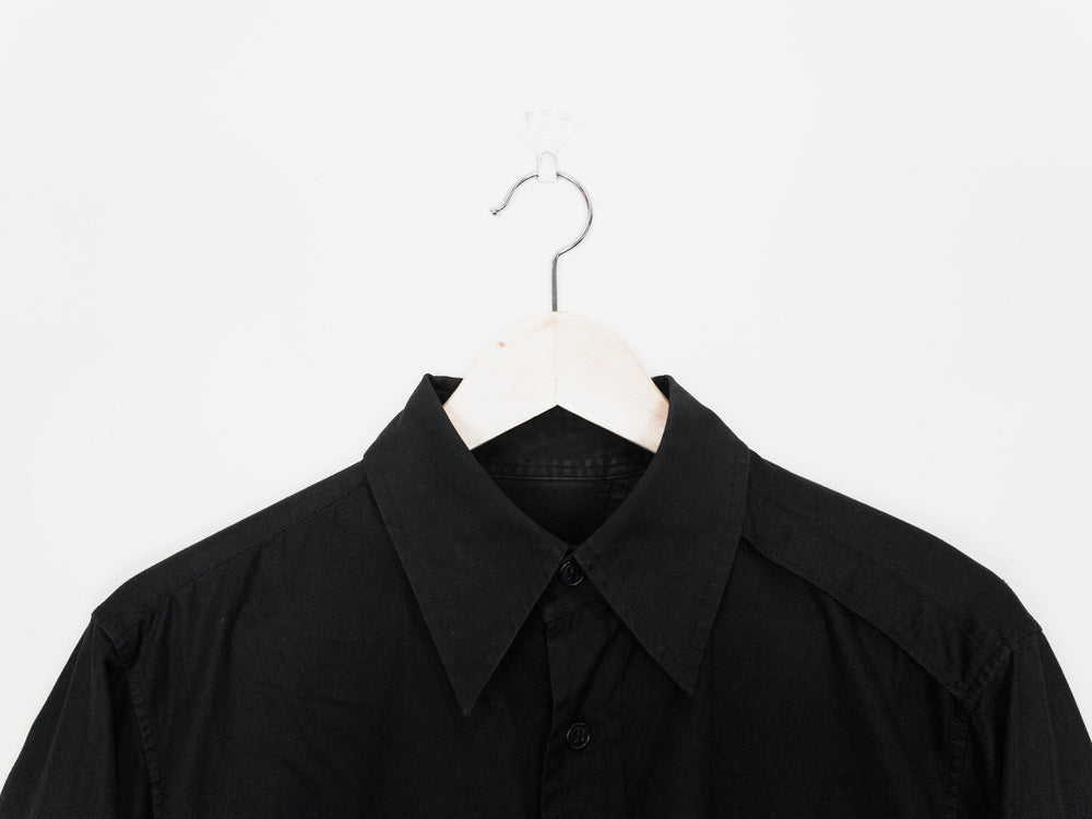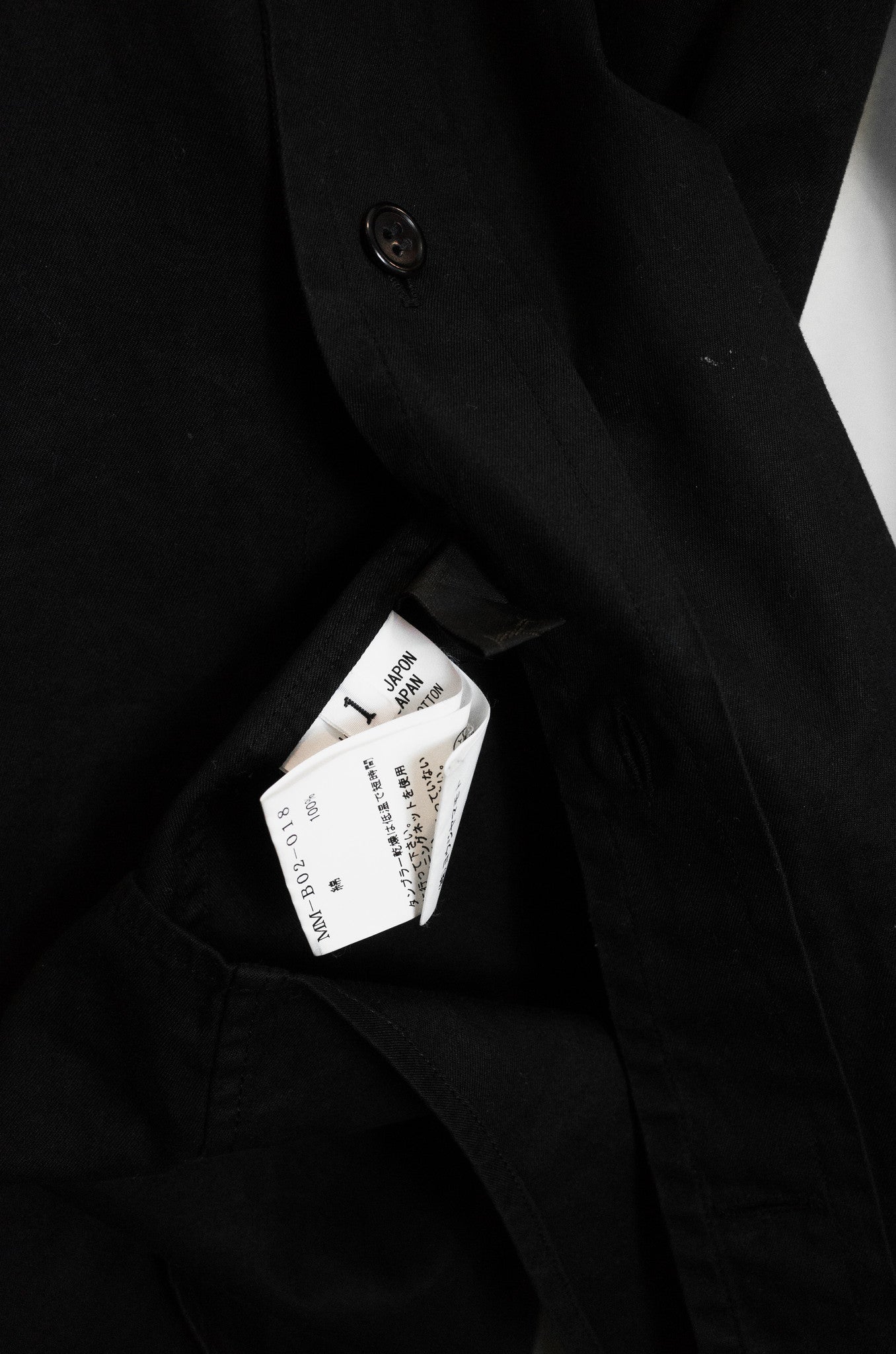 Black The reconstructed patternwork on the shoulder and back of this shirt provides the perfect subtle visual detail. A series of horizontal darts intersects with a diagonally cut back placket that ends at the hem in a reinterpreted functioning sleeve cuff closure (that also reads peculiarly like an offset fishtail hem). Meanwhile, the shoulder features a levitating panel whose cast shadow punctuates the asymmetry of the garment. This shirt is done in Yohji's fine shirting cotton that is smooth, lightweight, and comfortable. Cut slim and sharp, with no extraneous adornments besides the main reconstructed design.