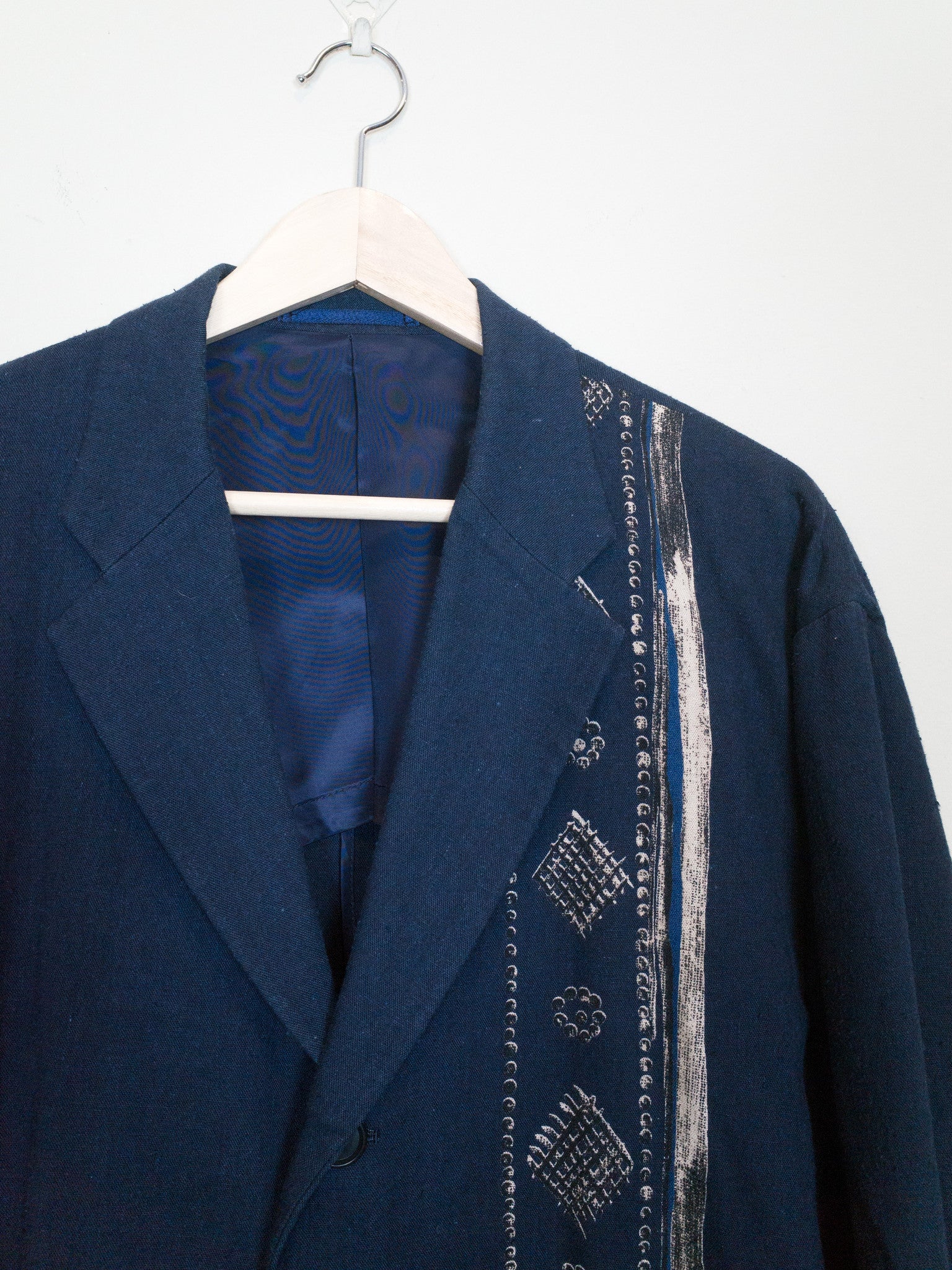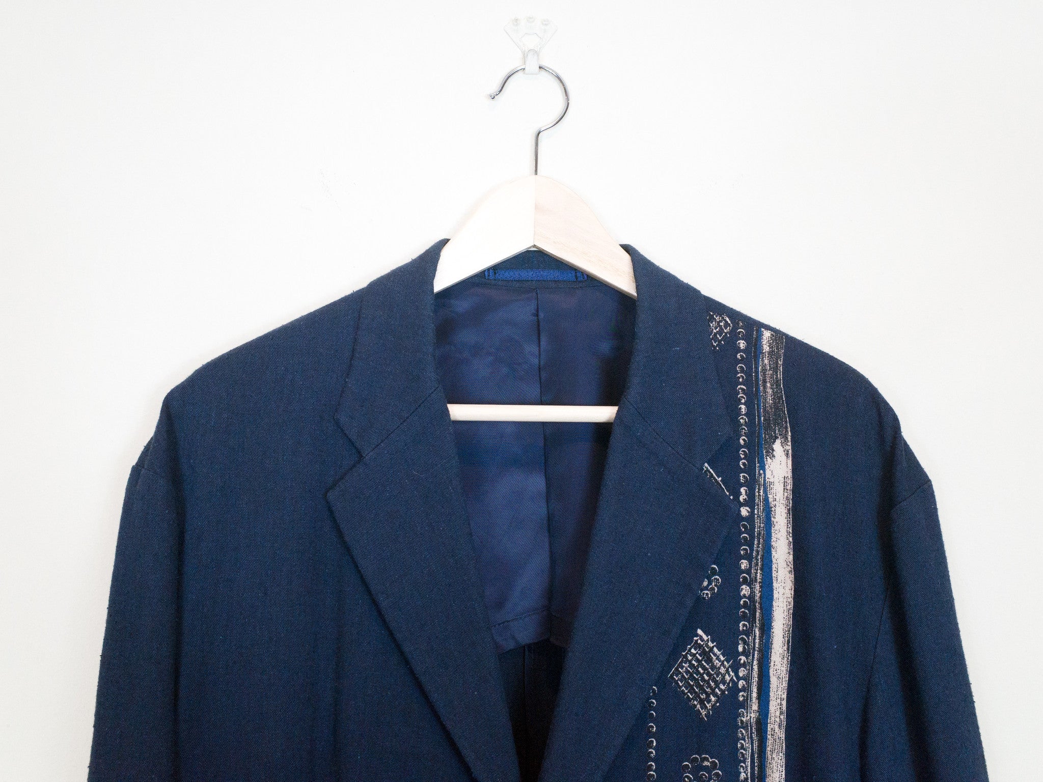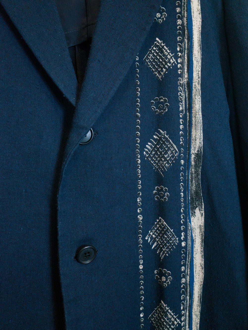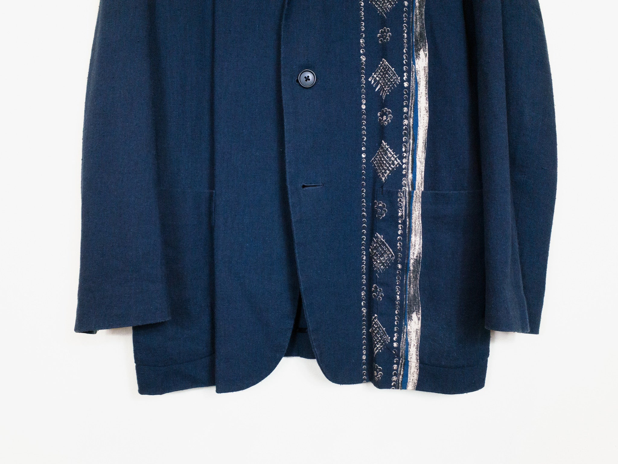 Navy/Beige This casual unstructured blazer is cut in an amazingly soft, cozy, and slubby cotton/linen/rayon blend fabric that feels great when worn and almost glows in the light. It is deceptively substantial when you first drape it across your shoulders, the cupra lining giving the piece a bit more weightiness and fluidity. It's cut with a relaxed oversize shoulder and an extended body--comfortable, free, and flowing--with a graphic accent running along the left side of the body. The print creates a visual break in the piece and keeps the bold blue from becoming too overwhelming. This is the perfect jacket for your lazy days in the spring and summer. Throw it on and even just the feeling of wearing it will coax a relaxed sigh out of you as you lean back contentedly.