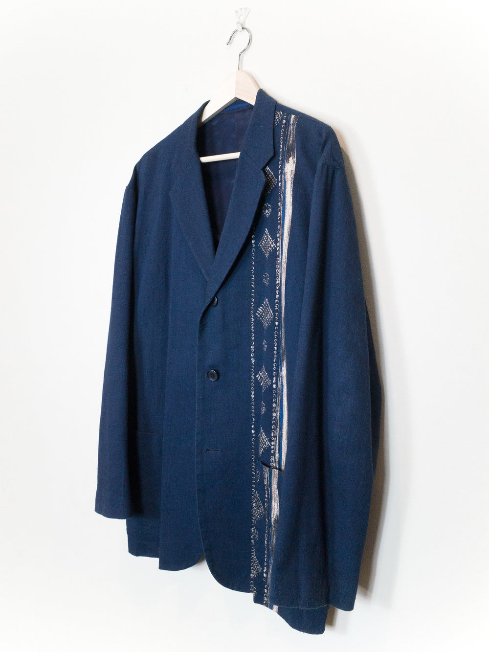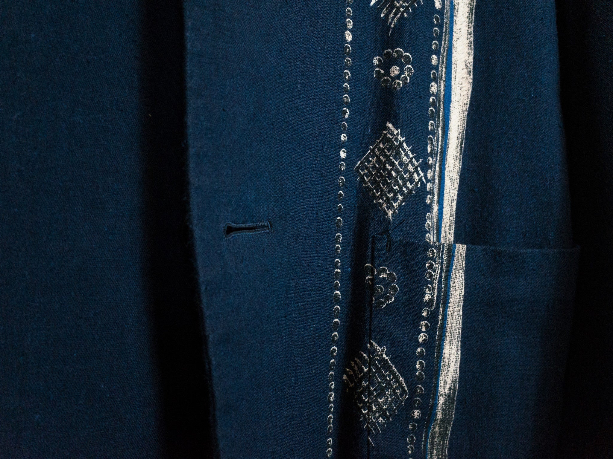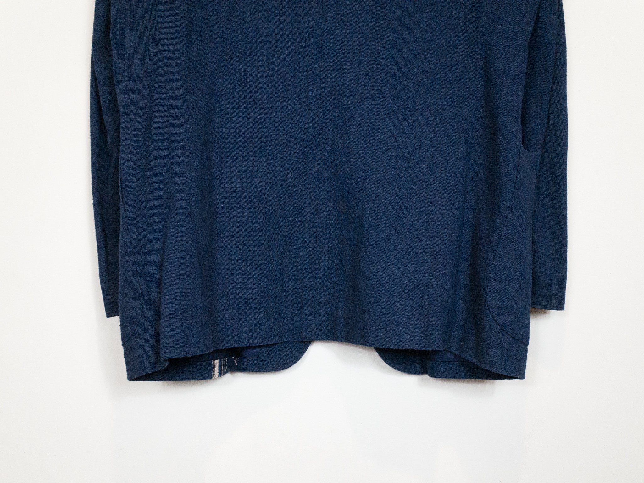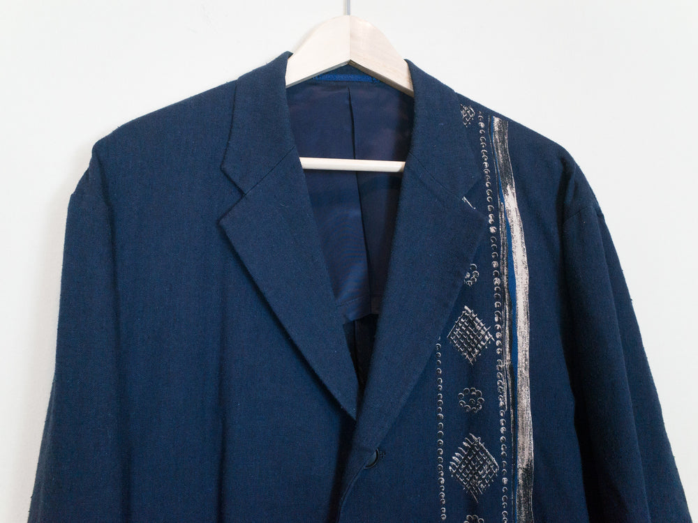 Navy/Beige This casual unstructured blazer is cut in an amazingly soft, cozy, and slubby cotton/linen/rayon blend fabric that feels great when worn and almost glows in the light. It is deceptively substantial when you first drape it across your shoulders, the cupra lining giving the piece a bit more weightiness and fluidity. It's cut with a relaxed oversize shoulder and an extended body--comfortable, free, and flowing--with a graphic accent running along the left side of the body. The print creates a visual break in the piece and keeps the bold blue from becoming too overwhelming. This is the perfect jacket for your lazy days in the spring and summer. Throw it on and even just the feeling of wearing it will coax a relaxed sigh out of you as you lean back contentedly.