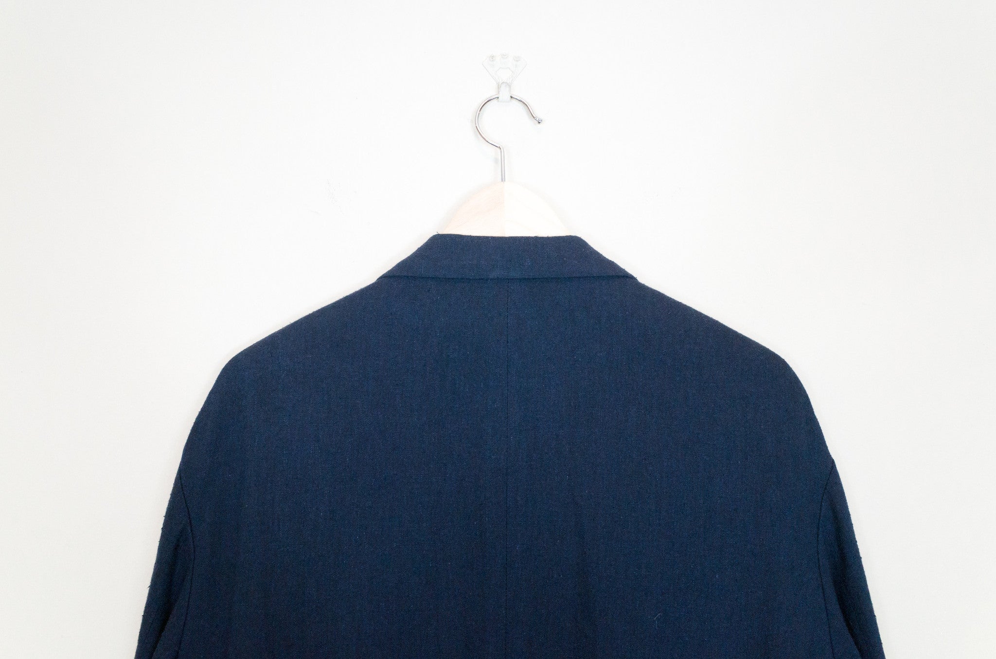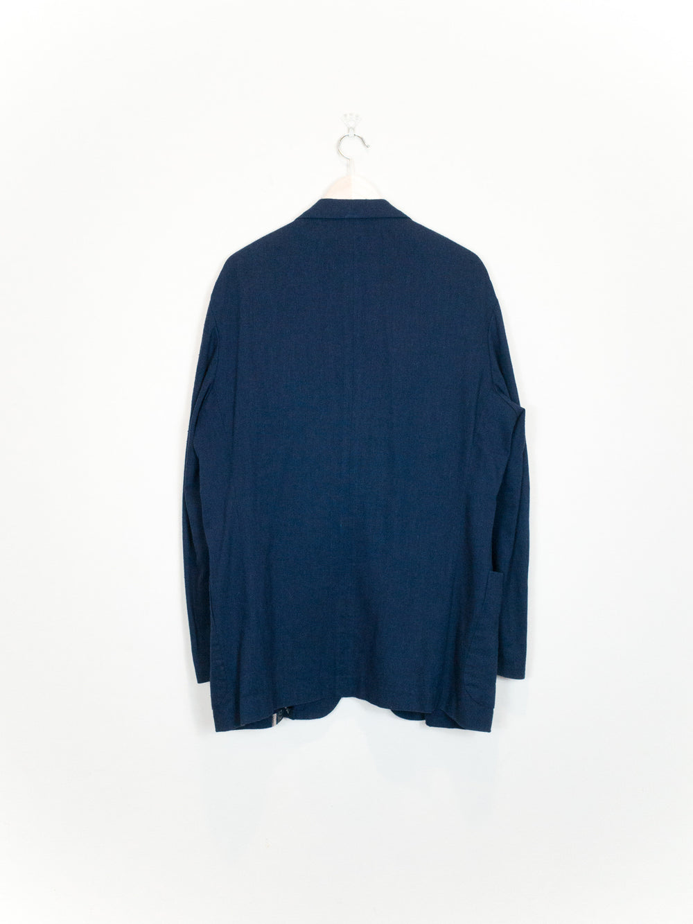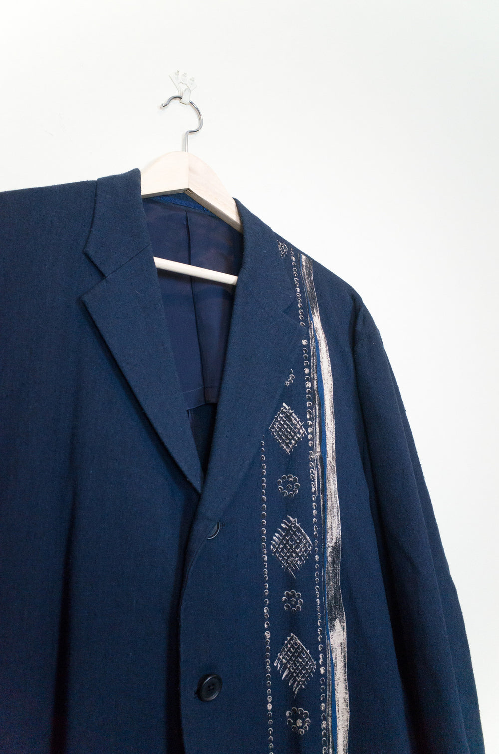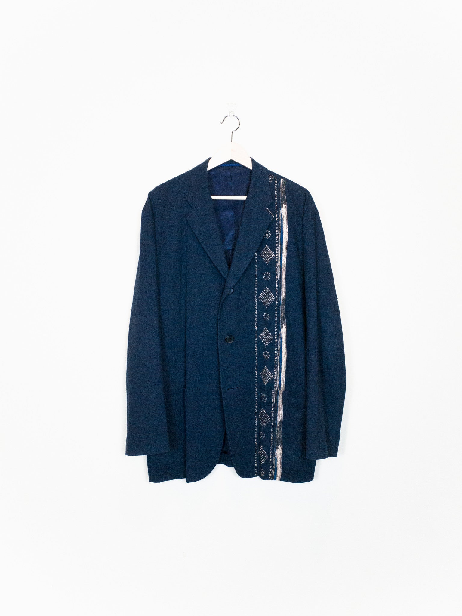 Navy/Beige This casual unstructured blazer is cut in an amazingly soft, cozy, and slubby cotton/linen/rayon blend fabric that feels great when worn and almost glows in the light. It is deceptively substantial when you first drape it across your shoulders, the cupra lining giving the piece a bit more weightiness and fluidity. It's cut with a relaxed oversize shoulder and an extended body--comfortable, free, and flowing--with a graphic accent running along the left side of the body. The print creates a visual break in the piece and keeps the bold blue from becoming too overwhelming. This is the perfect jacket for your lazy days in the spring and summer. Throw it on and even just the feeling of wearing it will coax a relaxed sigh out of you as you lean back contentedly.