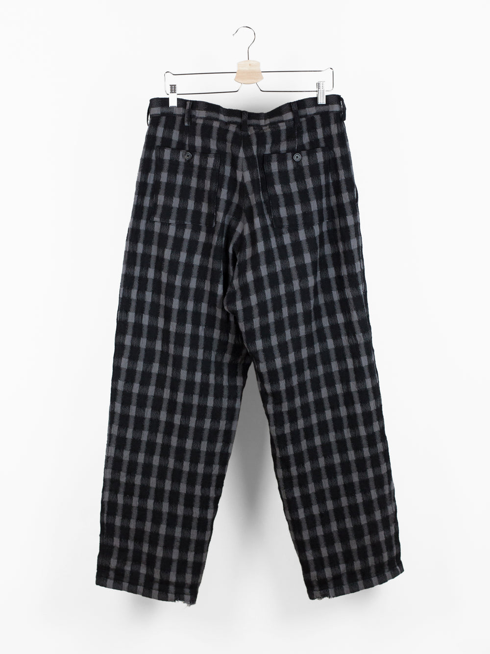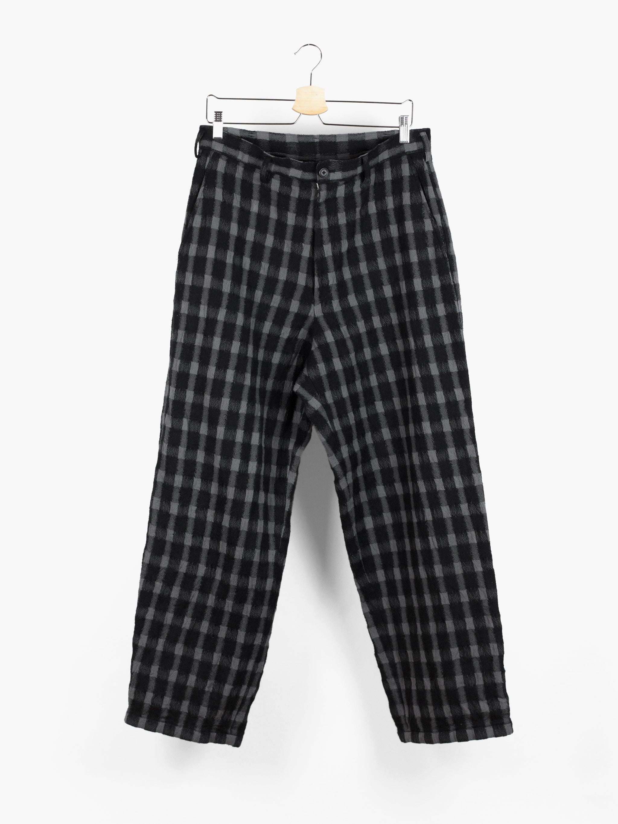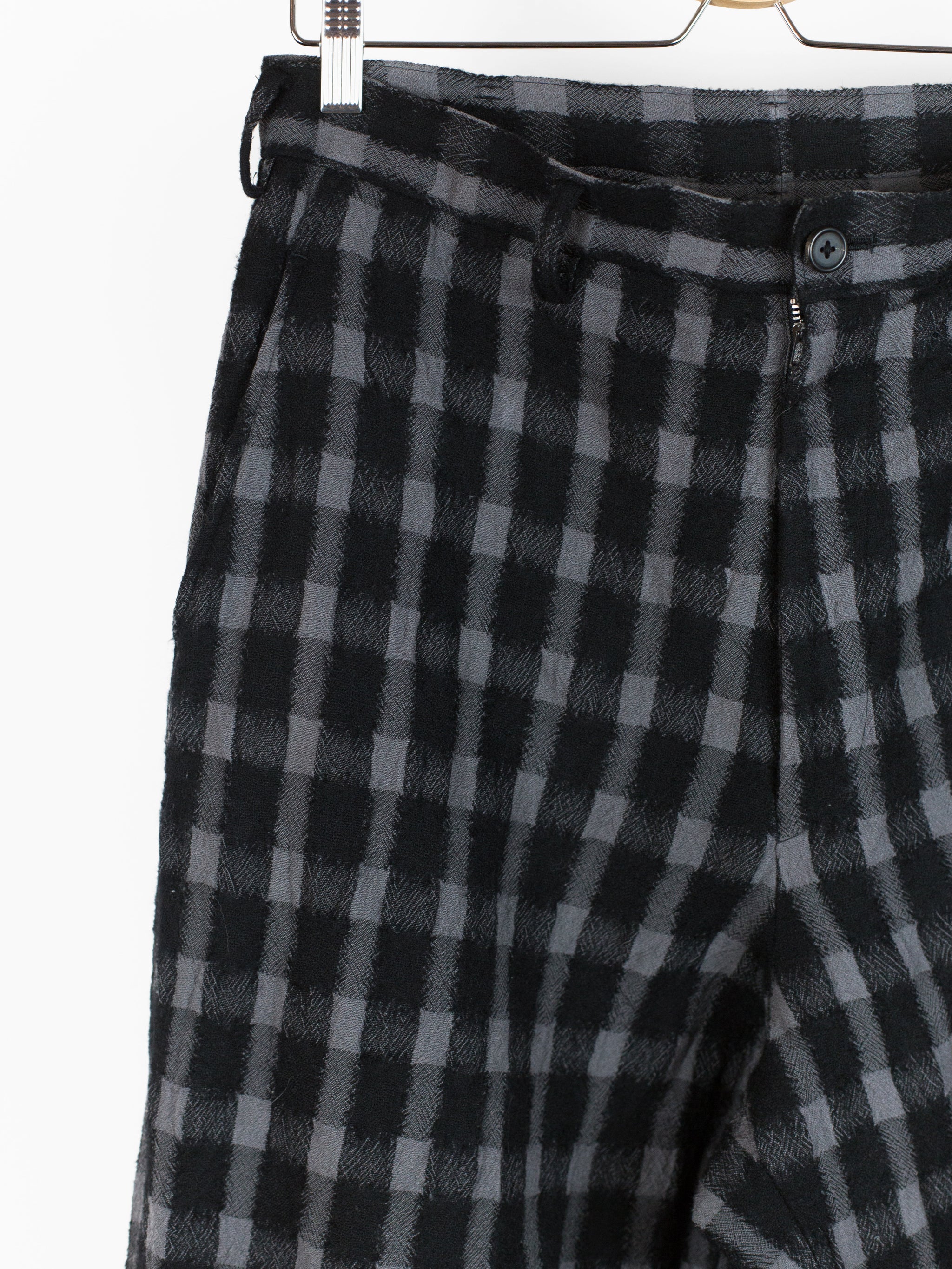 Wide leg wool flannel pant from Yohji Yamamoto that lets the textile speak for itself. It's beautifully textured and dimensional with diagonally streaking yarns that 'blur' the edges of the check. The perceived softness of the edges match the inherent soft wrinkle of the fabric, giving it a nicely worn, aged look. The shape takes from a wide leg work pant, with belted waistband, slash waist pockets and back patch pockets.