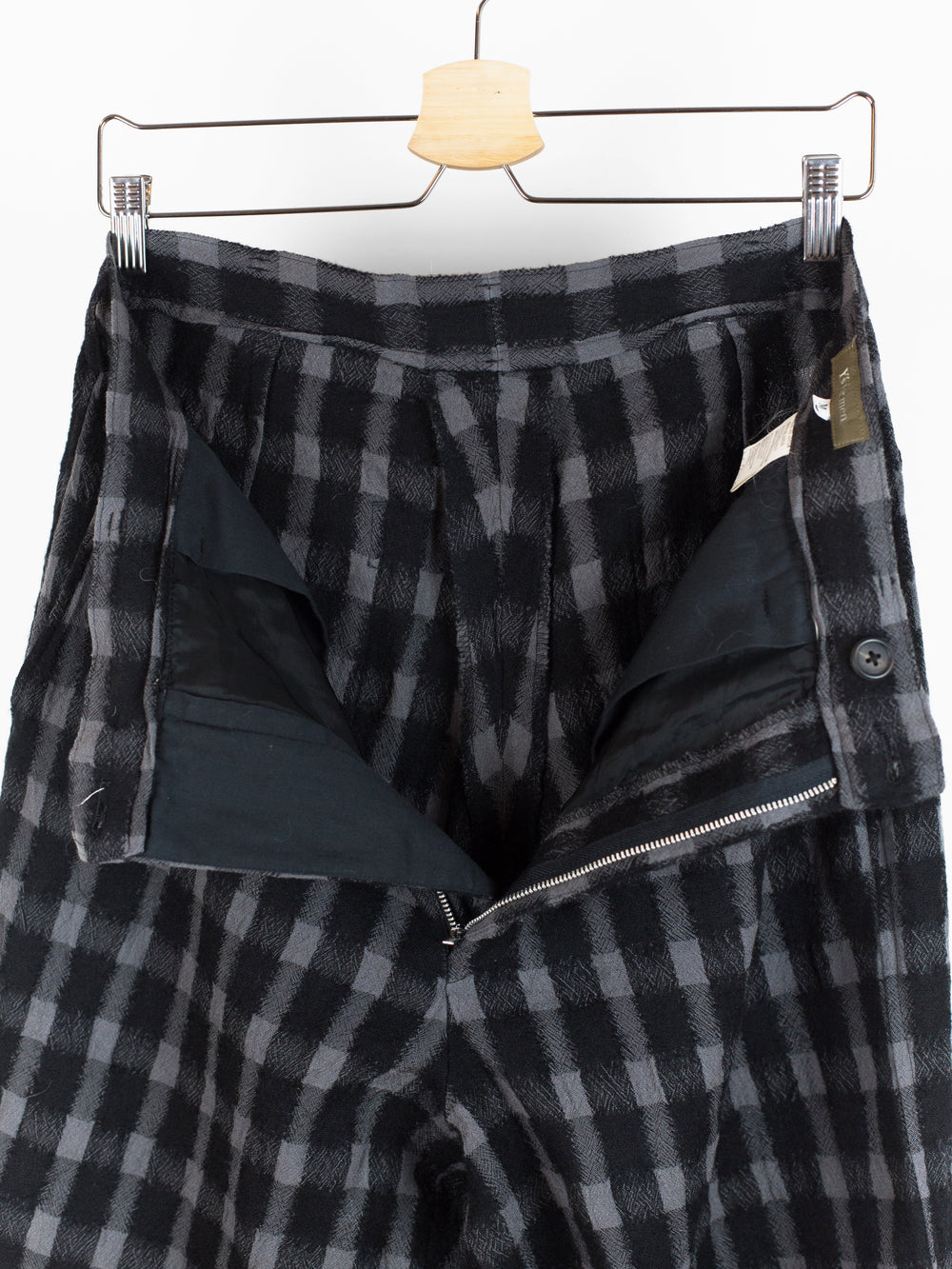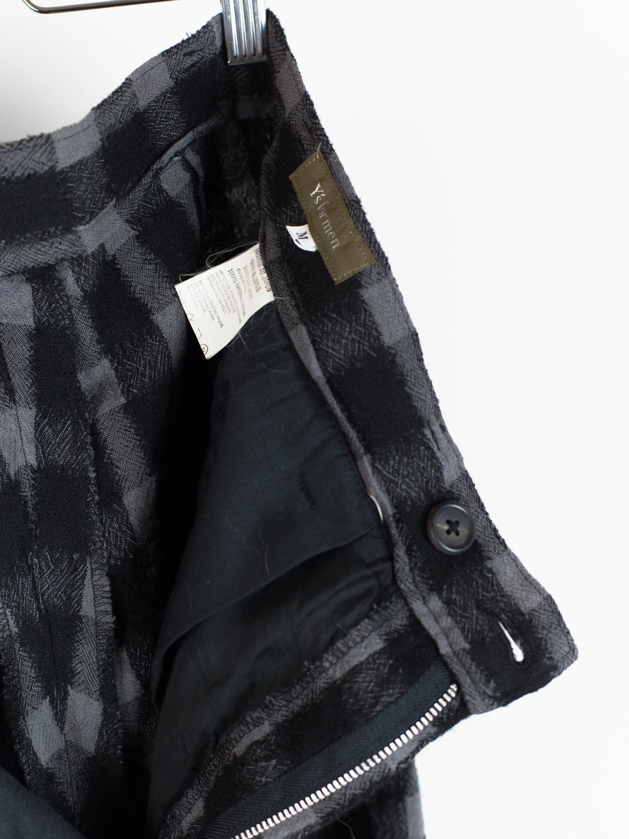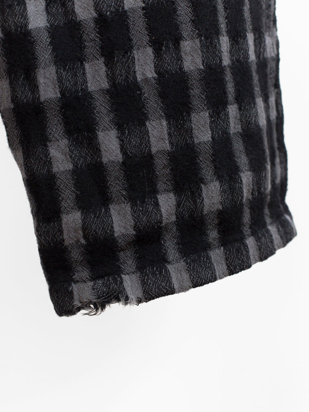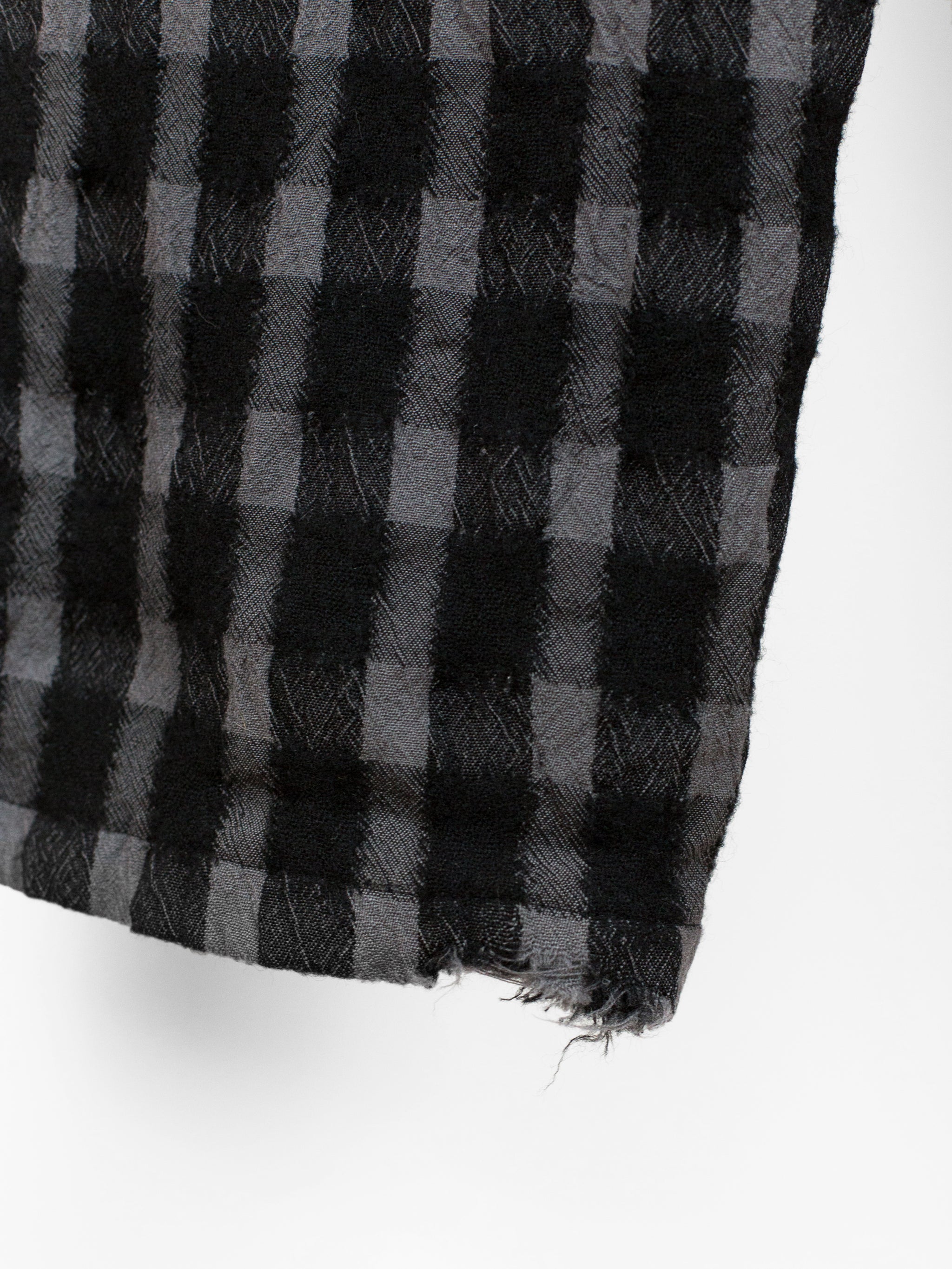 Wide leg wool flannel pant from Yohji Yamamoto that lets the textile speak for itself. It's beautifully textured and dimensional with diagonally streaking yarns that 'blur' the edges of the check. The perceived softness of the edges match the inherent soft wrinkle of the fabric, giving it a nicely worn, aged look. The shape takes from a wide leg work pant, with belted waistband, slash waist pockets and back patch pockets.