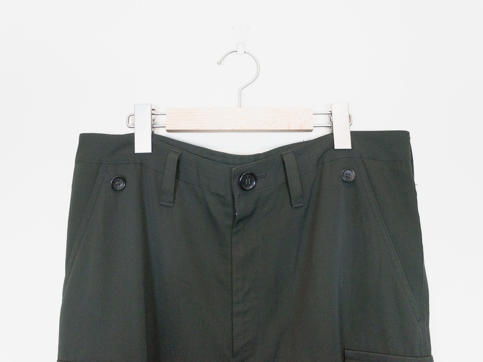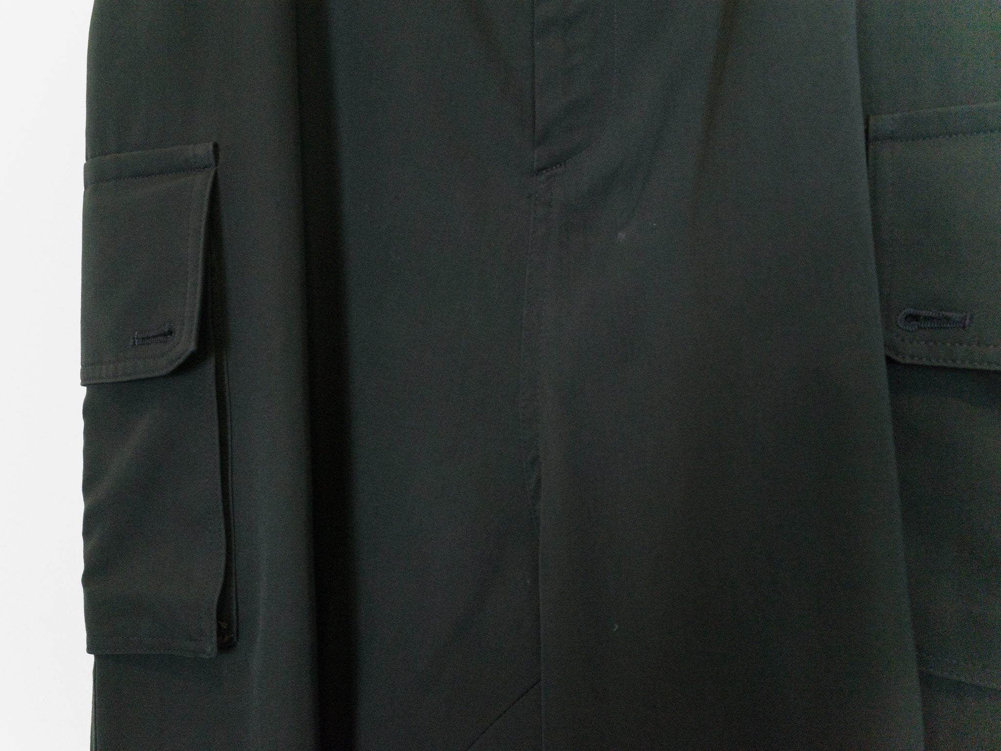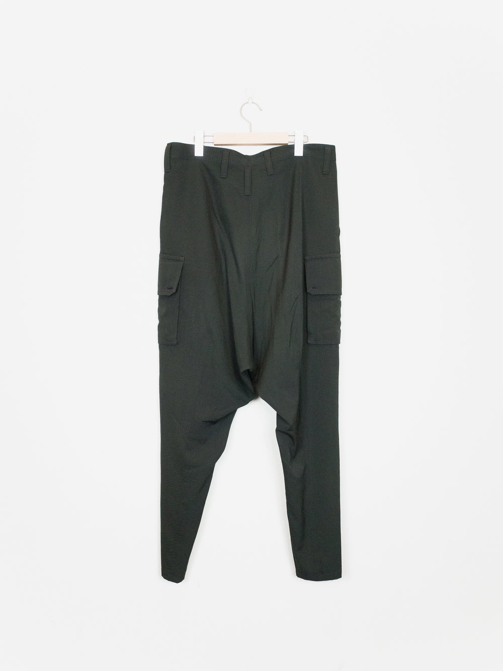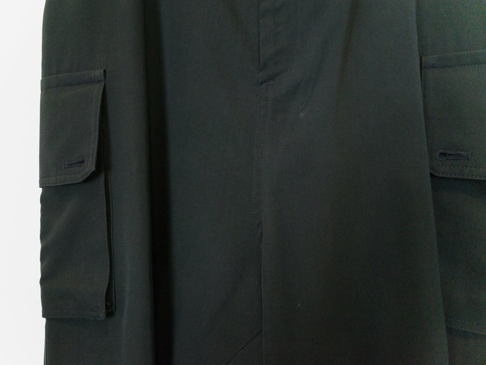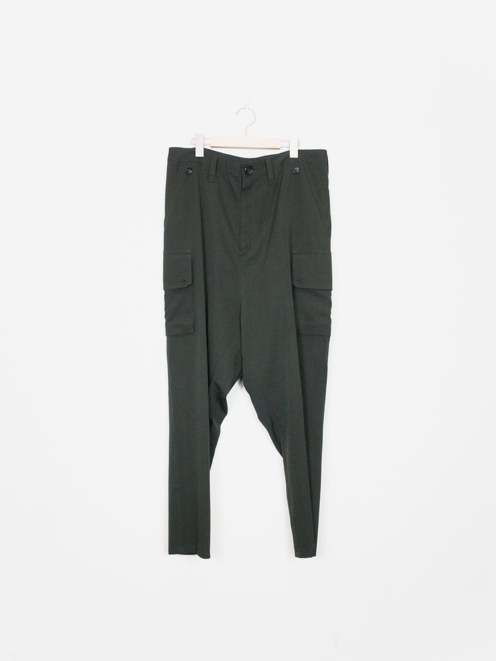 This pair of pants comes in an extremely rare olive wool gabardine (a very uncharacteristic color for this material), and is cut with a low crotch, tapered hems, and in general a very forward thinking silhouette. They're perfect for those with a wardrobe consisting of amore refined military styling since it's done in a material with amazing drape and great color depth. They feature removable suspenders, button flap closed cargo pockets that are secured at the bottom with sewn snaps, zipper fly, two slash waist pockets, and two button-closed back pockets.