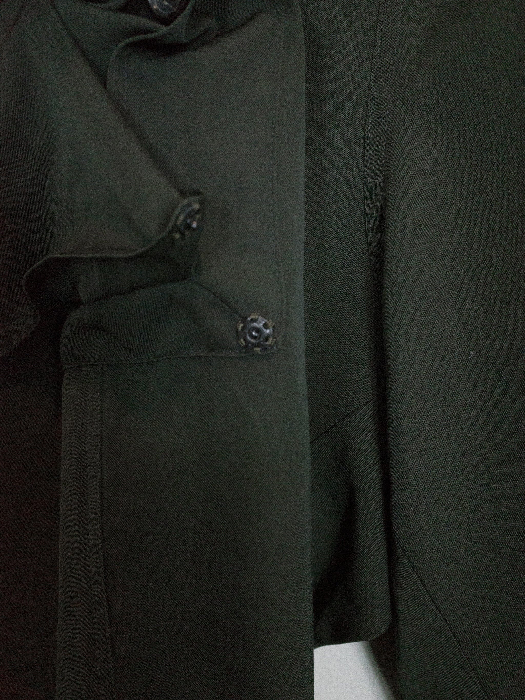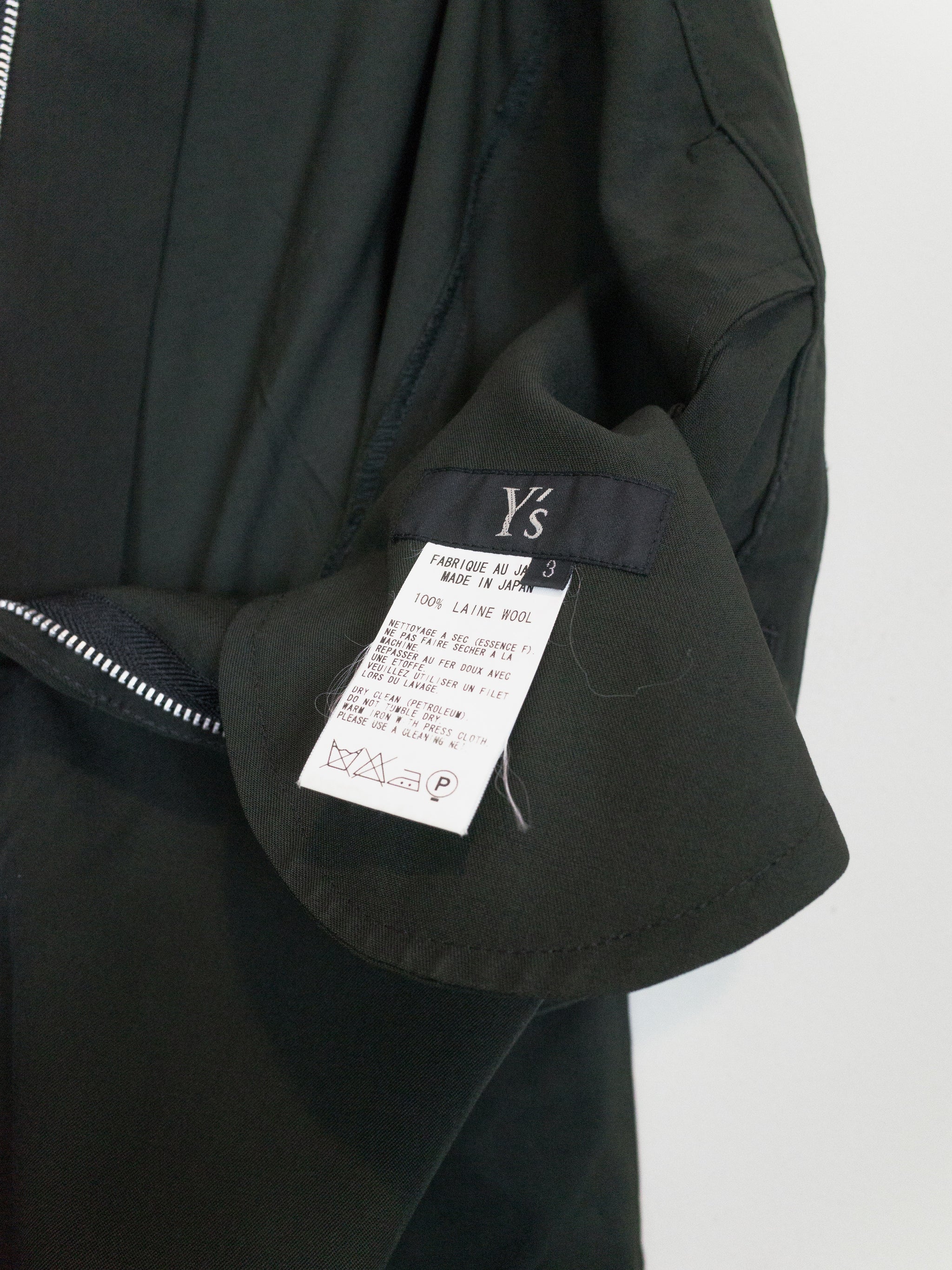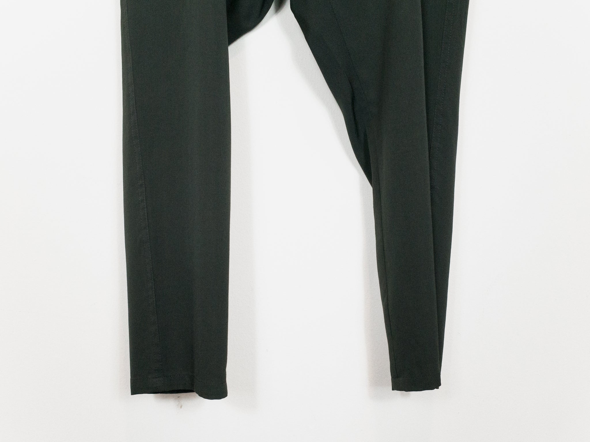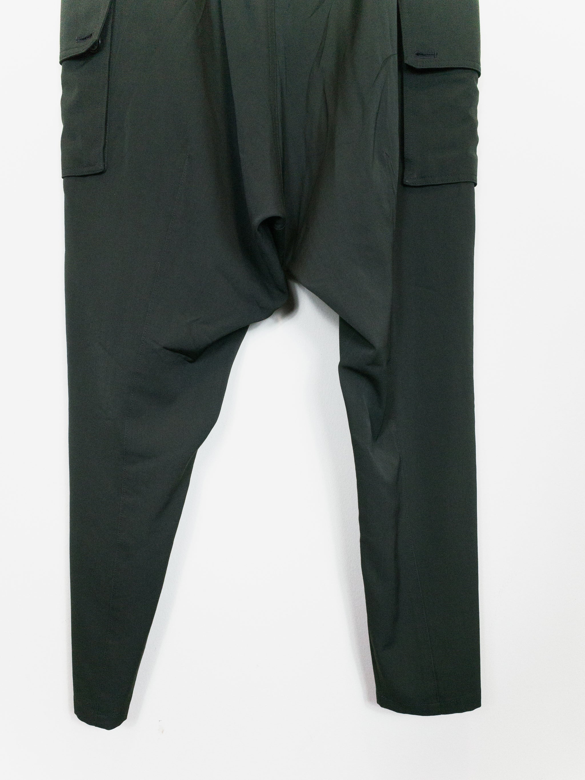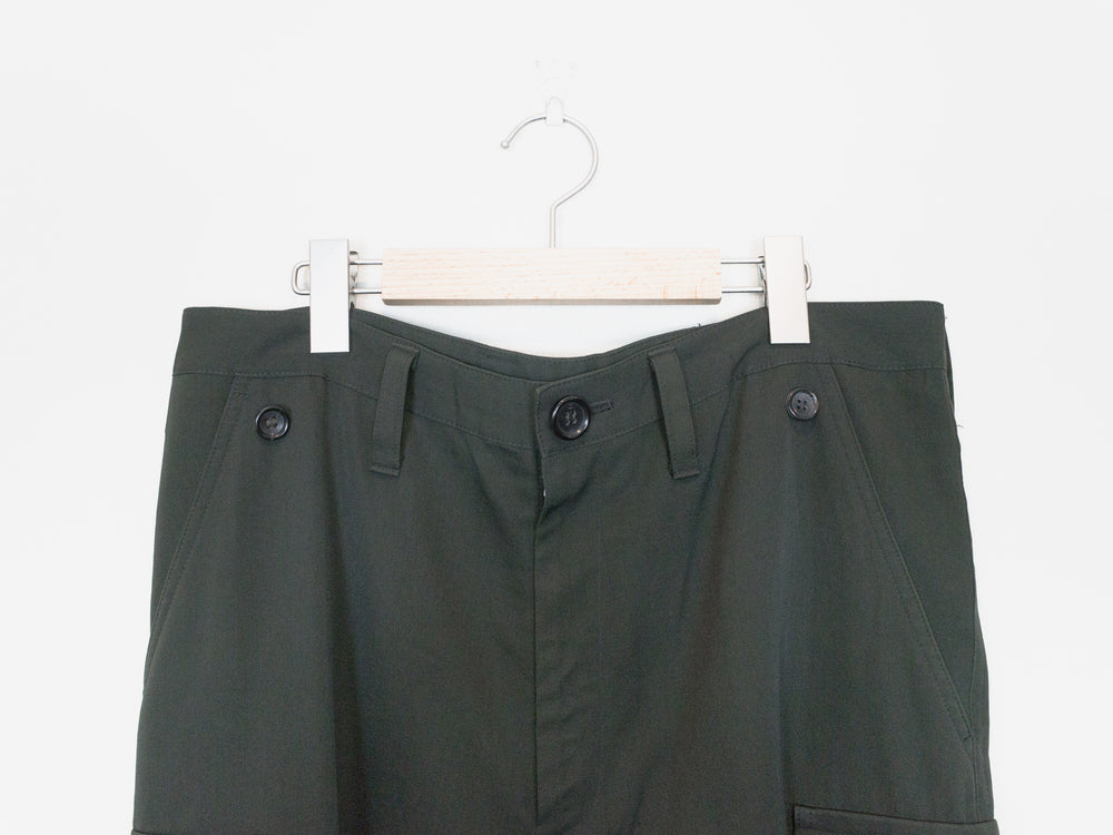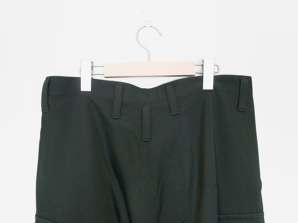 This pair of pants comes in an extremely rare olive wool gabardine (a very uncharacteristic color for this material), and is cut with a low crotch, tapered hems, and in general a very forward thinking silhouette. They're perfect for those with a wardrobe consisting of amore refined military styling since it's done in a material with amazing drape and great color depth. They feature removable suspenders, button flap closed cargo pockets that are secured at the bottom with sewn snaps, zipper fly, two slash waist pockets, and two button-closed back pockets.