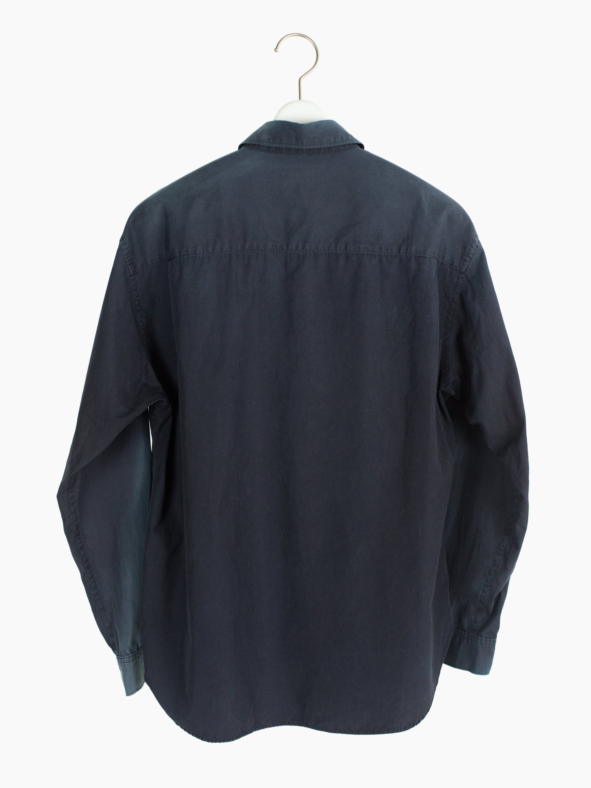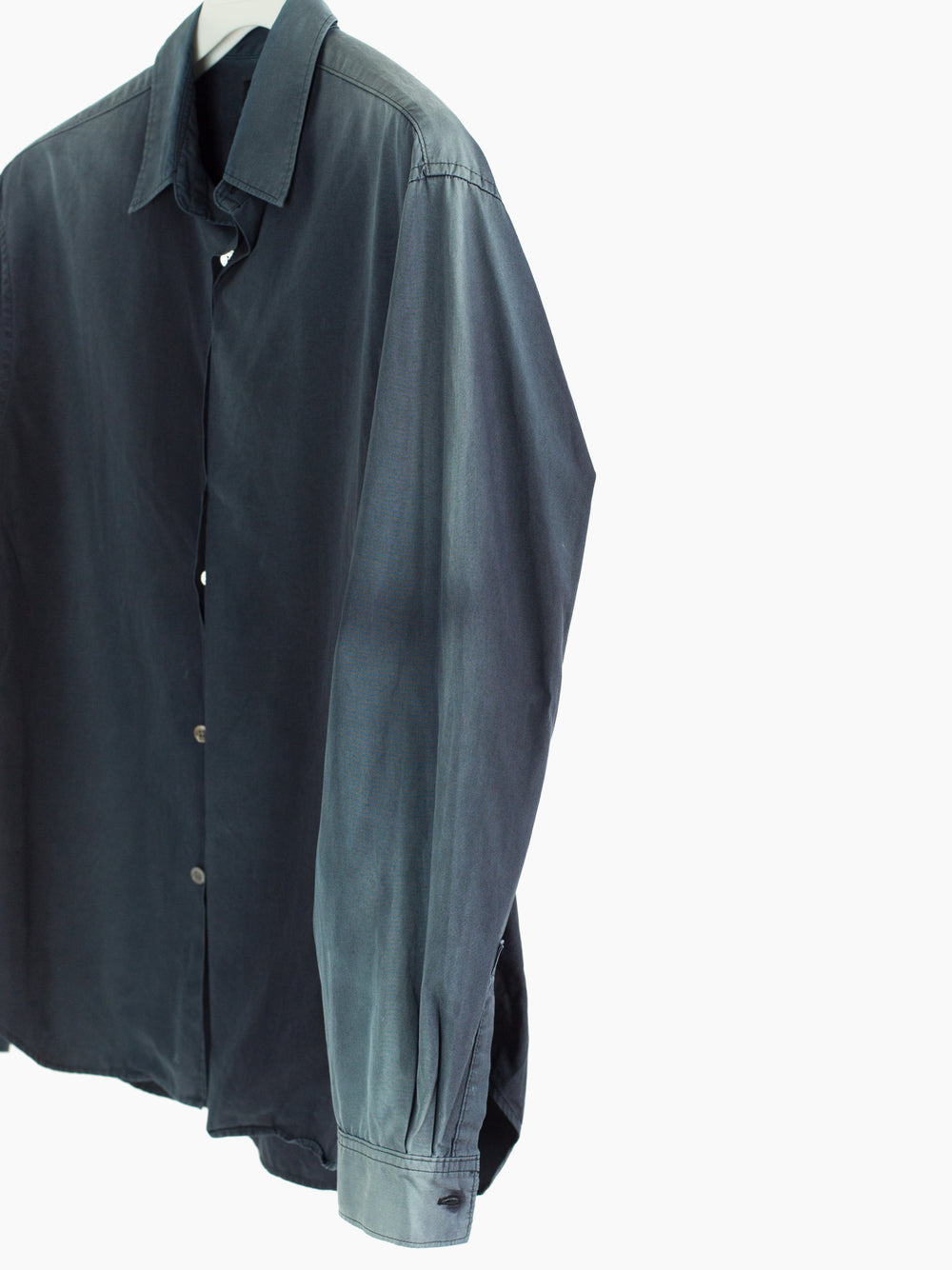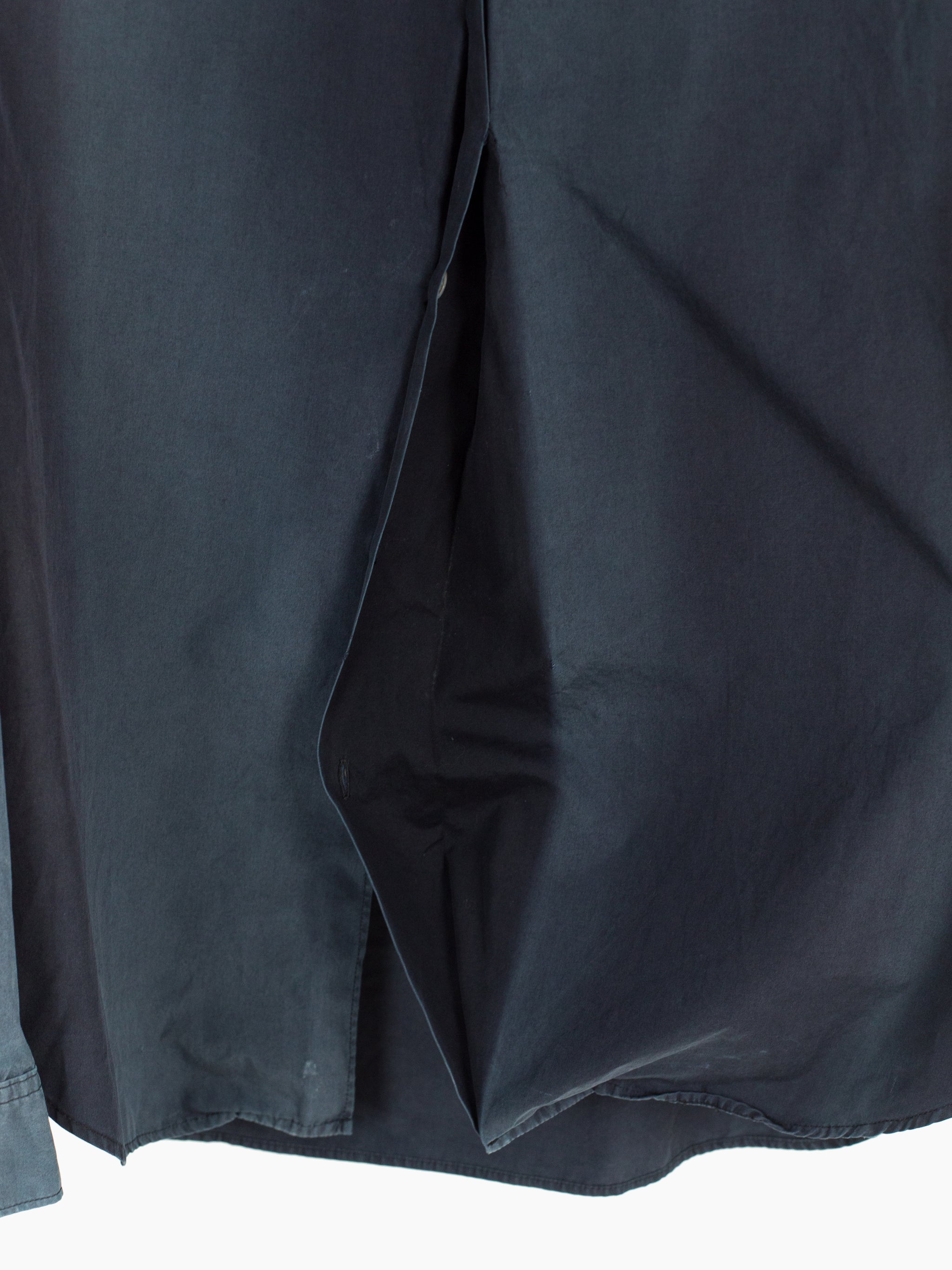 Plain black button down from Y's that shows the passage of time on its surface through a soft, sun-faded effect. Dark black has lightened and shows tones of navy, blue, green, and yellow, bringing a surprising richness and depth. The inwards-sewn one-piece hidden placket has come undone at parts, becoming a billowing pleat that also shows the effect of the sun-fading.