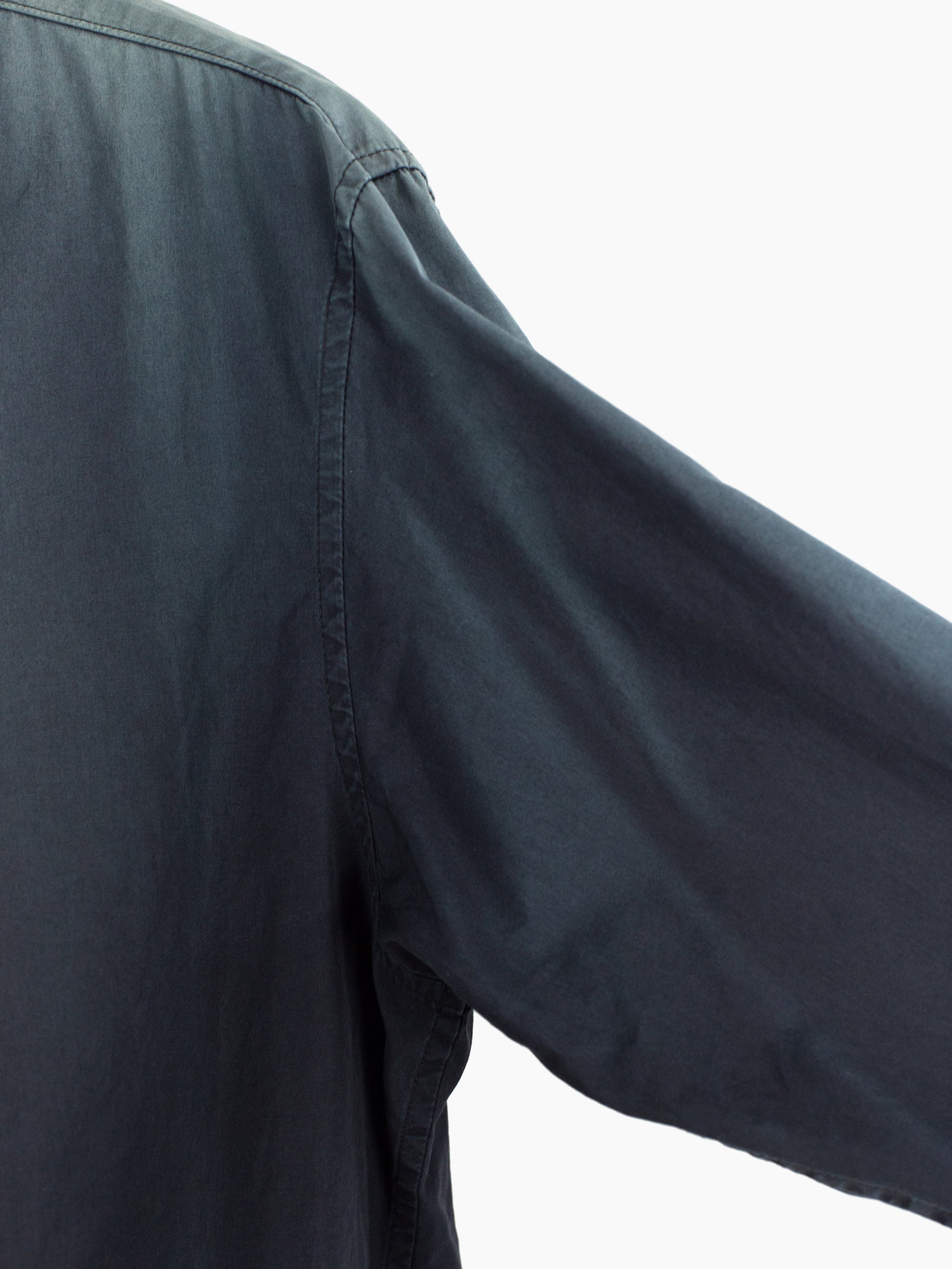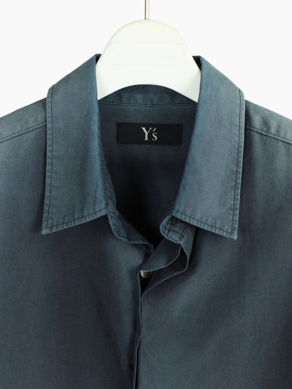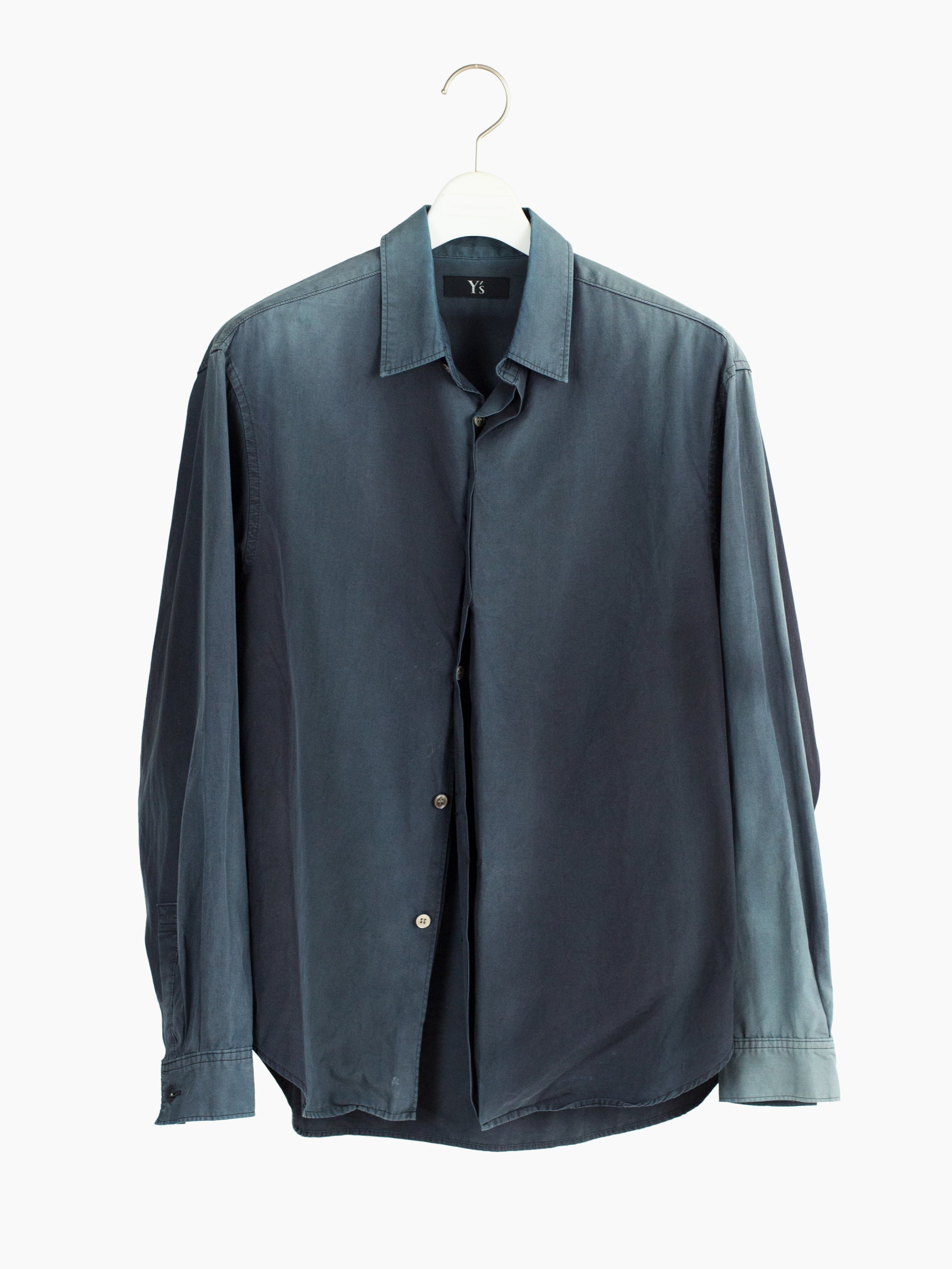 Plain black button down from Y's that shows the passage of time on its surface through a soft, sun-faded effect. Dark black has lightened and shows tones of navy, blue, green, and yellow, bringing a surprising richness and depth. The inwards-sewn one-piece hidden placket has come undone at parts, becoming a billowing pleat that also shows the effect of the sun-fading.