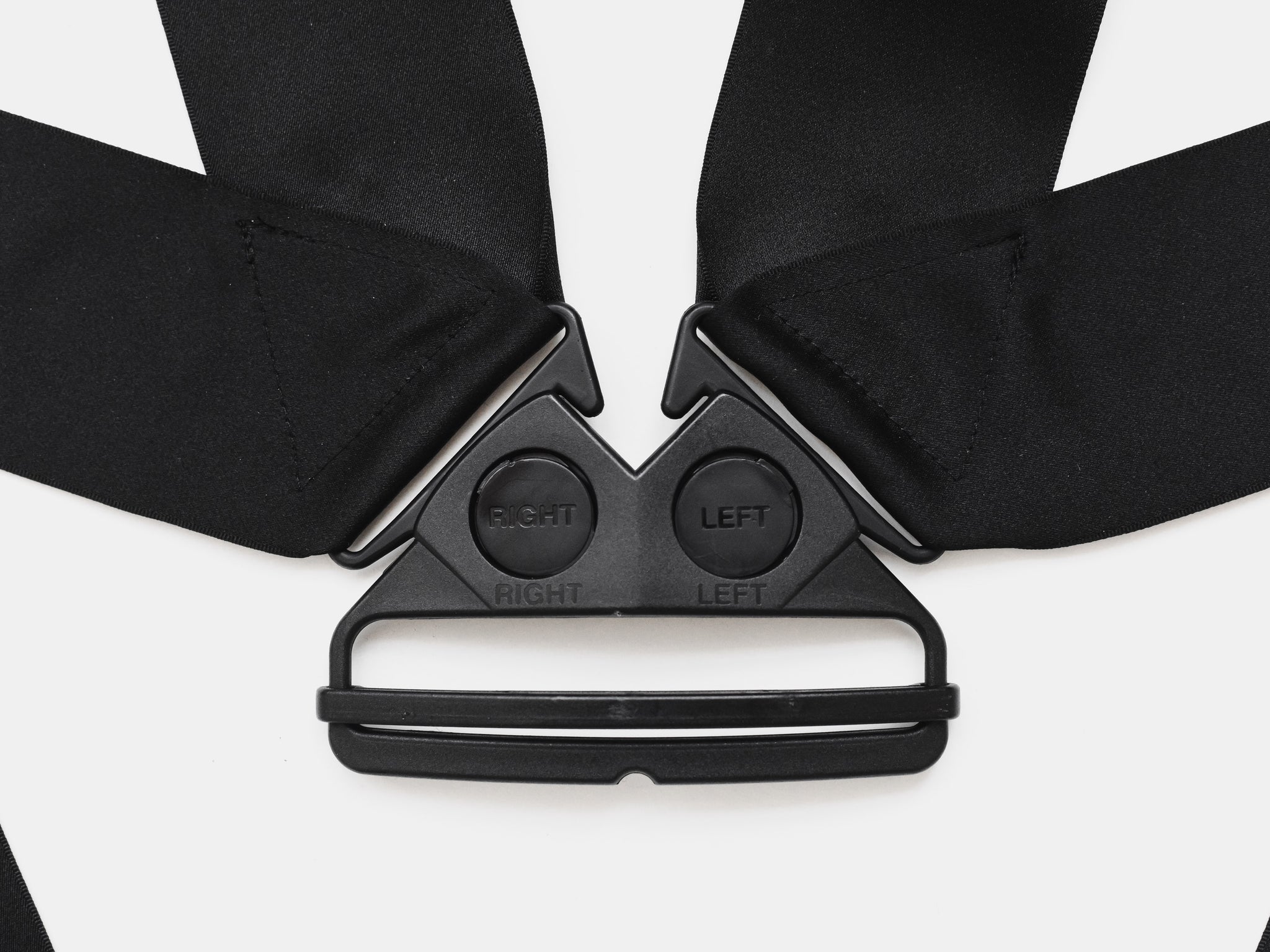 The original harness unfortunately never made it to production due to the extremely limited quantity of the third-party hardware used. Instead, the production version used a narrow cotton strap with a more generic 4-way plastic buckle, losing the rigidity and robustness of the original military-inspired look. The runway version however utilized a proprietary and highly secure buckle. Despite being plastic, the design included redundancies which ensured its original critical life-saving purpose.