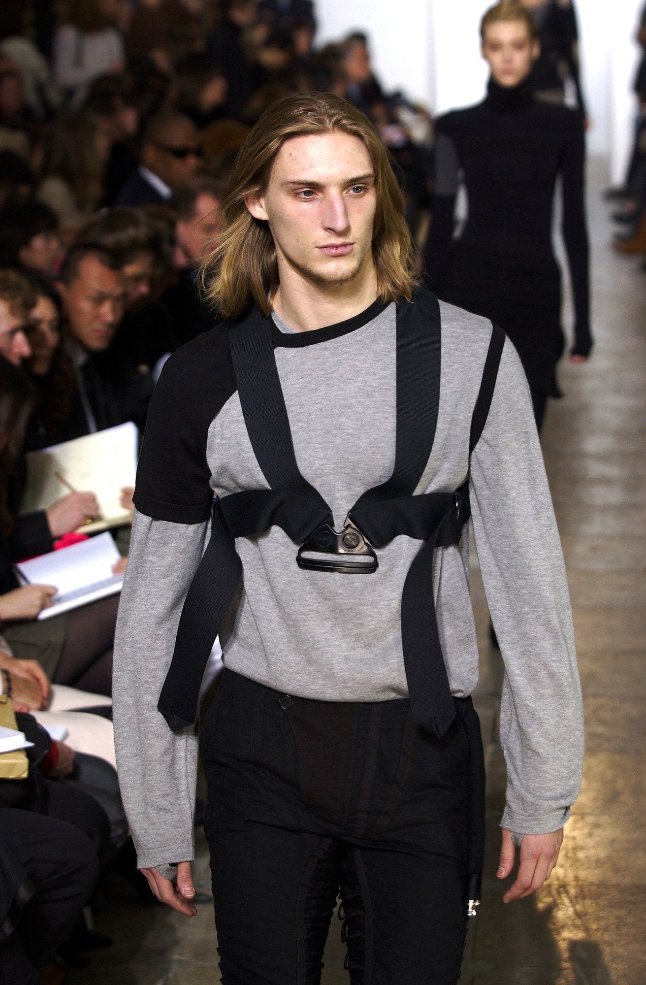 Helmut Lang AW03 masterfully showcased visually charged renditions of military inspirations and bondage by reframing overt references like aviator suit corset lacing and safety belt style harnesses while maintaining complete cohesiveness with his perfect tailoring, paving the way for contemporary fashion.