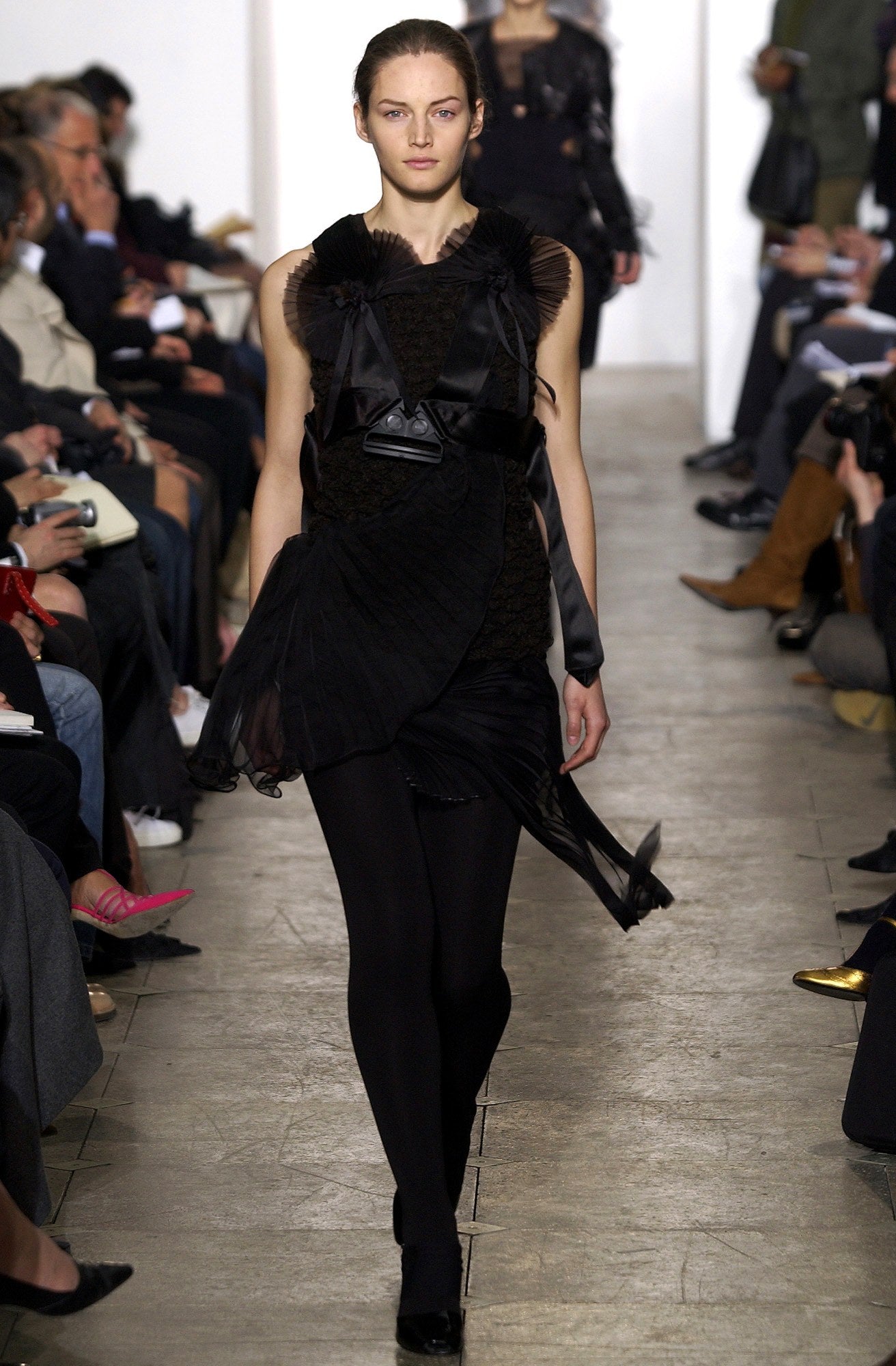 One of the most iconic and prevalent motifs of the season is the parachute style harness. Composed of strap webbing with a buckle and sliders, the accessory itself is physically rather unassuming, yet it perfectly encapsulates AW03’s aviator themes and references to BDSM culture with Seditionaries styling. Moreover, its wide use in various looks in the runway established it as an extremely versatile accessory, worn over knits, silk dresses, and under suits.